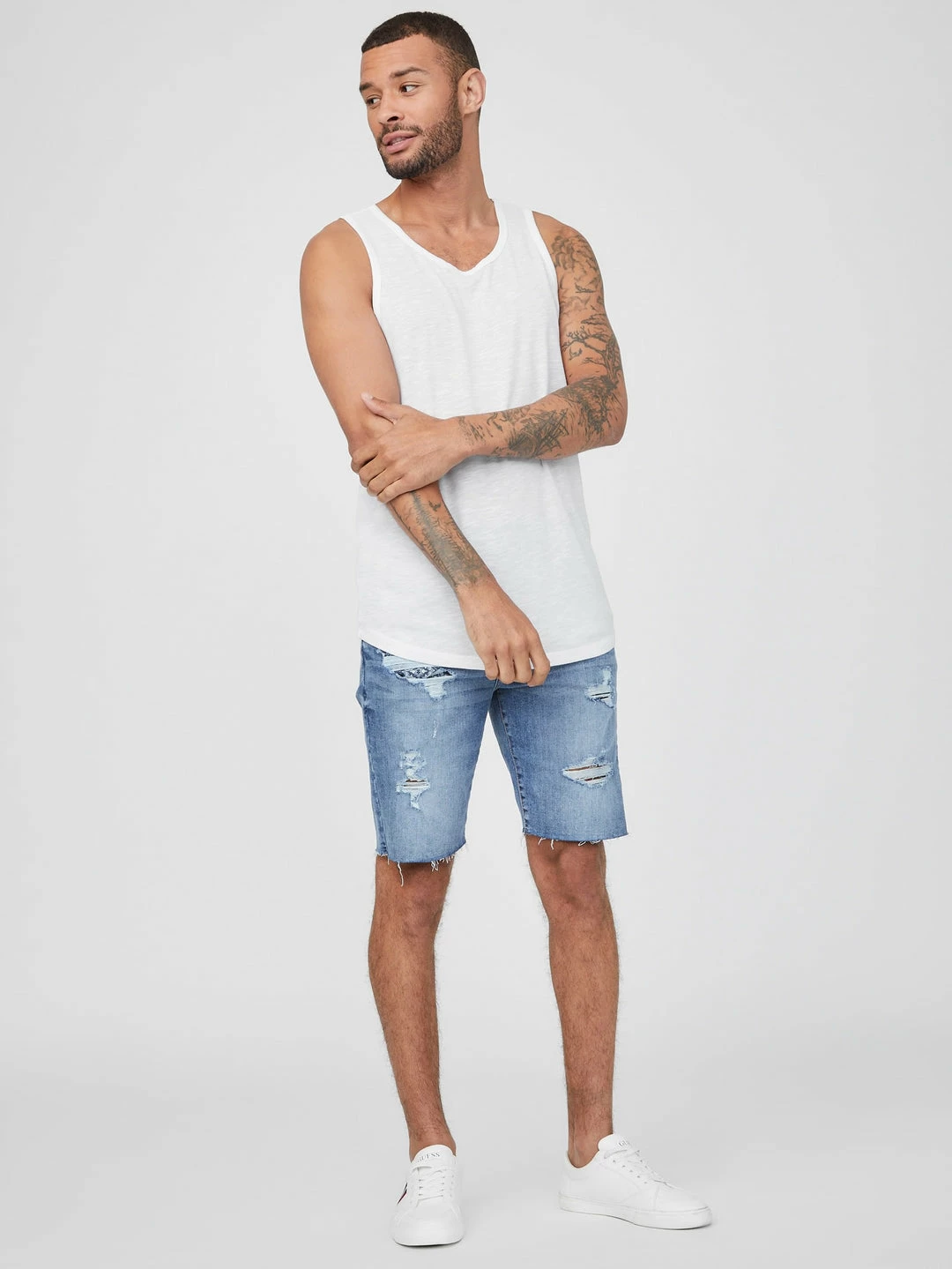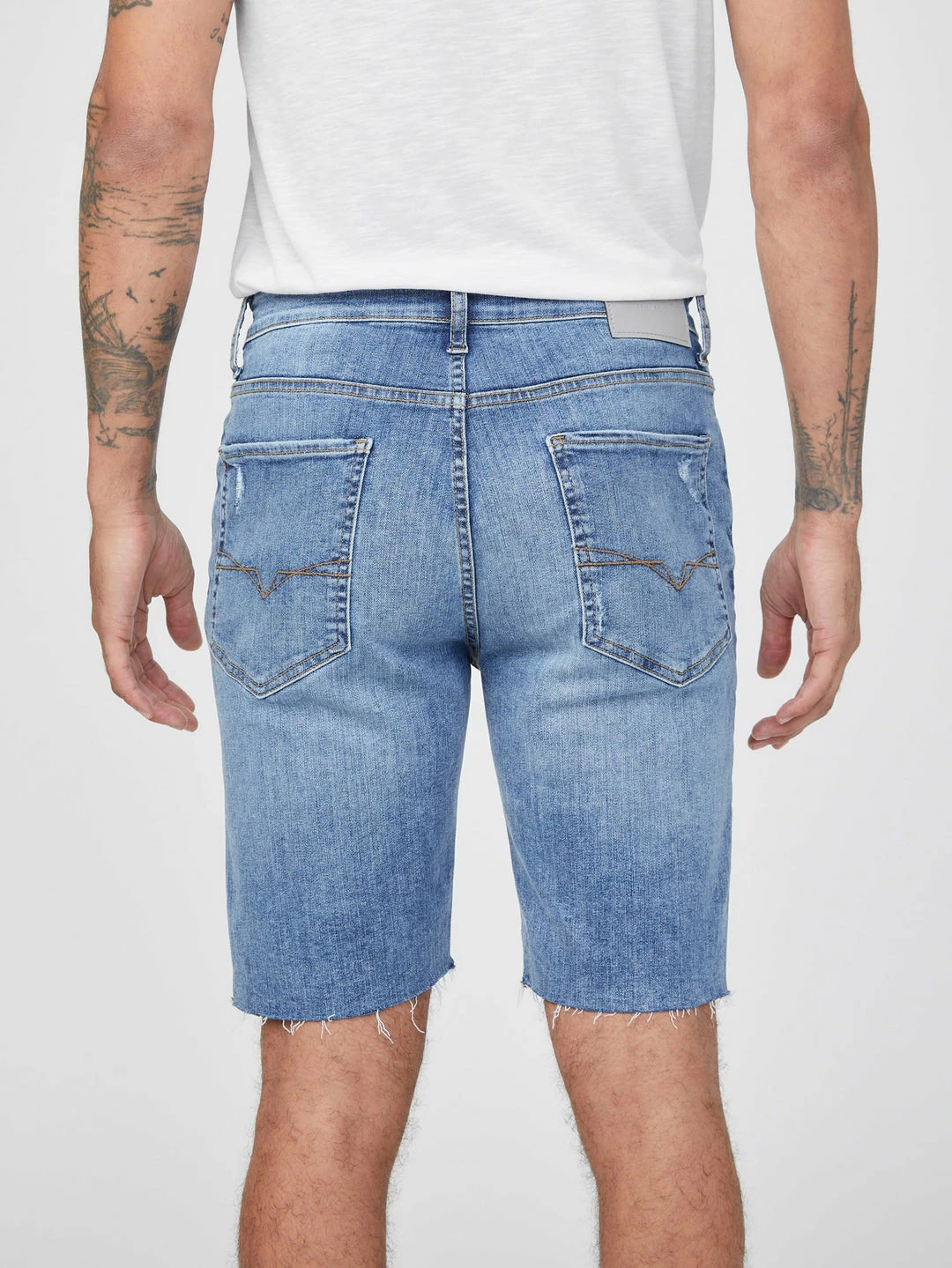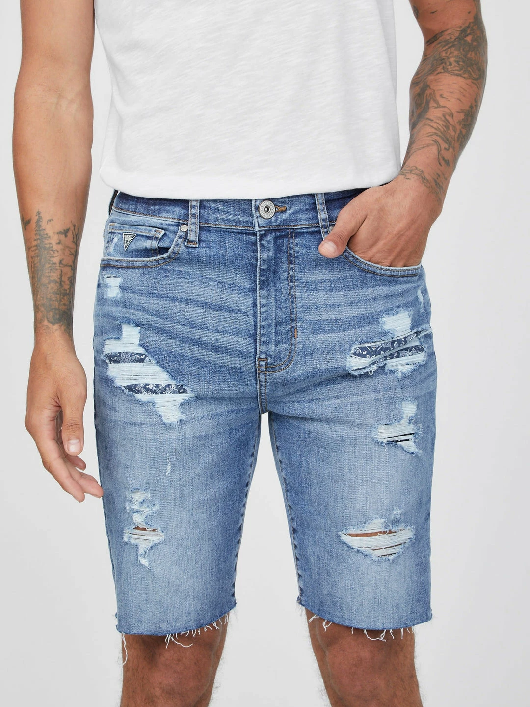 Classic blue denim shorts featuring distressed detailing and a five-pocket construction. Contains recycled cotton fibers.