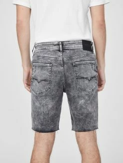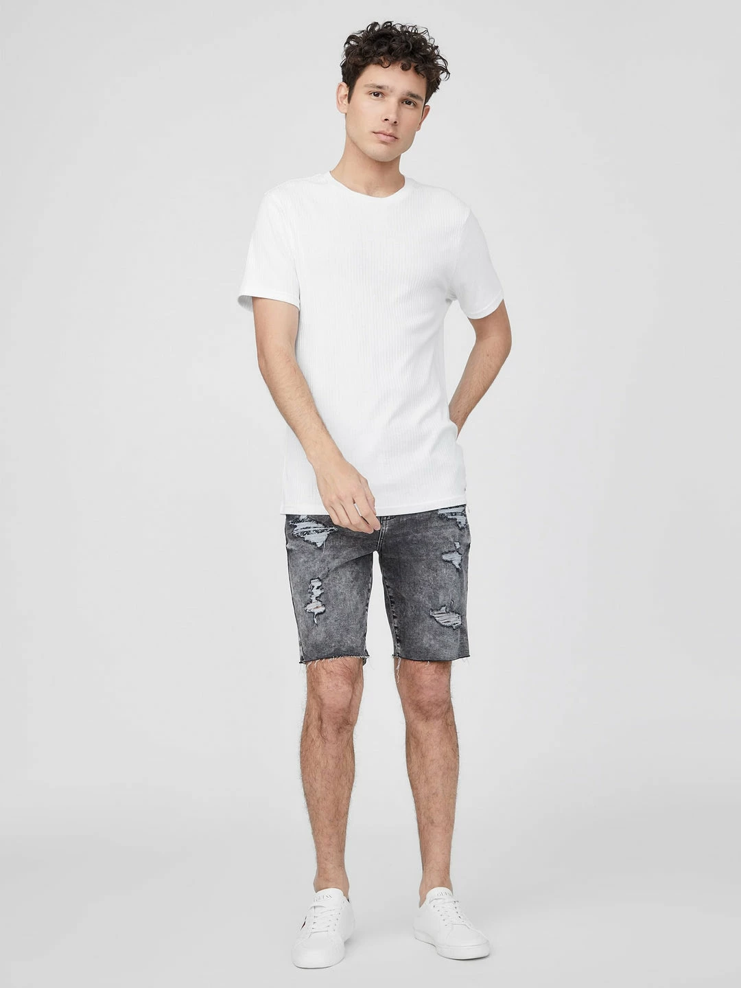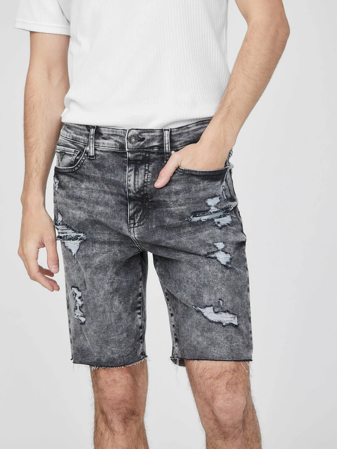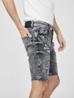 Denim shorts featuring distressed detailing and a five-pocket construction. Contains recycled cotton fibers.