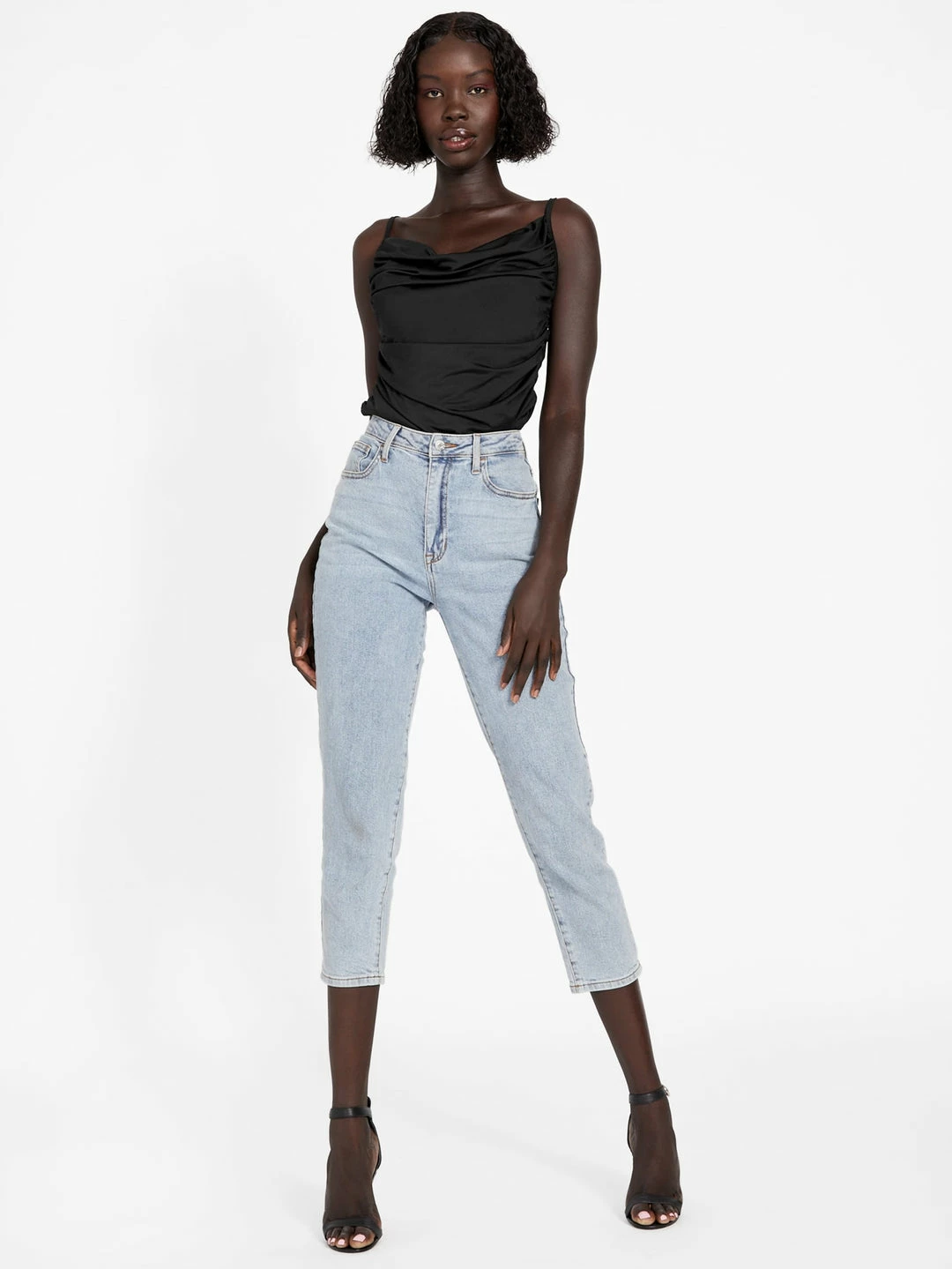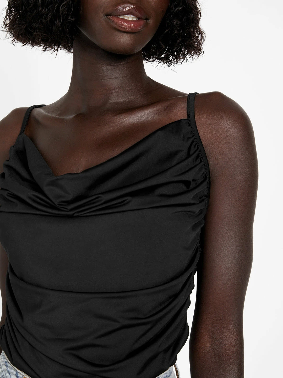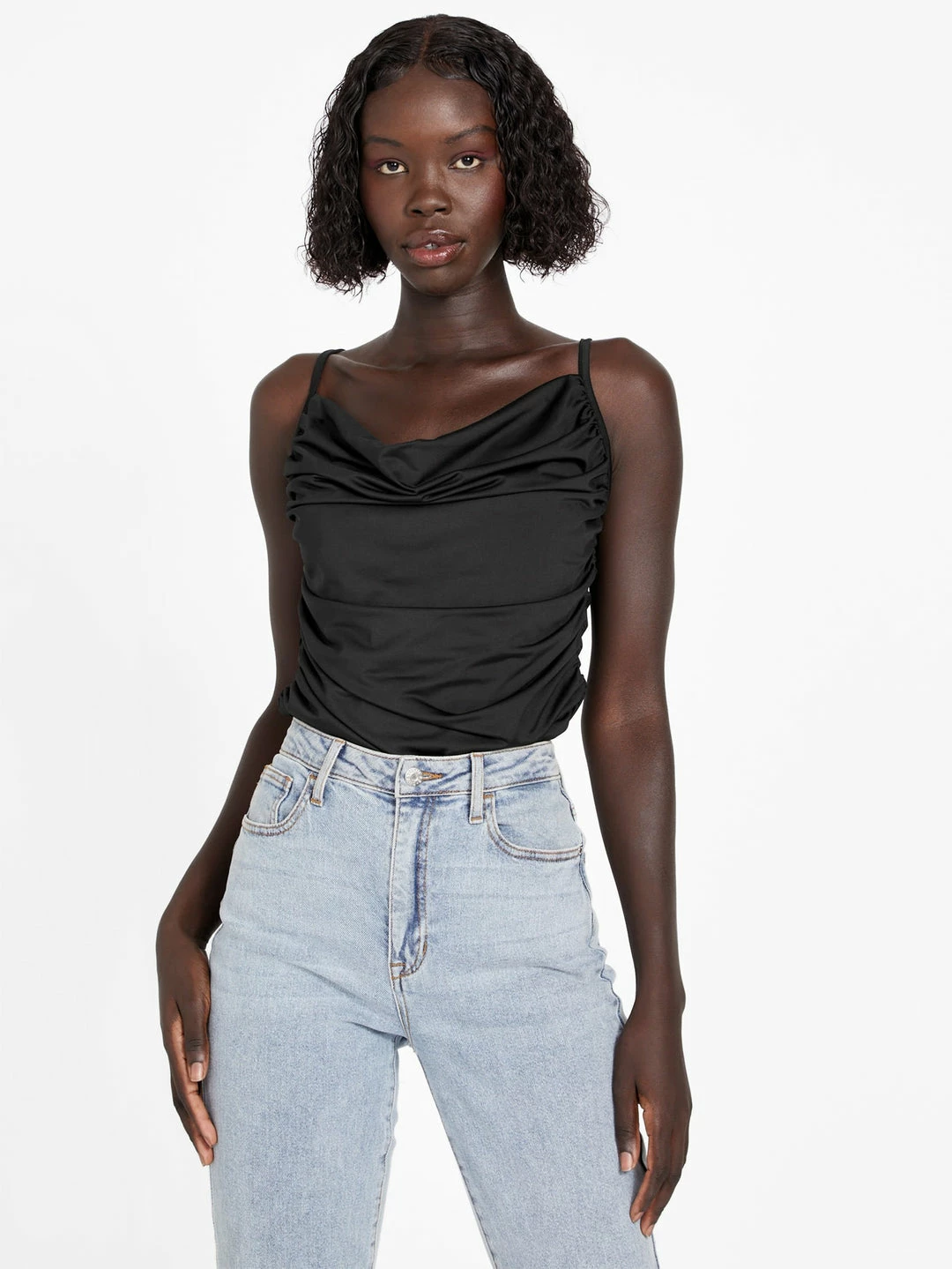 A sexy addition to any look, this slinky top features a cowl neckline, ruched detailing and adjustable straps. Made with recycled plastic.
