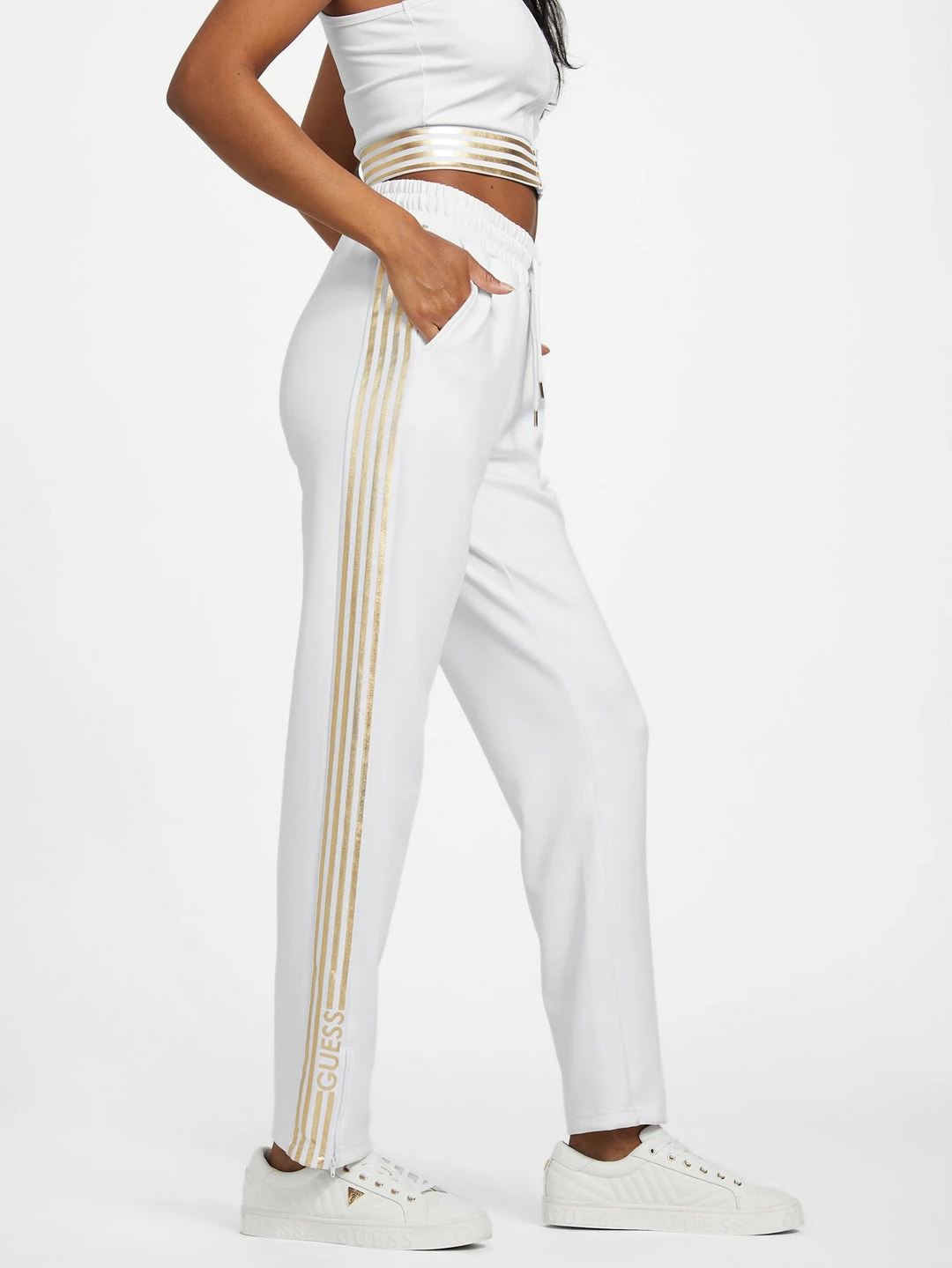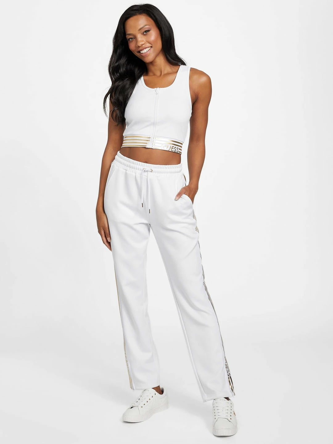 A classic active piece, this sleek pair of joggers is designed in a tricot knit fabrication and features an elastic waist with drawstrings, side slip pockets and striping down the straight-leg sides. Zips at the ankles. Contains recycled bottles.
