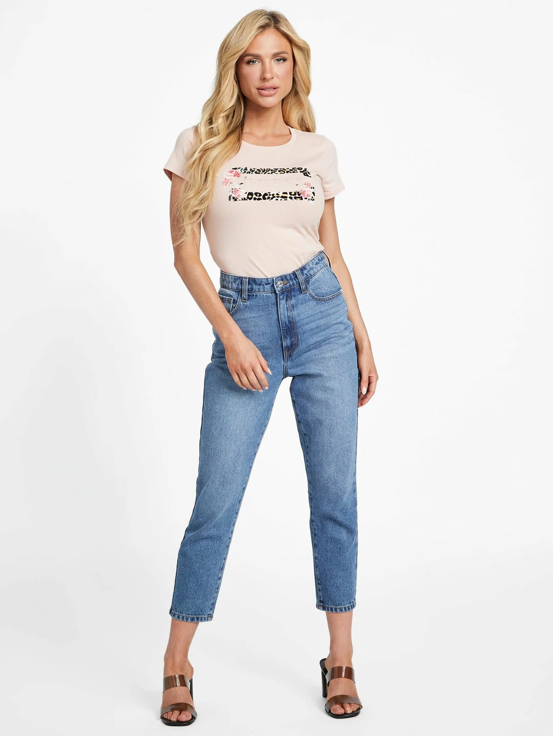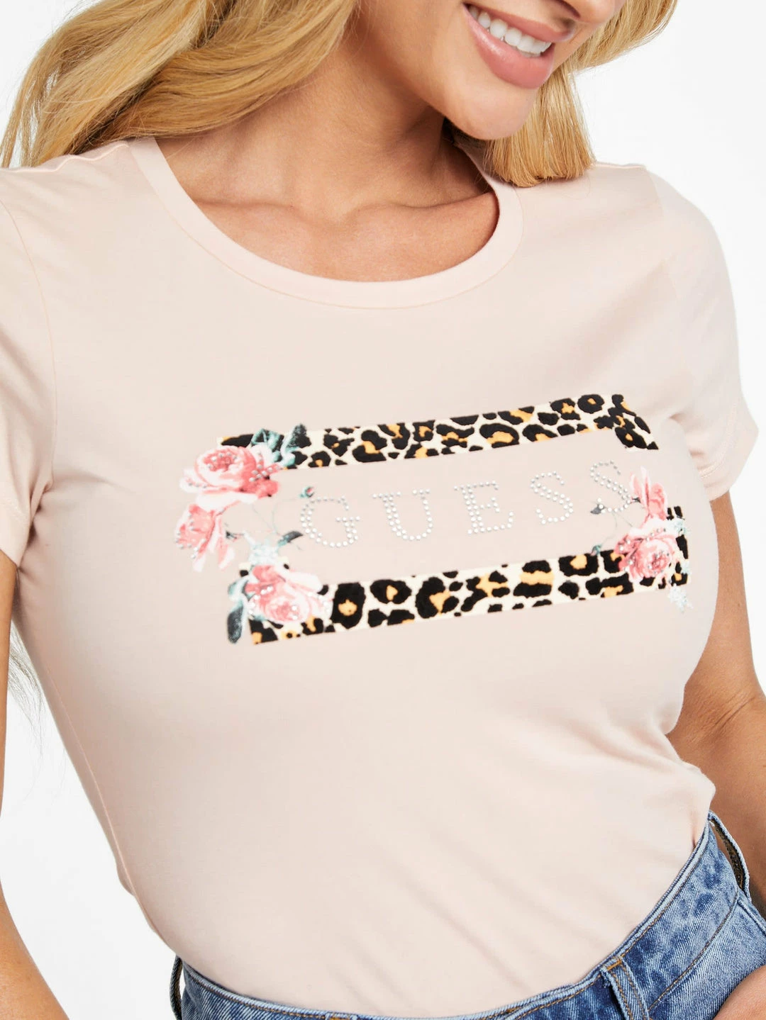 Wildly satisfying, this jersey tee features a rhinestone logo surrounded by a leopard and floral border, crew neckline and short sleeves. Organic cotton fiber.