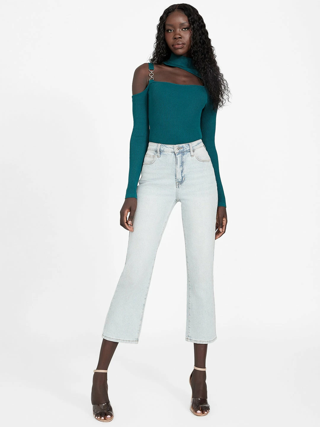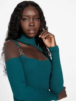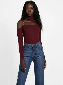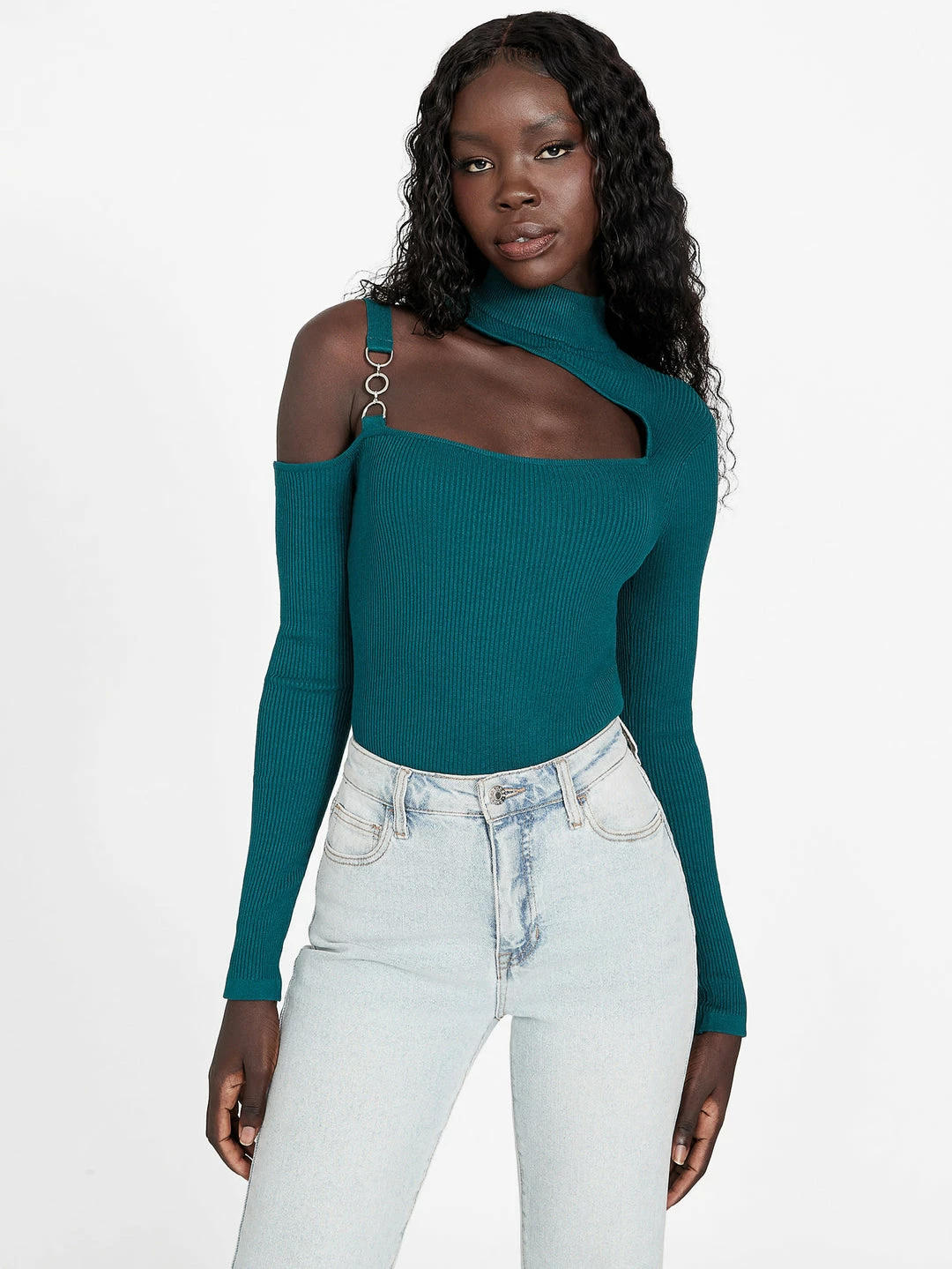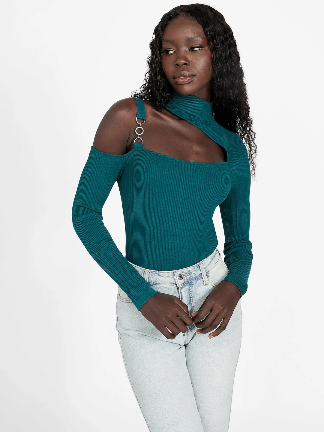 Show off your figure in this cutout top. Featuring allover ribbed fabrication, asymmetrical cutout design, silver-tone chain accent, turtleneck and long sleeves.