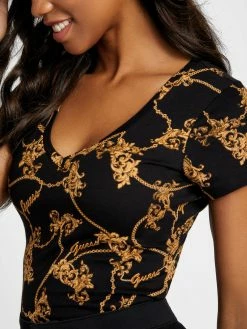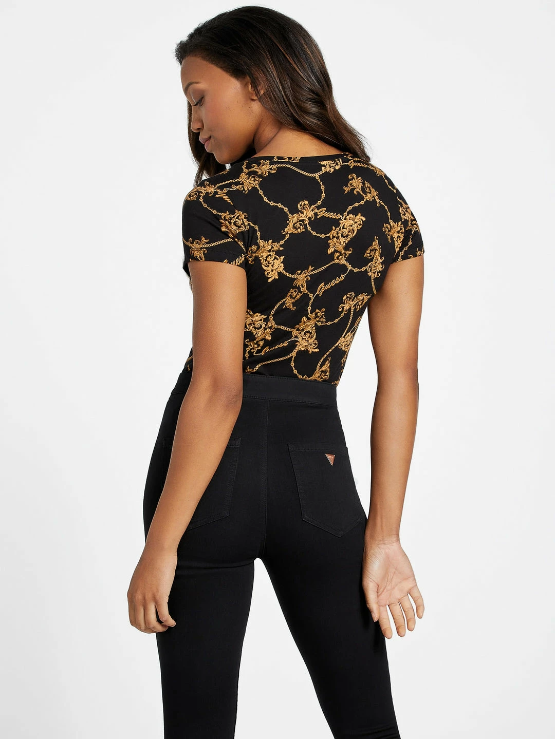 A staple statement style to reach for, this short-sleeve tee features a V-neck and allover baroque-inspired chain print mixed with script logo details.