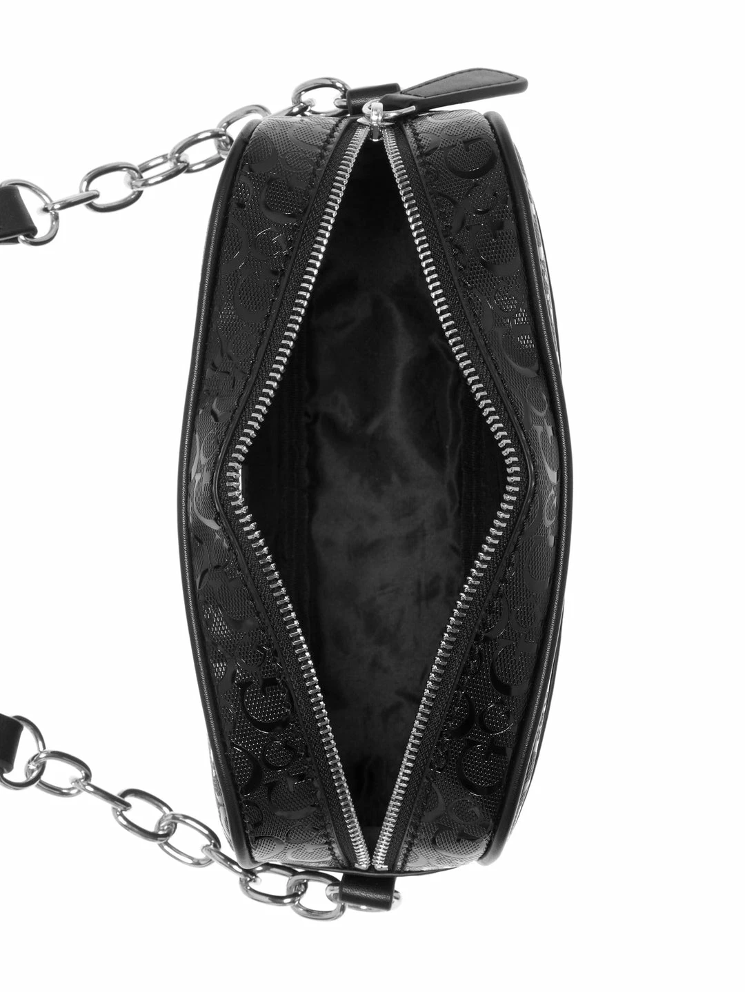 Dress up your look with this compact camera bag featuring sleek fabric paneling with a double logo coated canvas, contrasting faux-leather accents and trim. Designed with silver-tone logo hardware, mixed chain strap and top zip closure.