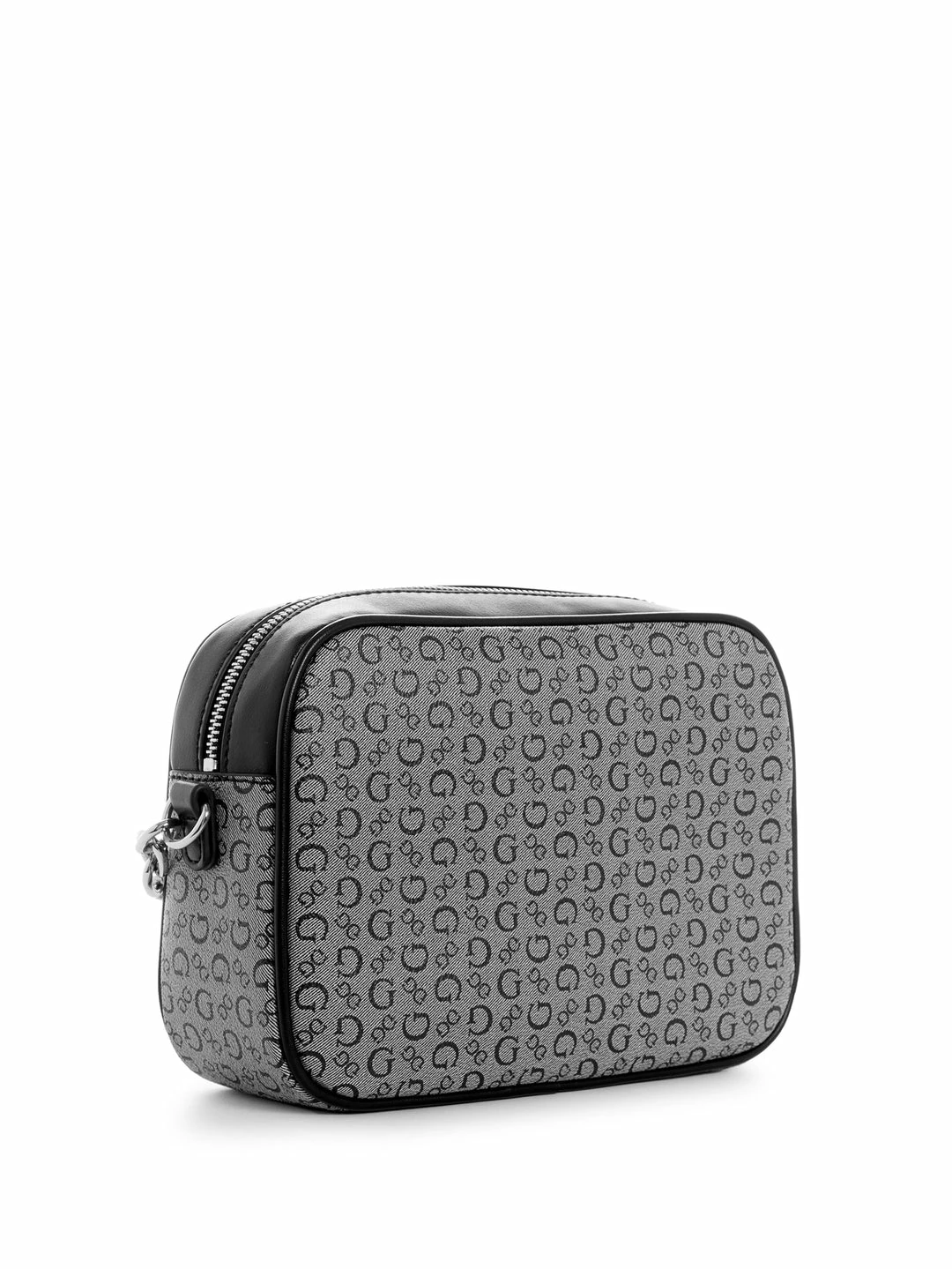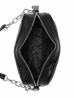 Dress up your look with this compact camera bag featuring sleek fabric paneling with a double logo coated canvas, contrasting faux-leather accents and trim. Designed with silver-tone logo hardware, mixed chain strap and top zip closure.