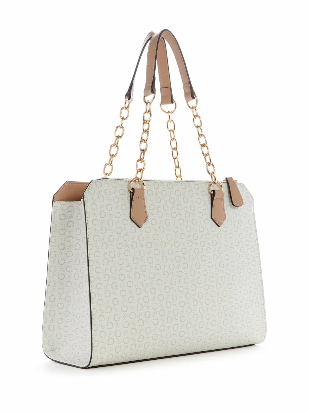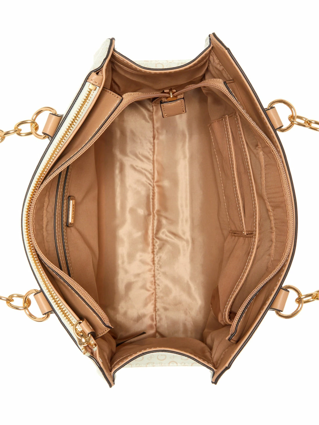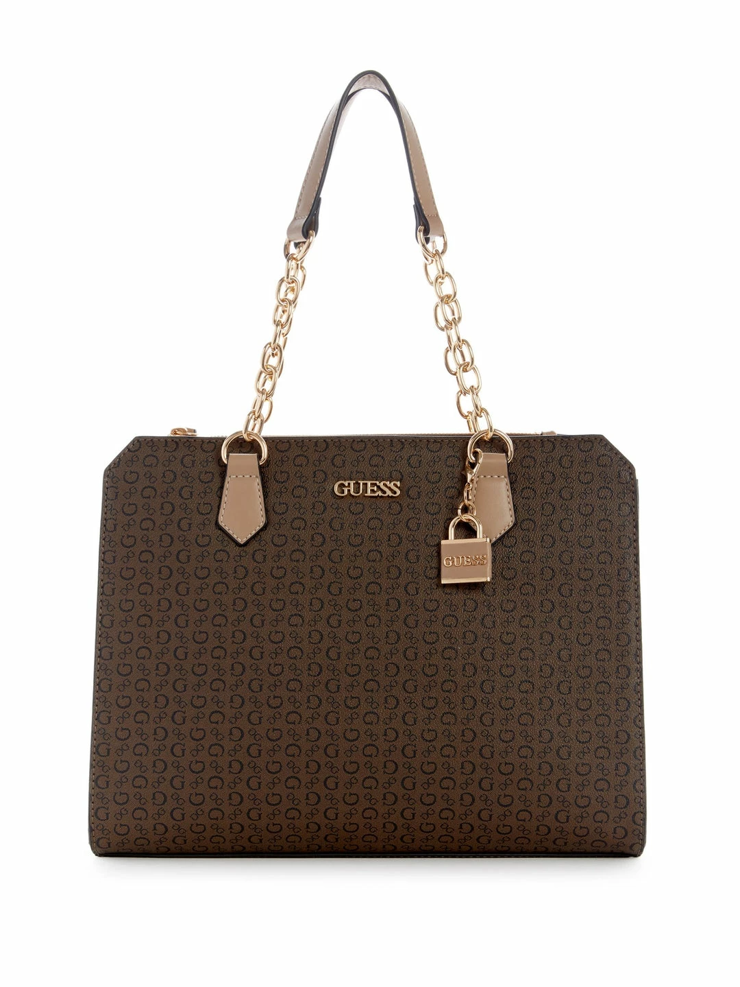 Grace them with your elegance in this satchel. Designed with a faux-leather fabrication, allover embossed logo, top handles mixed with chains, logo emblem and detachable keychain.