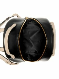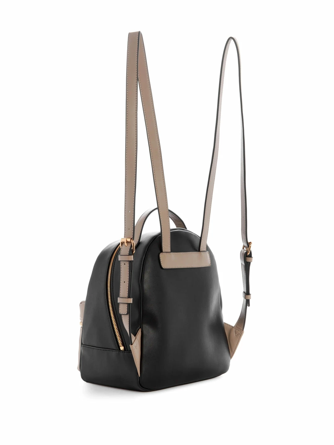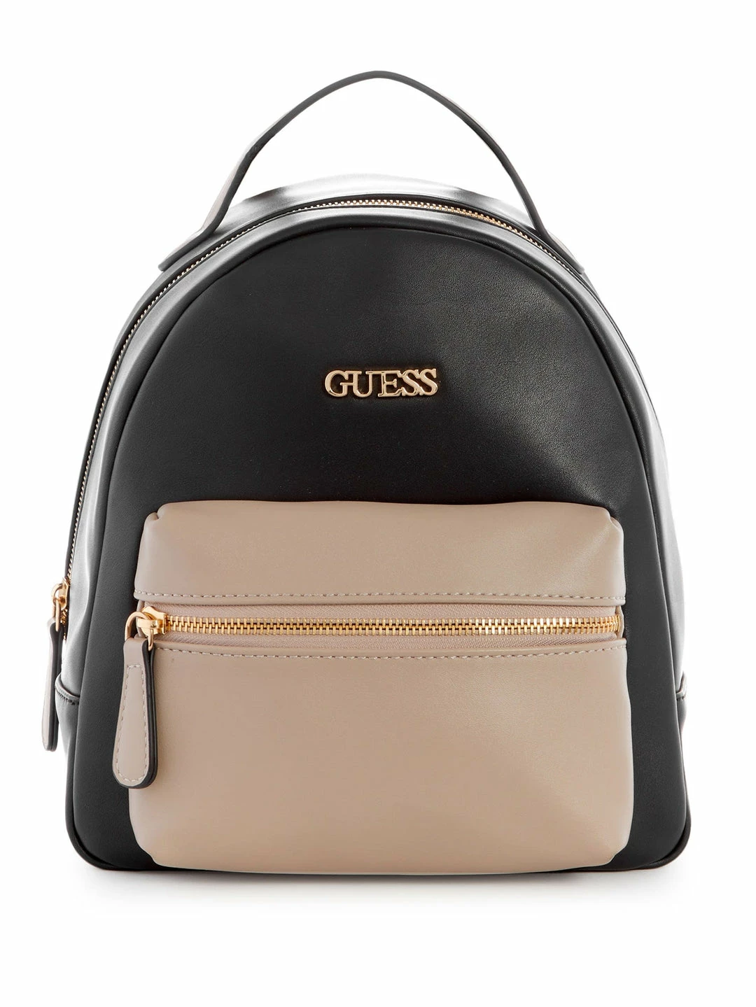 Stay chic in this essential backpack, featuring faux-leather with a color-block design, exterior zip pocket, gold-tone hardware, adjustable straps and logo emblem.