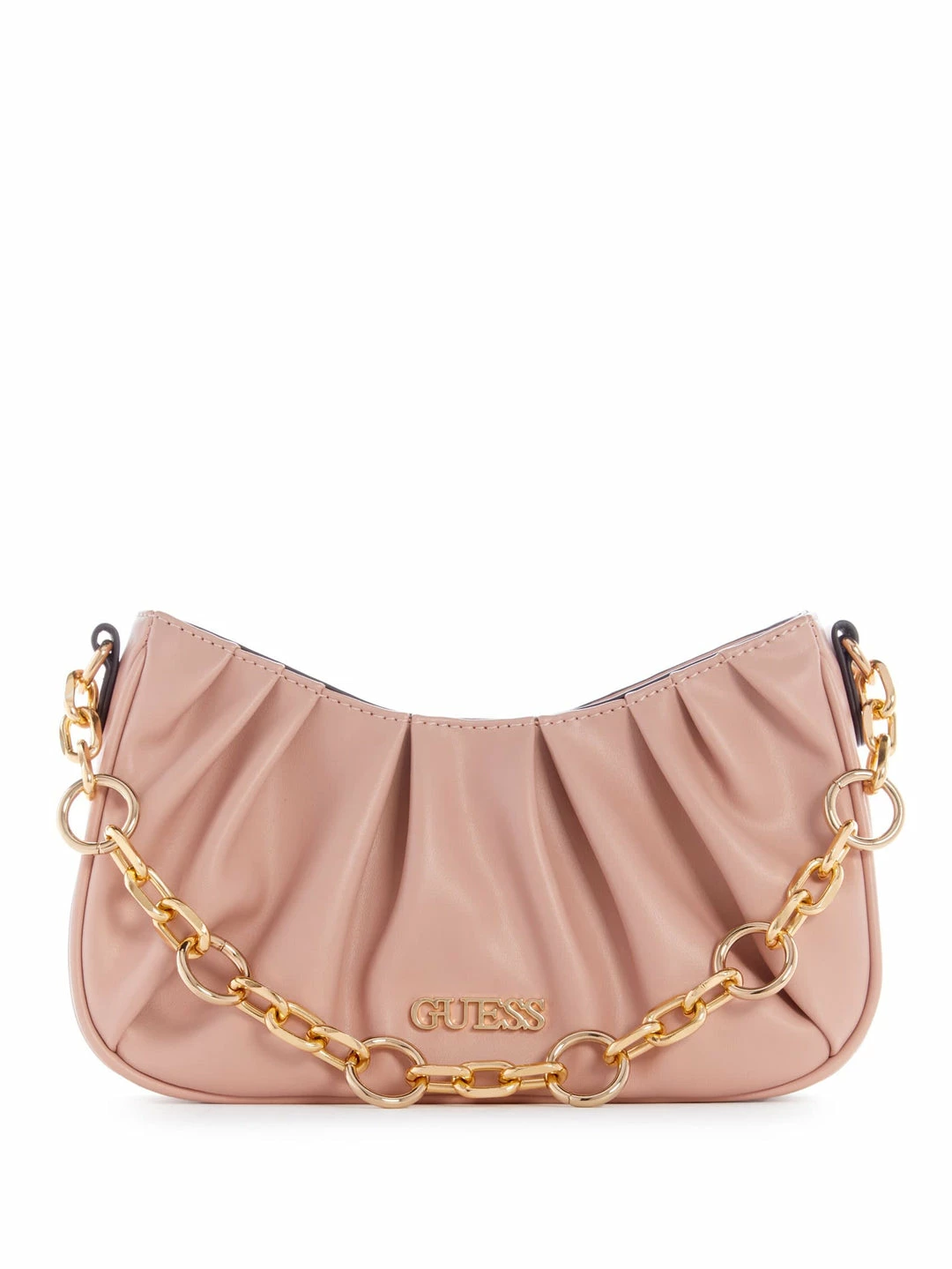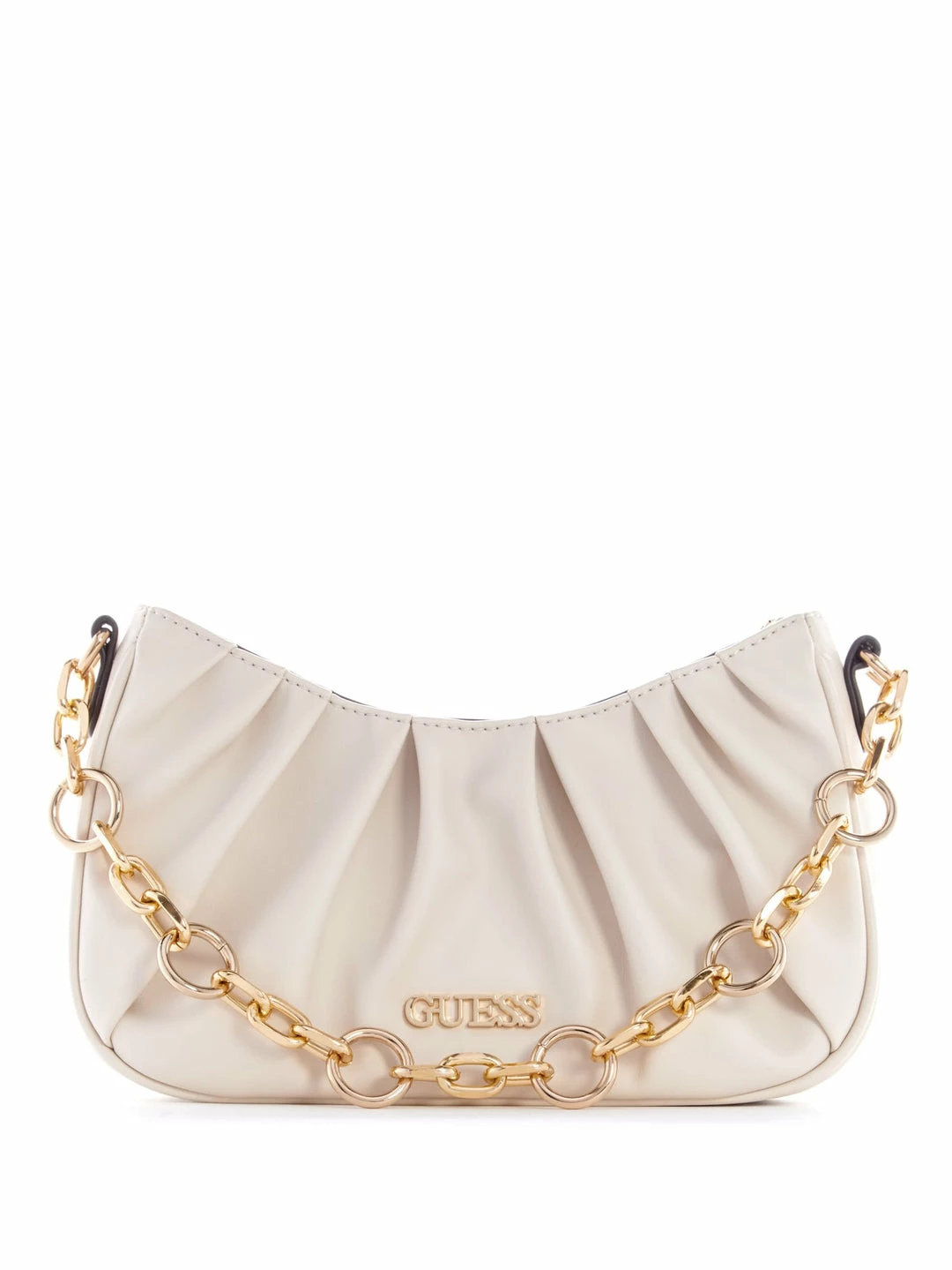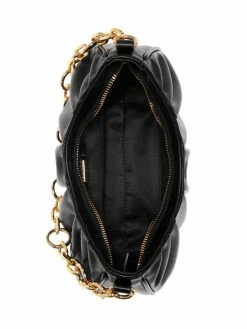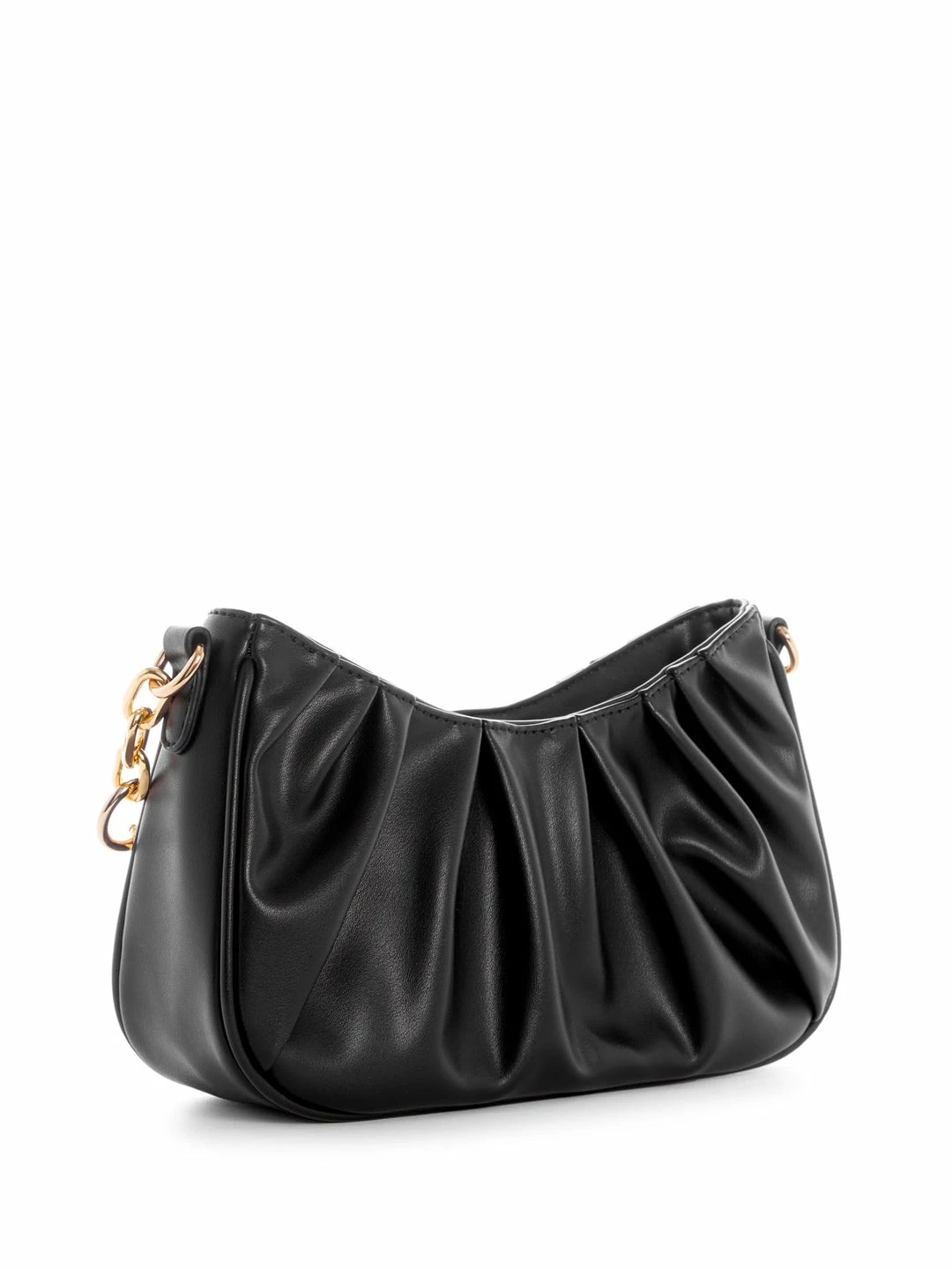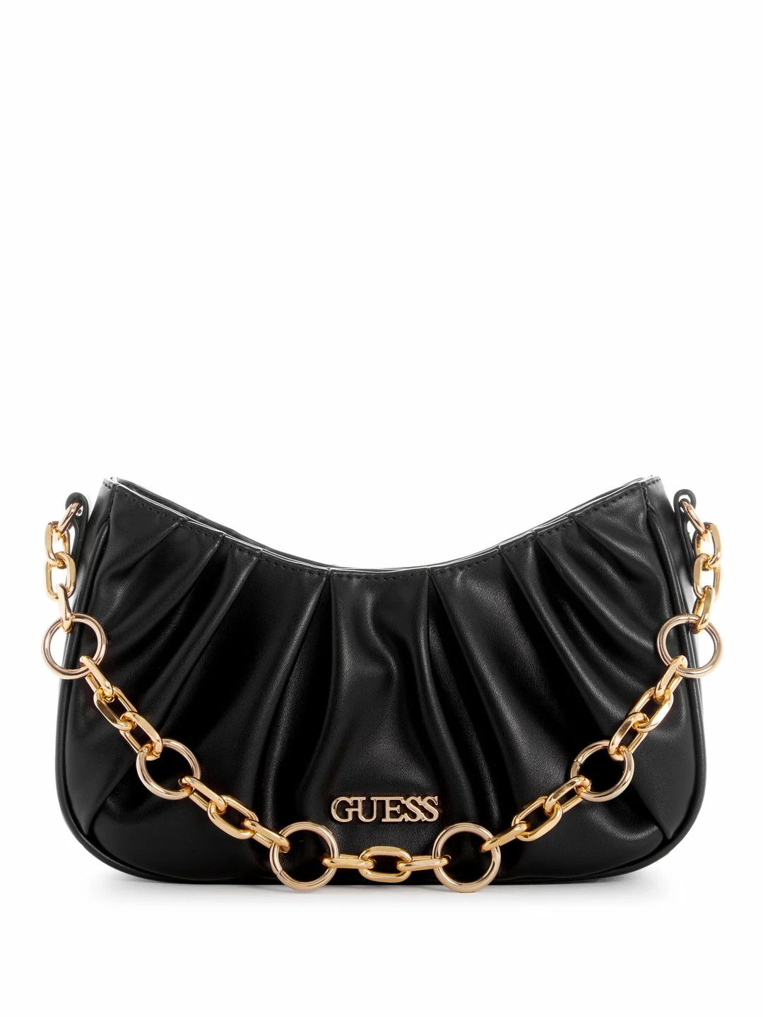 With an elegant ruched construction, this faux-leather shoulder bag features a gold-tone chain strap, logo emblem and zip closure.