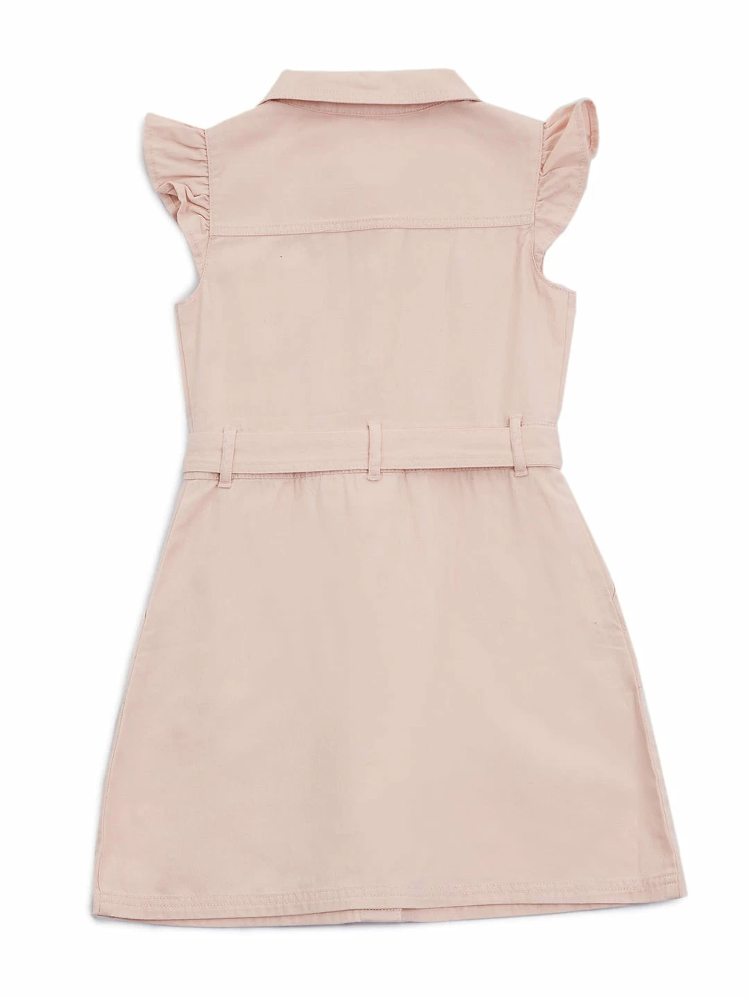 Ready for sunshine and good vibes, this sleeveless dress features an allover denim fabrication with fading, folded collar, dual slip pockets, belted waist, ruffled hem at the sleeve opening and button closures.