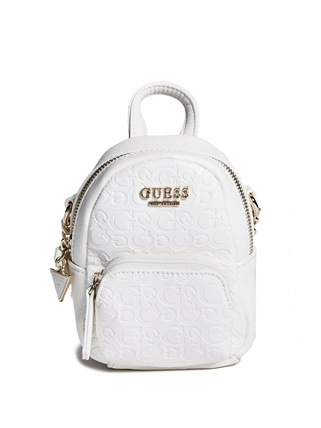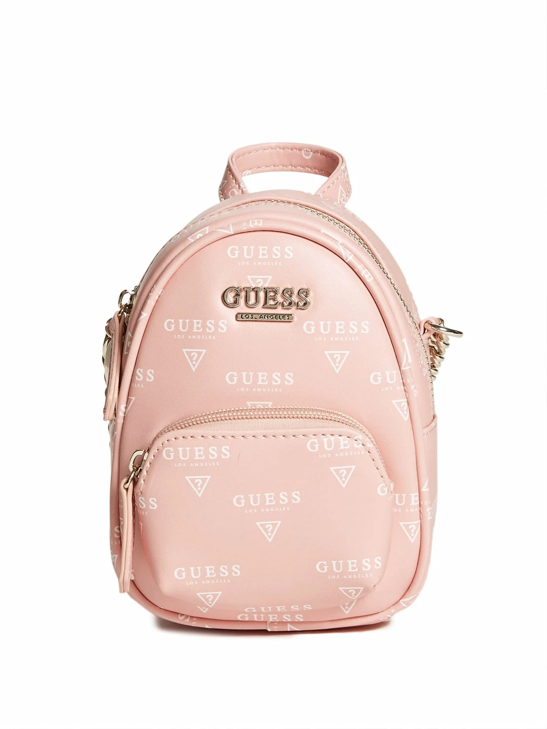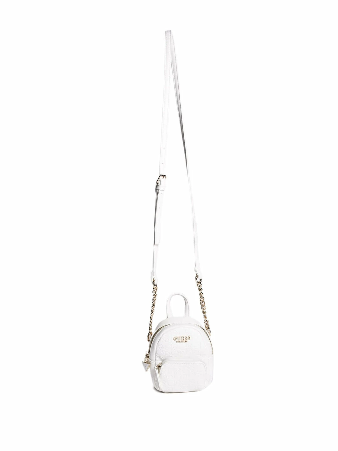 Faux-leather mini backpack crossbody is complete with logo hardware, a front zipper pocket and chain-trim strap.