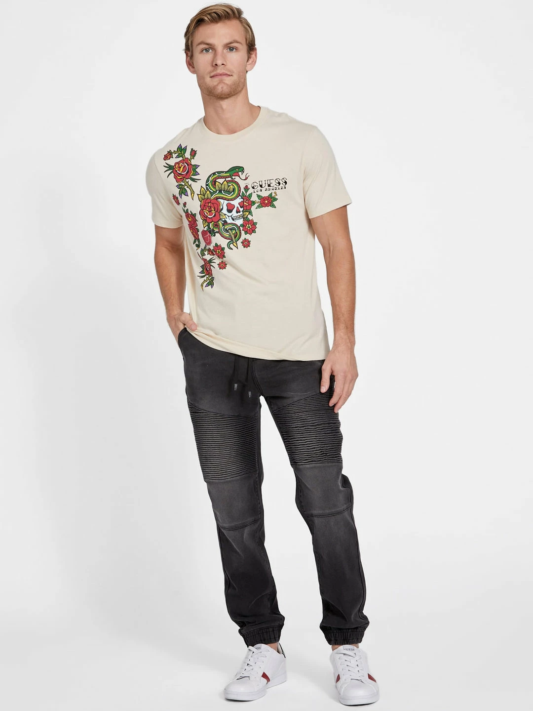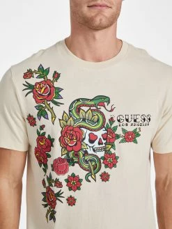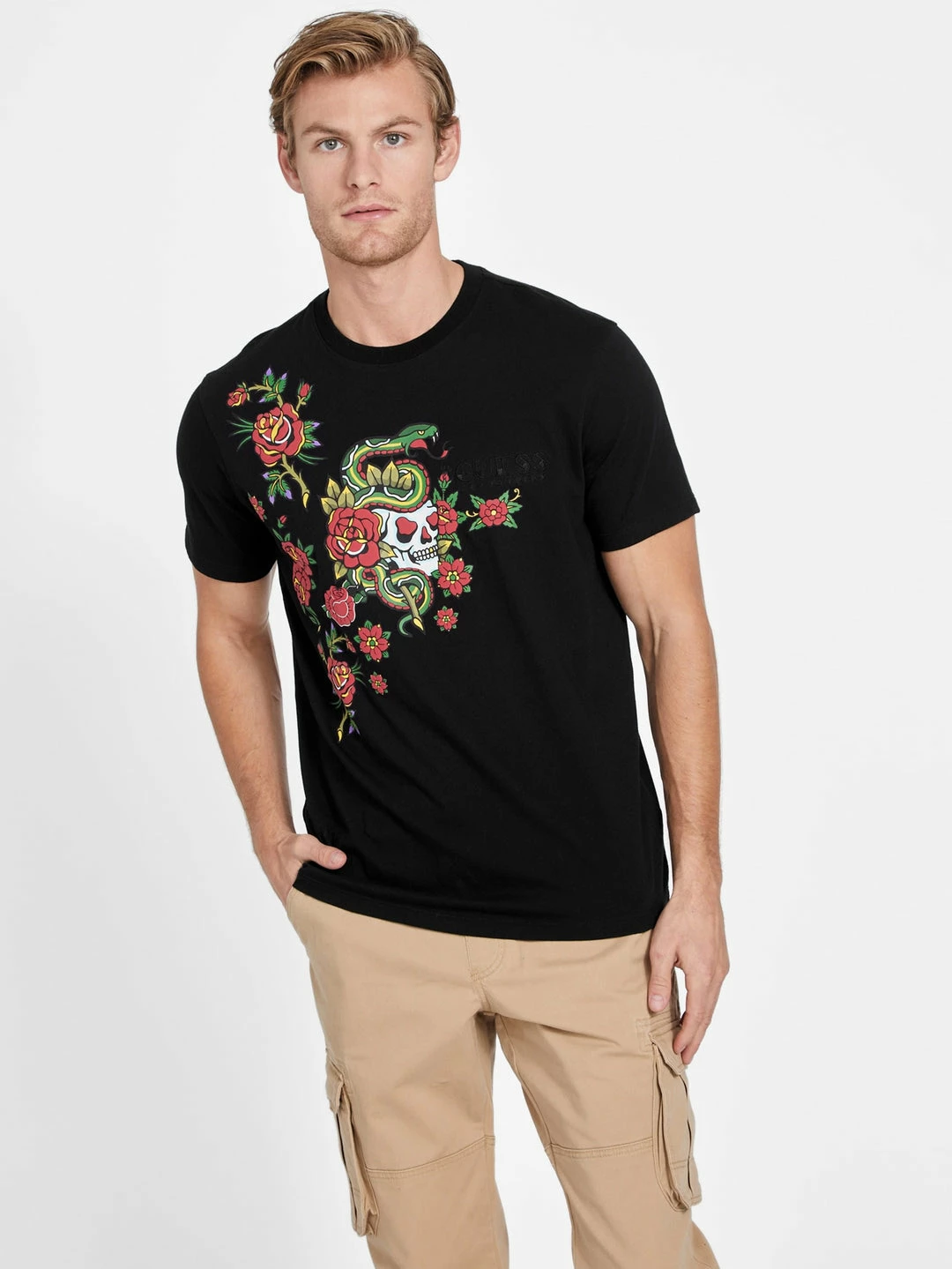 A print that really pops. This jersey tee features a skull, snake and floral puff graphic, embroidered logo, crew neckline and short sleeves.