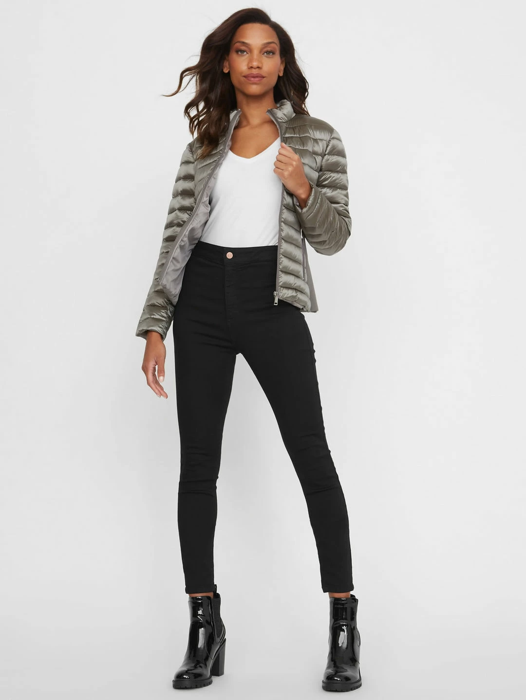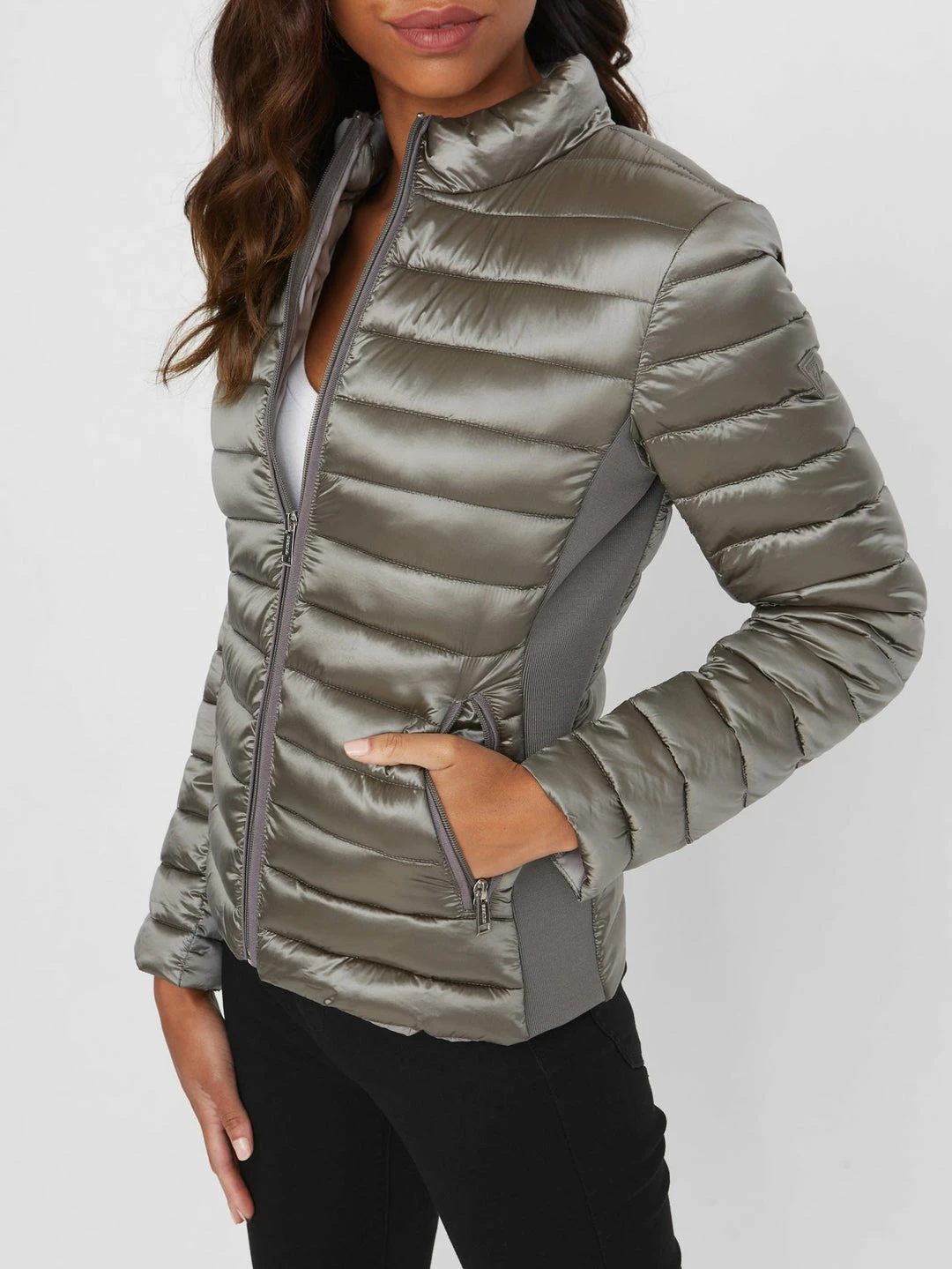 An ideal layer, this weather-ready jacket is designed in a padded nylon fabrication with shimmering metallic finish. Features a stand collar, side zip pockets and front zip closure.
