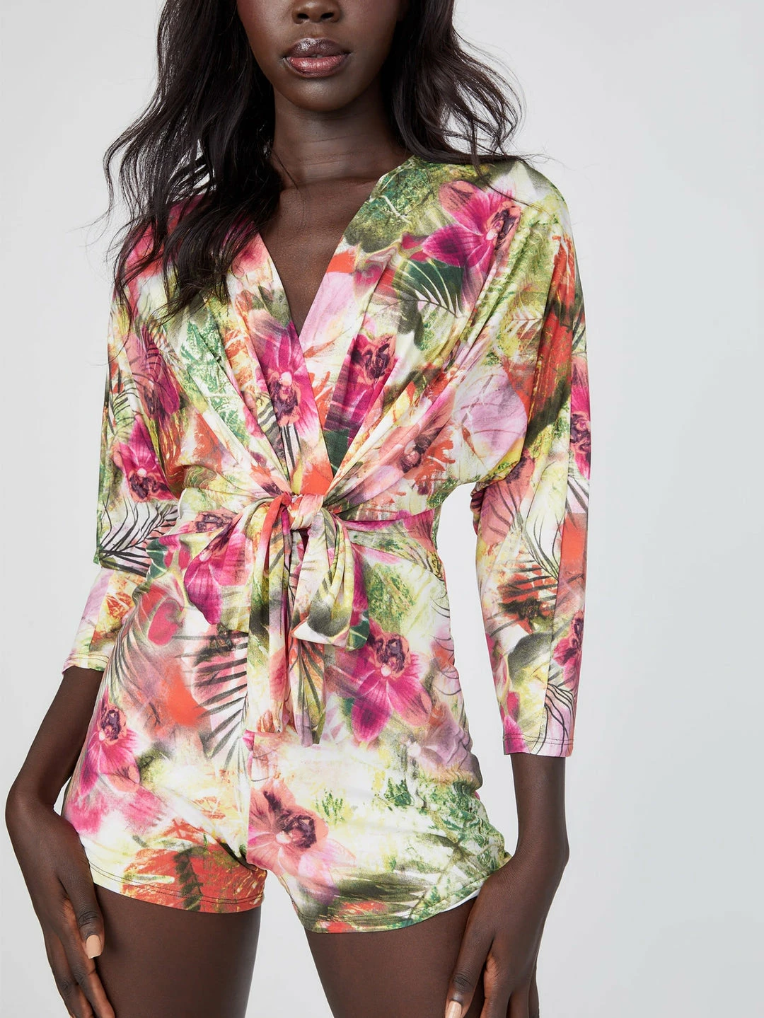 For your next night out, this romper features a surplice V-neckline with tie detail at the gathered waist. Finished by long sleeves and a shorts bottom.