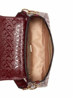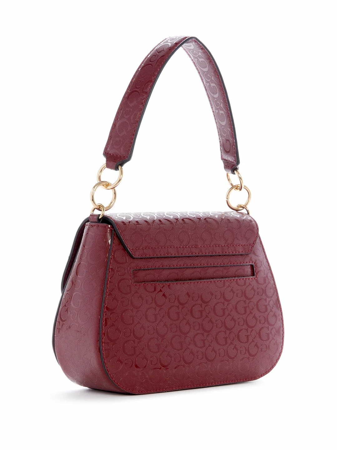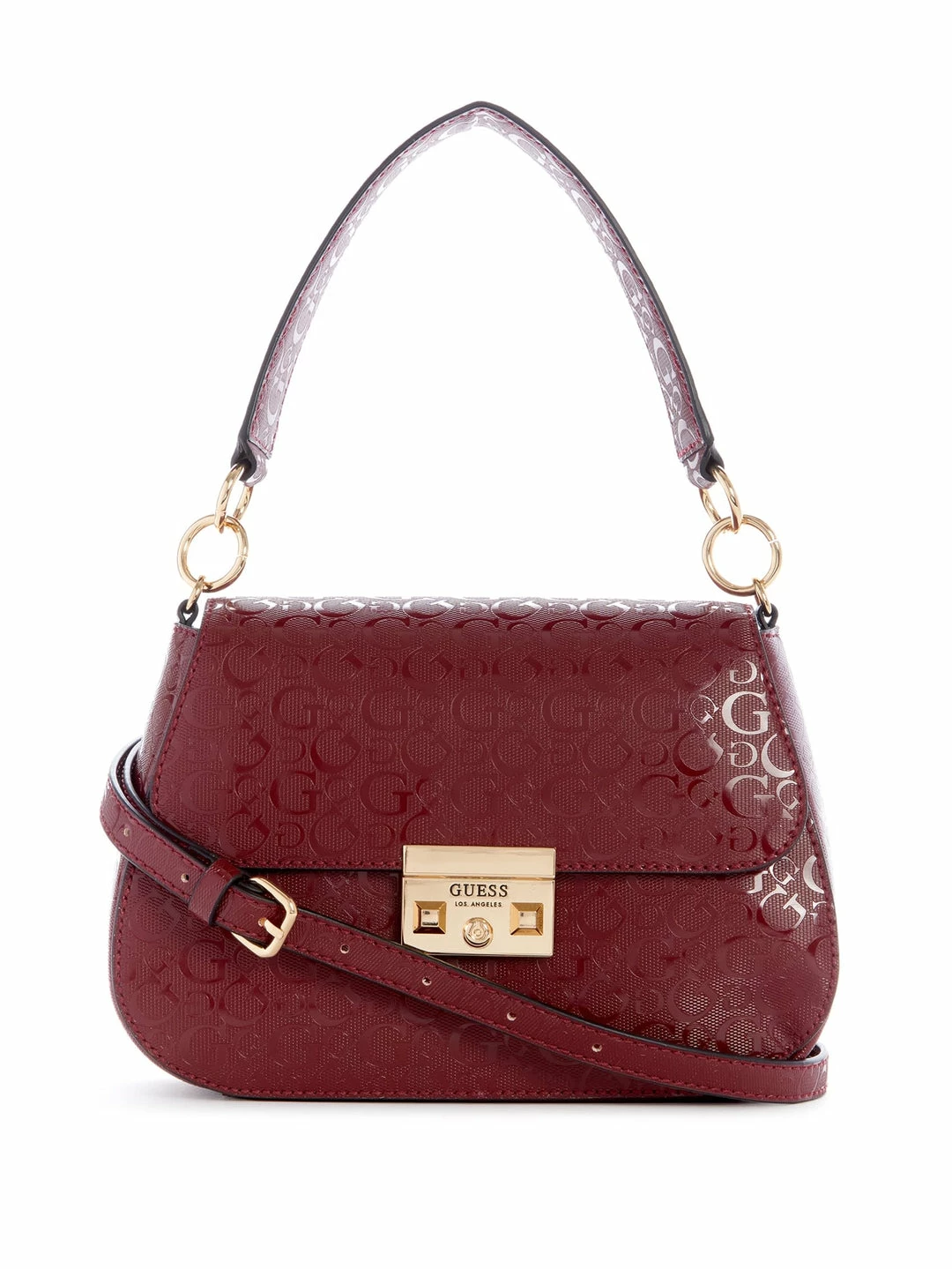 A pretty piece to carry along anywhere. Faux-leather crossbody featuring a G-logo shine design, fold-over flap, push-lock closure with an etched logo, top handle and adjustable strap.