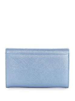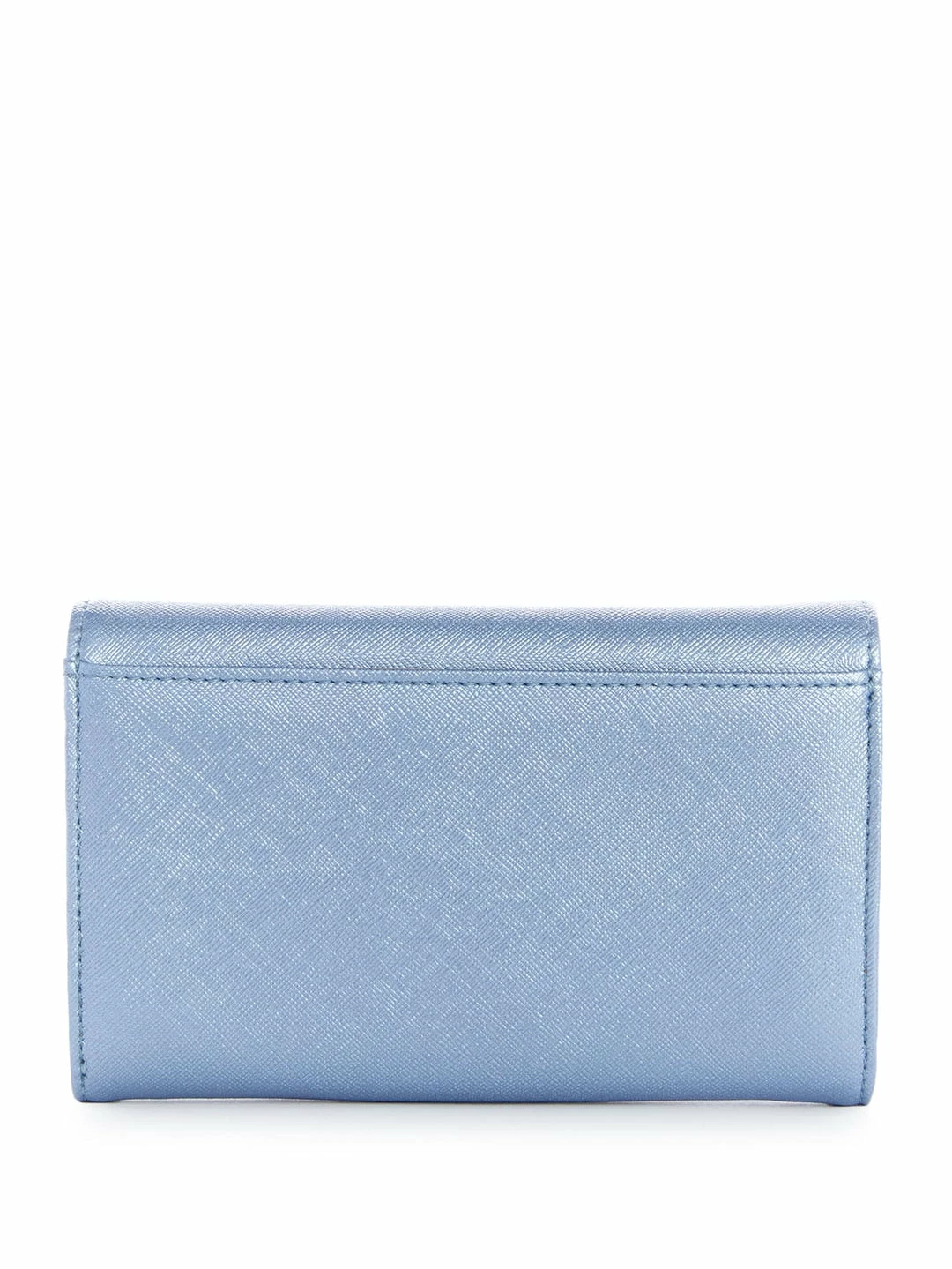 Stay organized with this faux-leather organizer wallet featuring a metallic sheen, fold-over flap, push-lock closure with an etched logo and wrist strap.