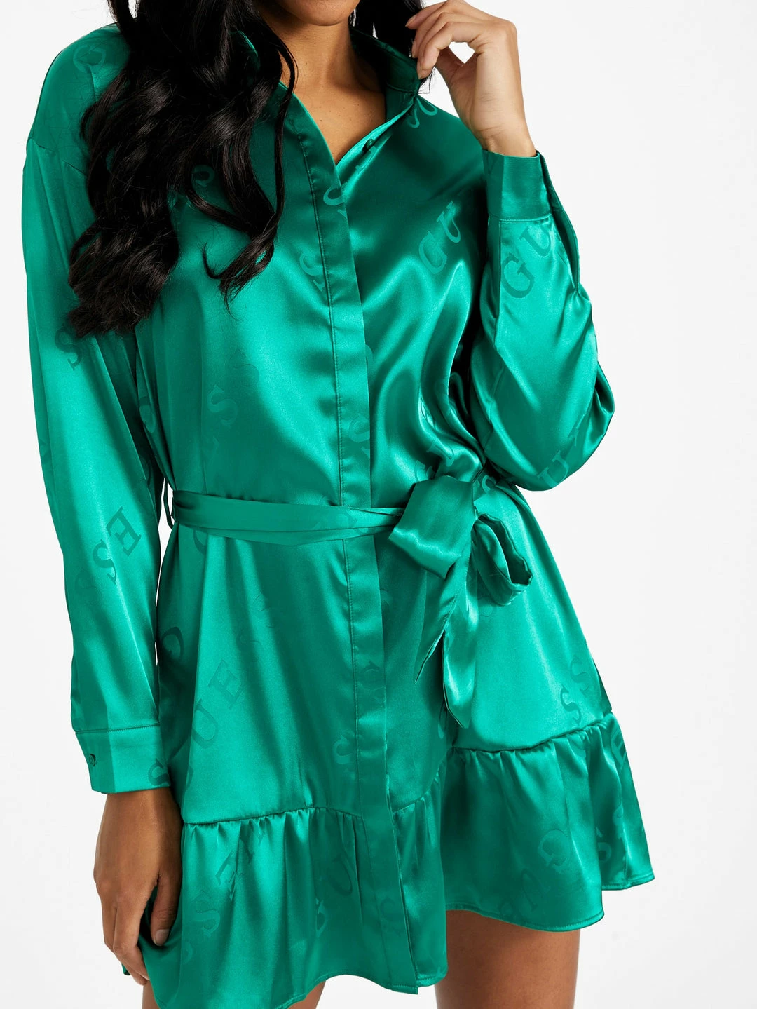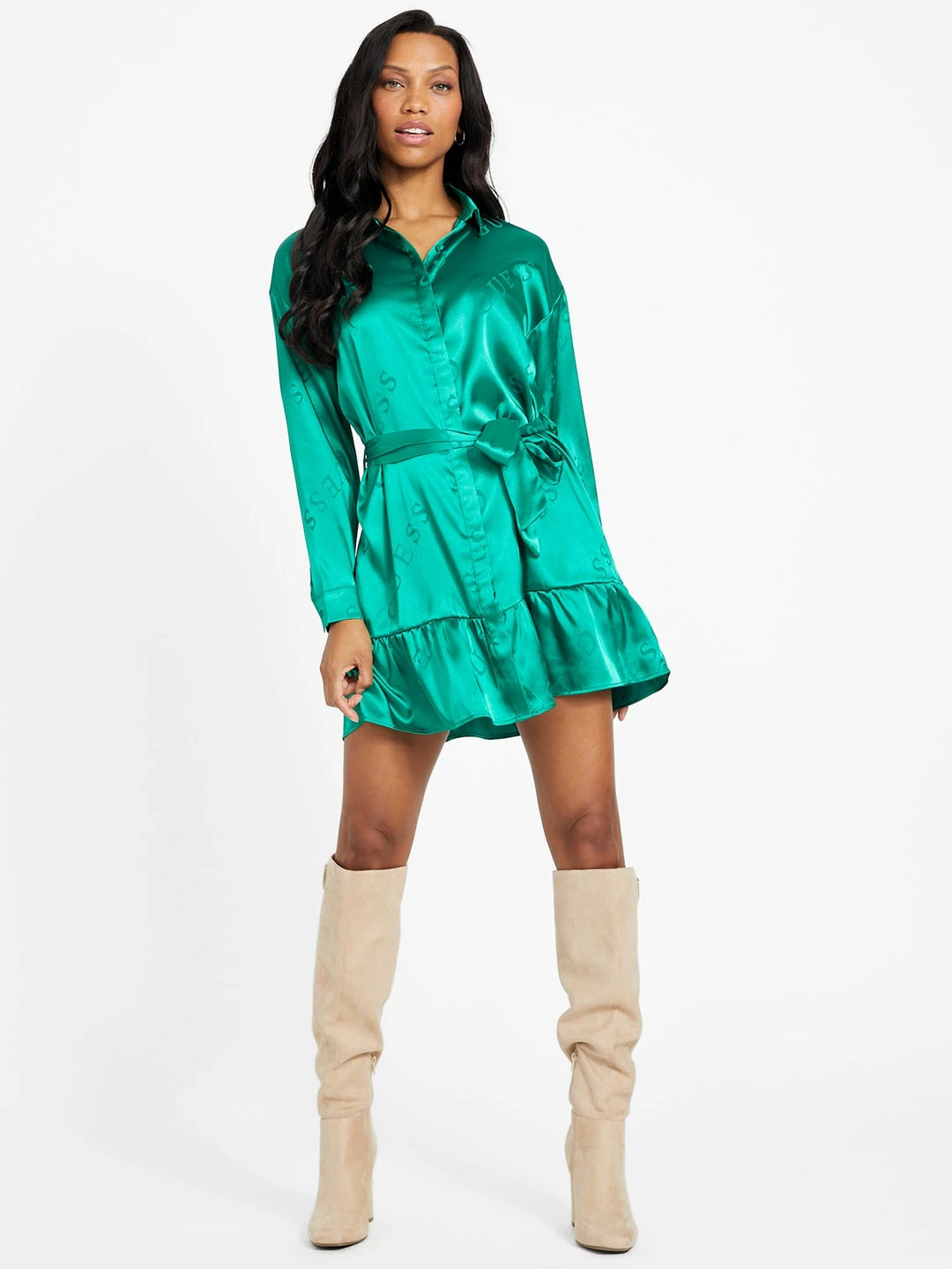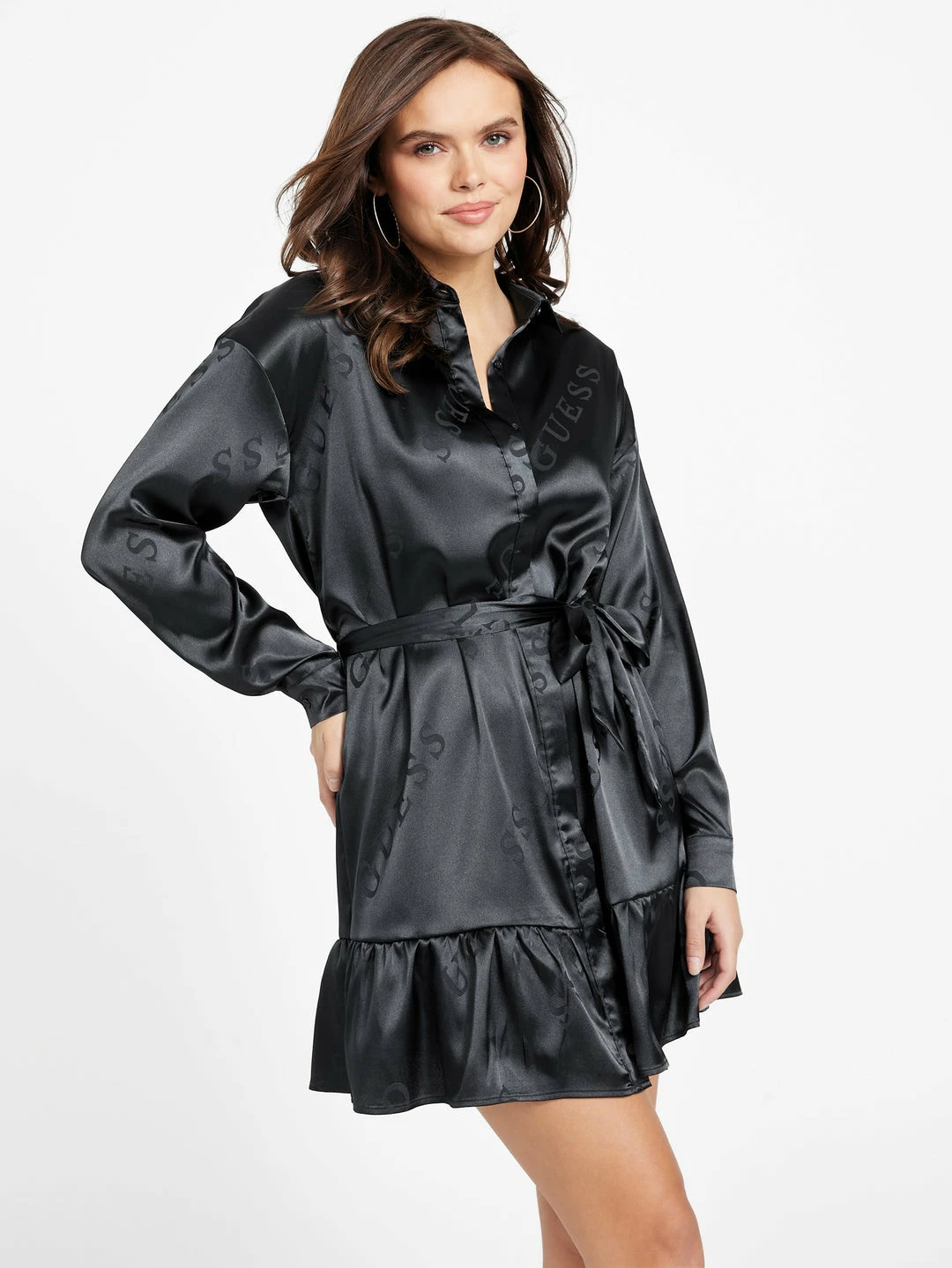 A new feminine favorite, this silky dress features an subtle allover logo print and button-up construction with a folded collar and long sleeves. Completed by a ribbon belt at the waist and flared bottom hem.