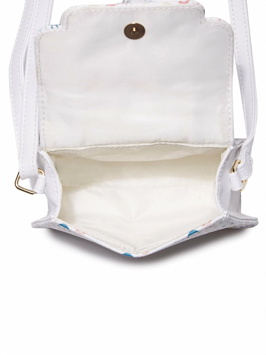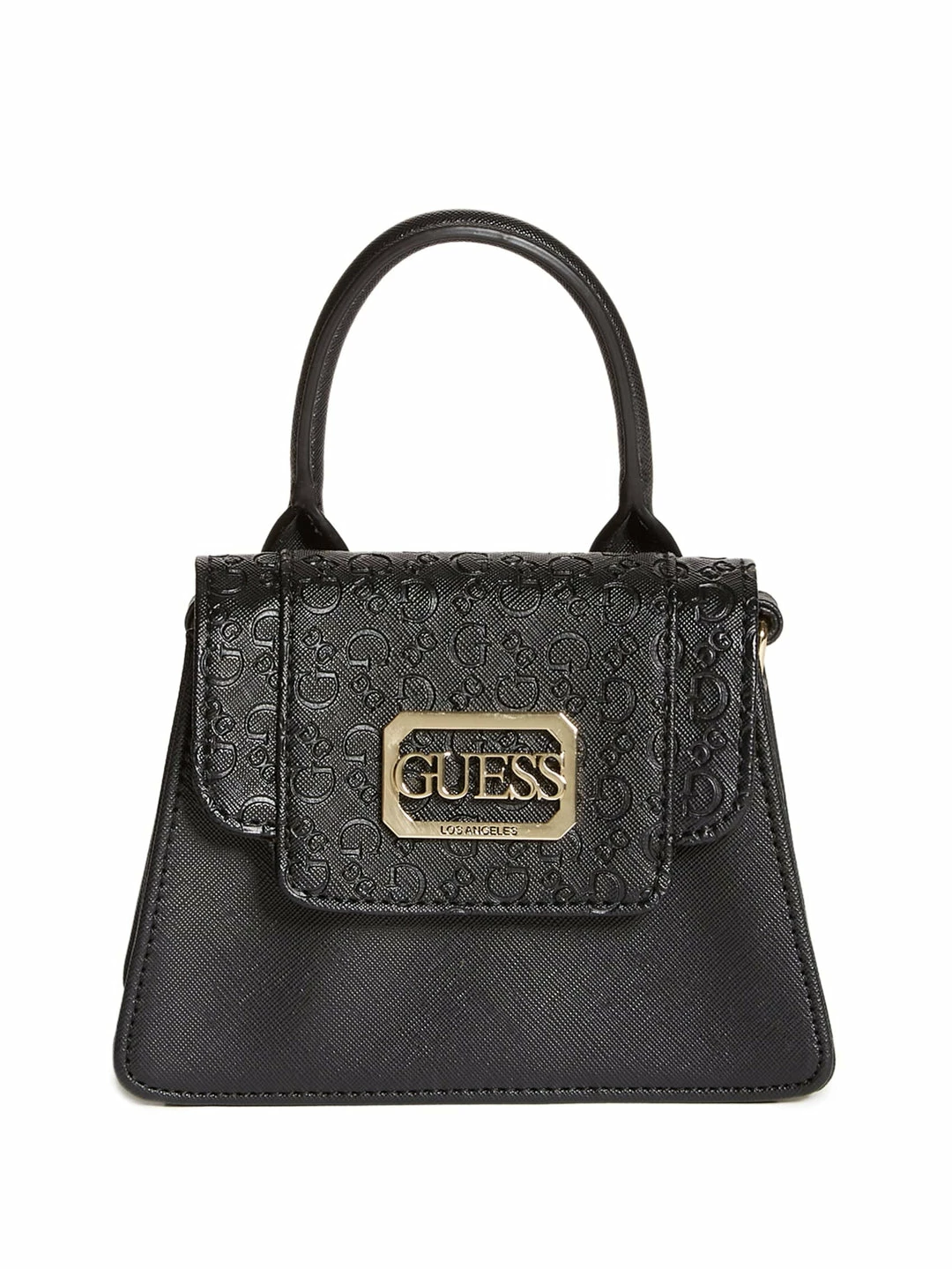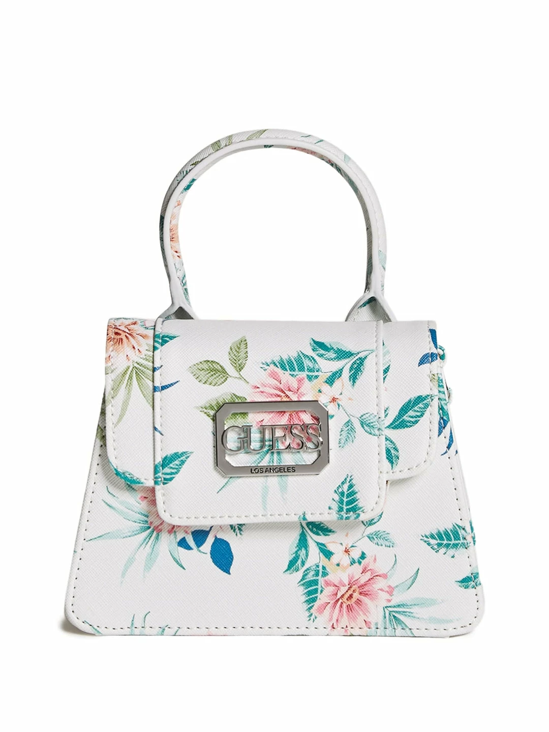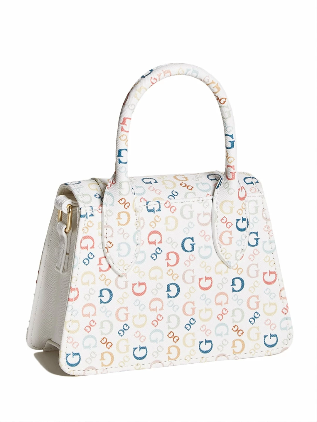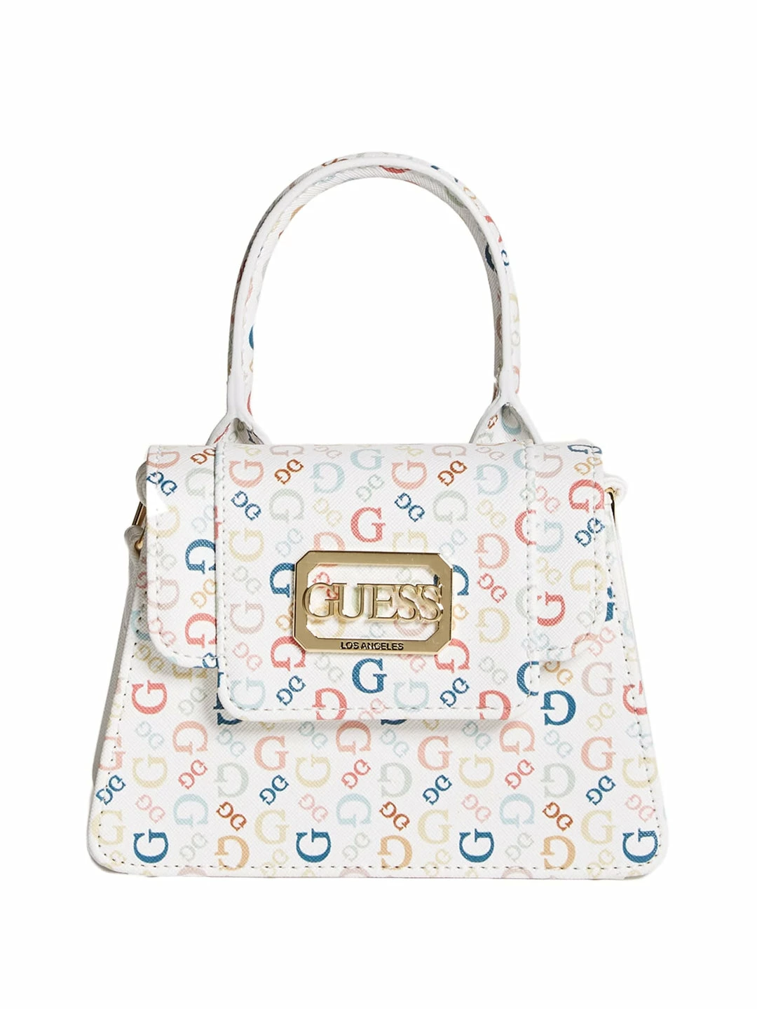 End your look on a cute note with this compact satchel designed in a classic structure, featuring a logo emblem on the fold-over flap closure. Comes with detachable crossbody chain.
