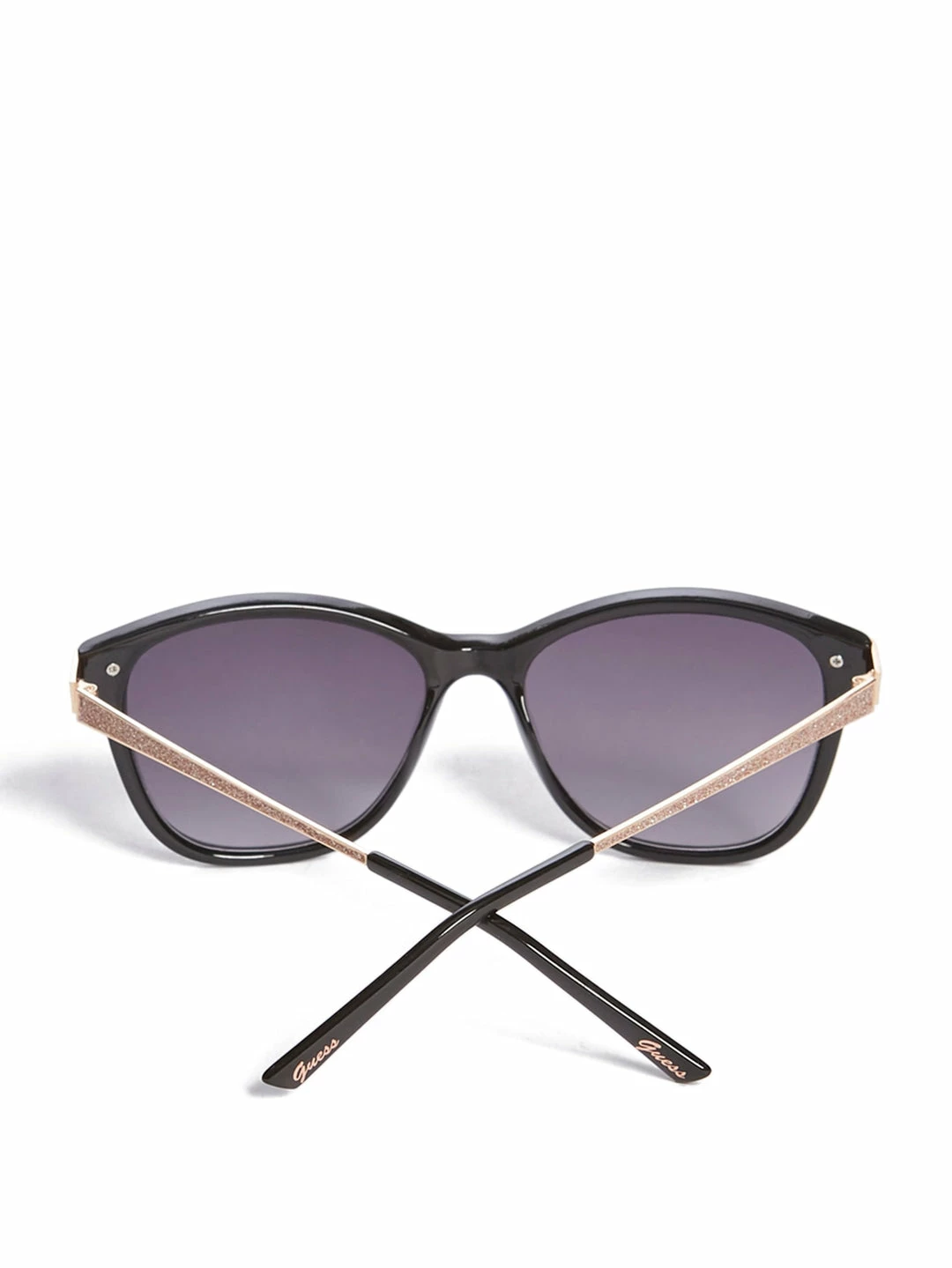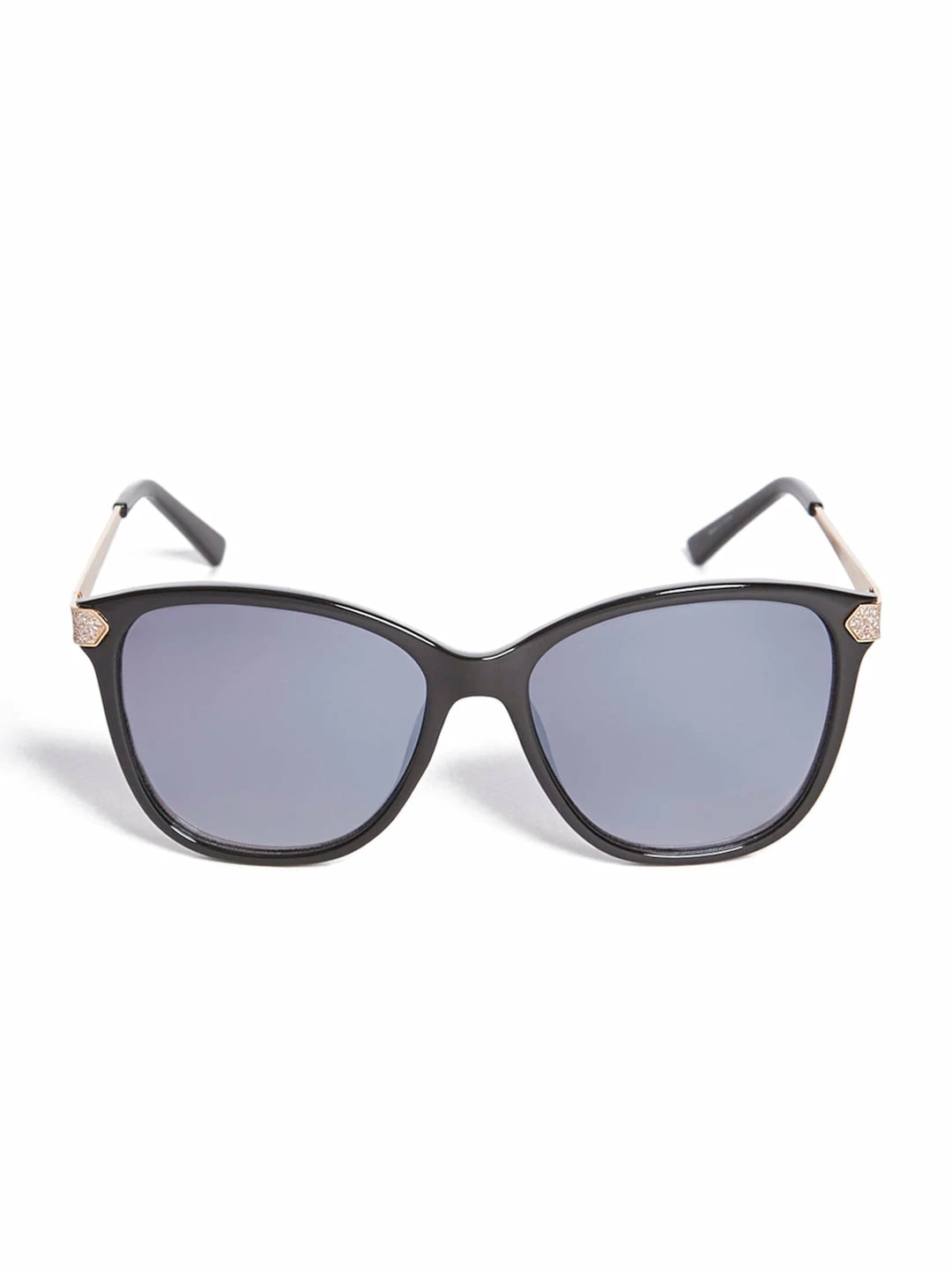 Shimmering glitter, that won’t flake or linger, accents the temples of these oversize square sunglasses.