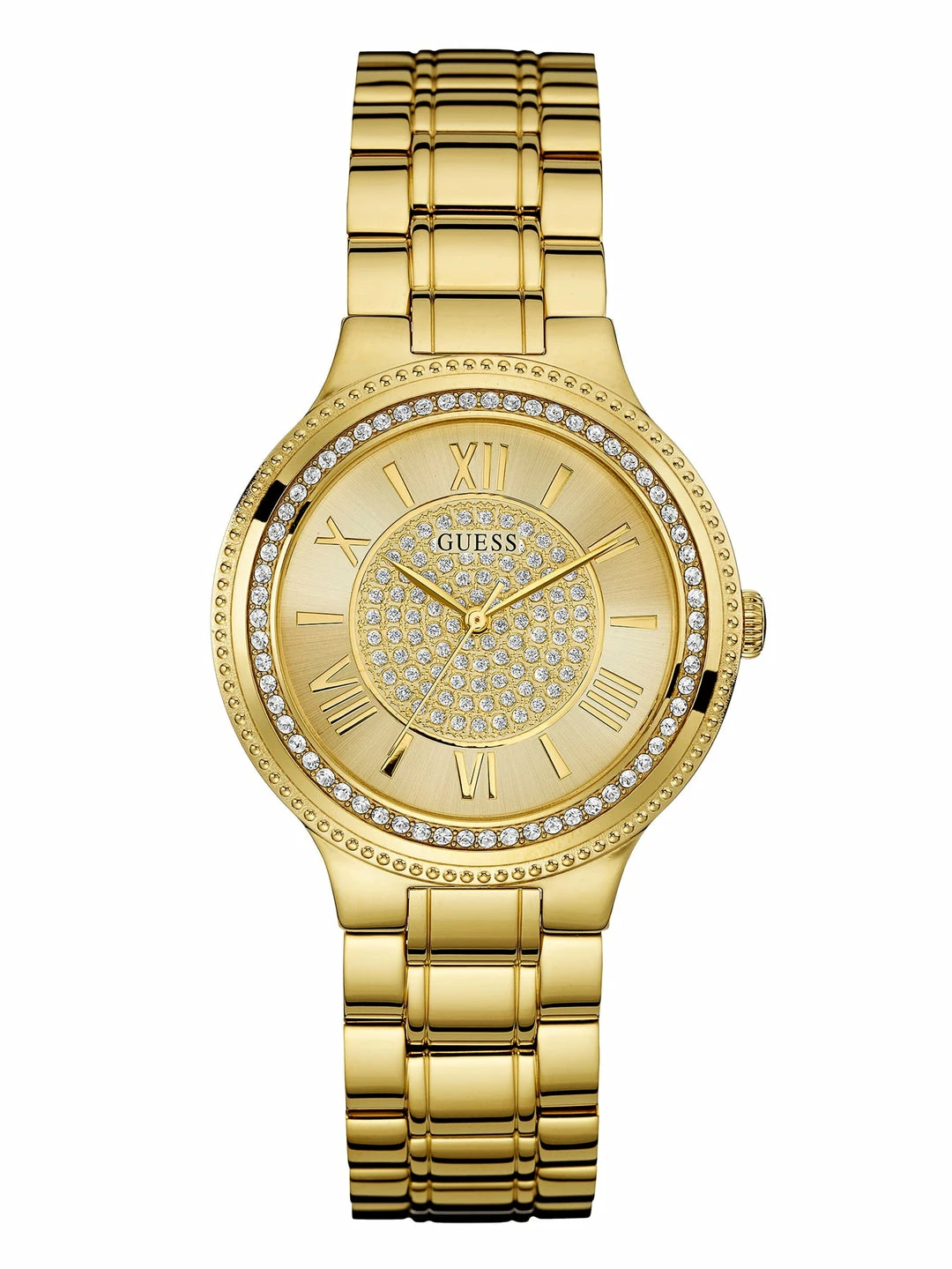 Classic analog watch designed with a champagne sunray dial, gold-tone bracelet and shiny crystal embellishments around the bezel to dress up any outfit. Designed with Roman numeral markers.