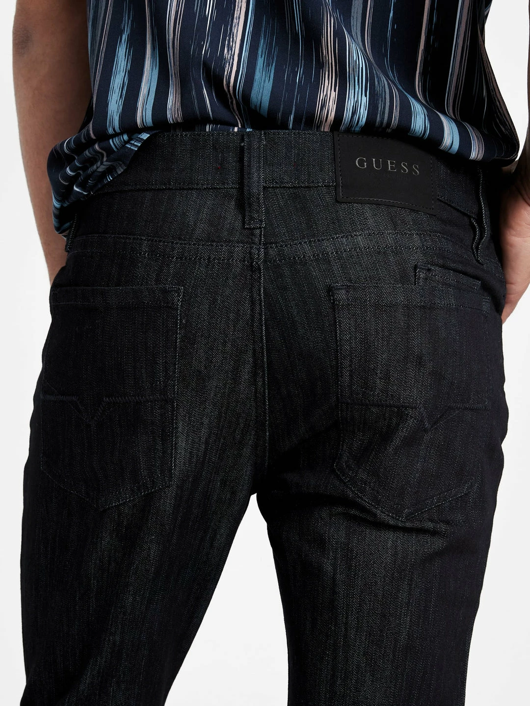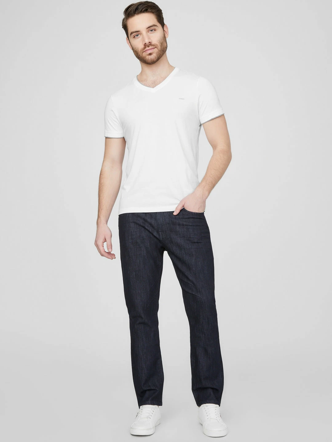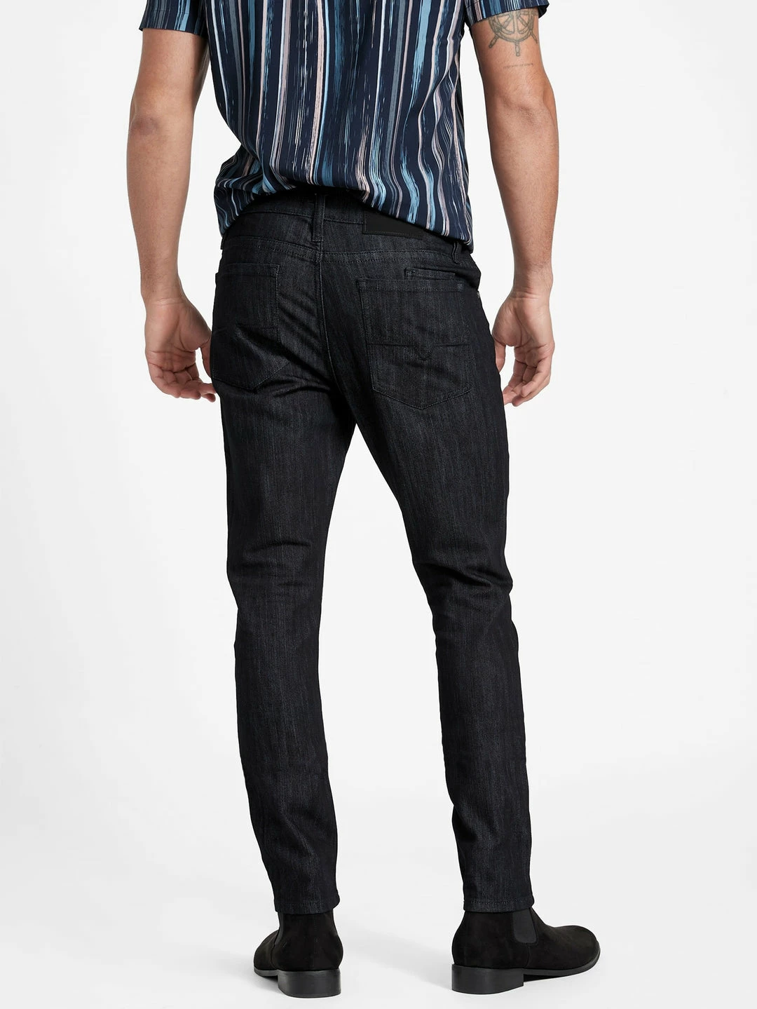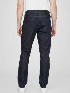 Medium-rise jeans featuring a slim fit and tapered leg below the knee. Dark indigo wash is rinsed for a soft feel.