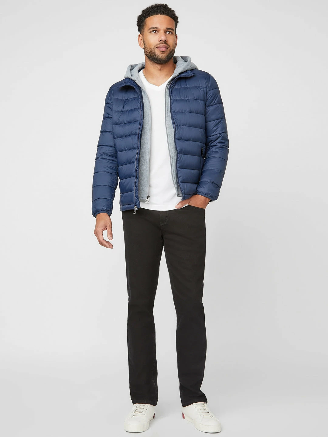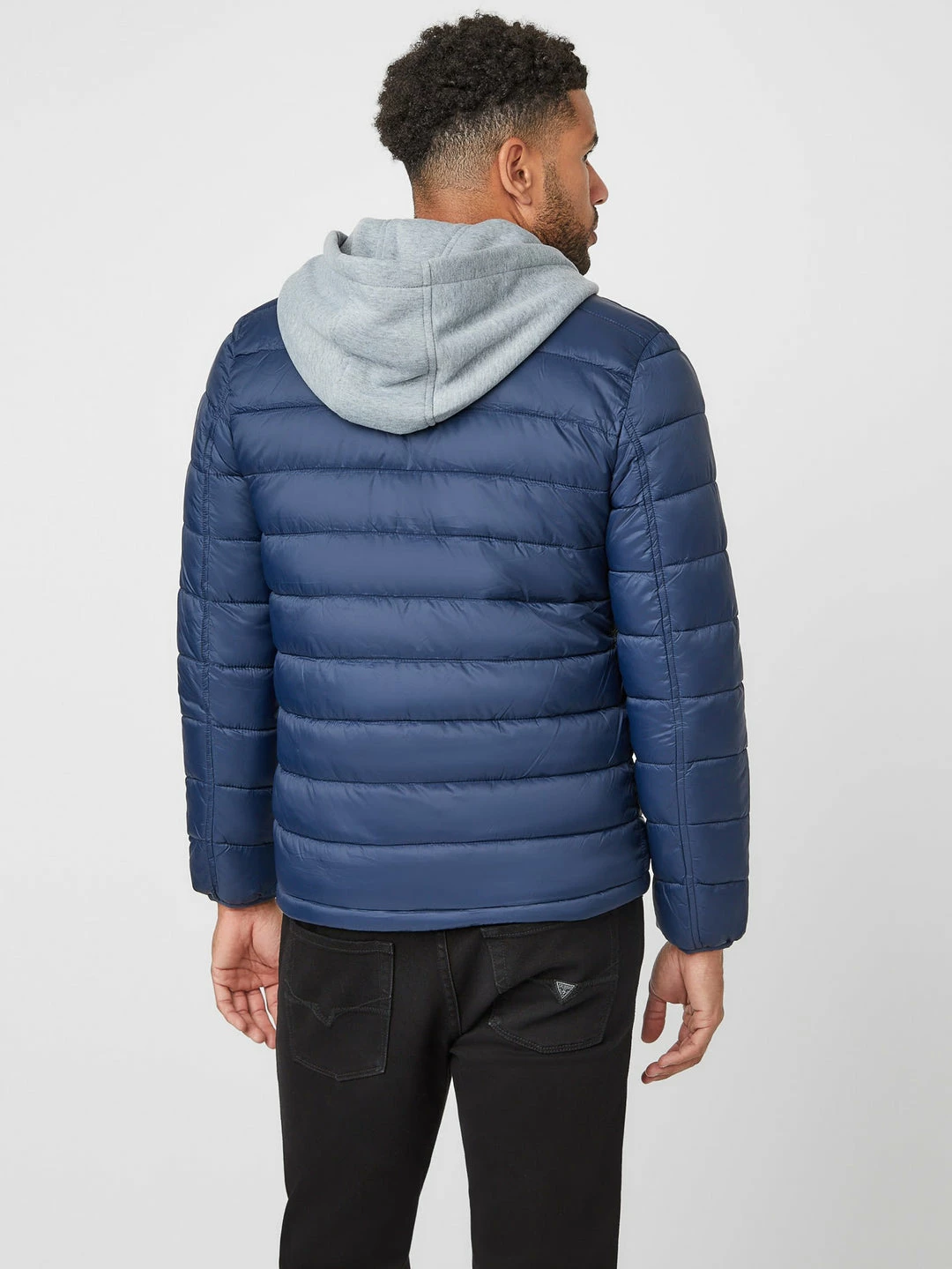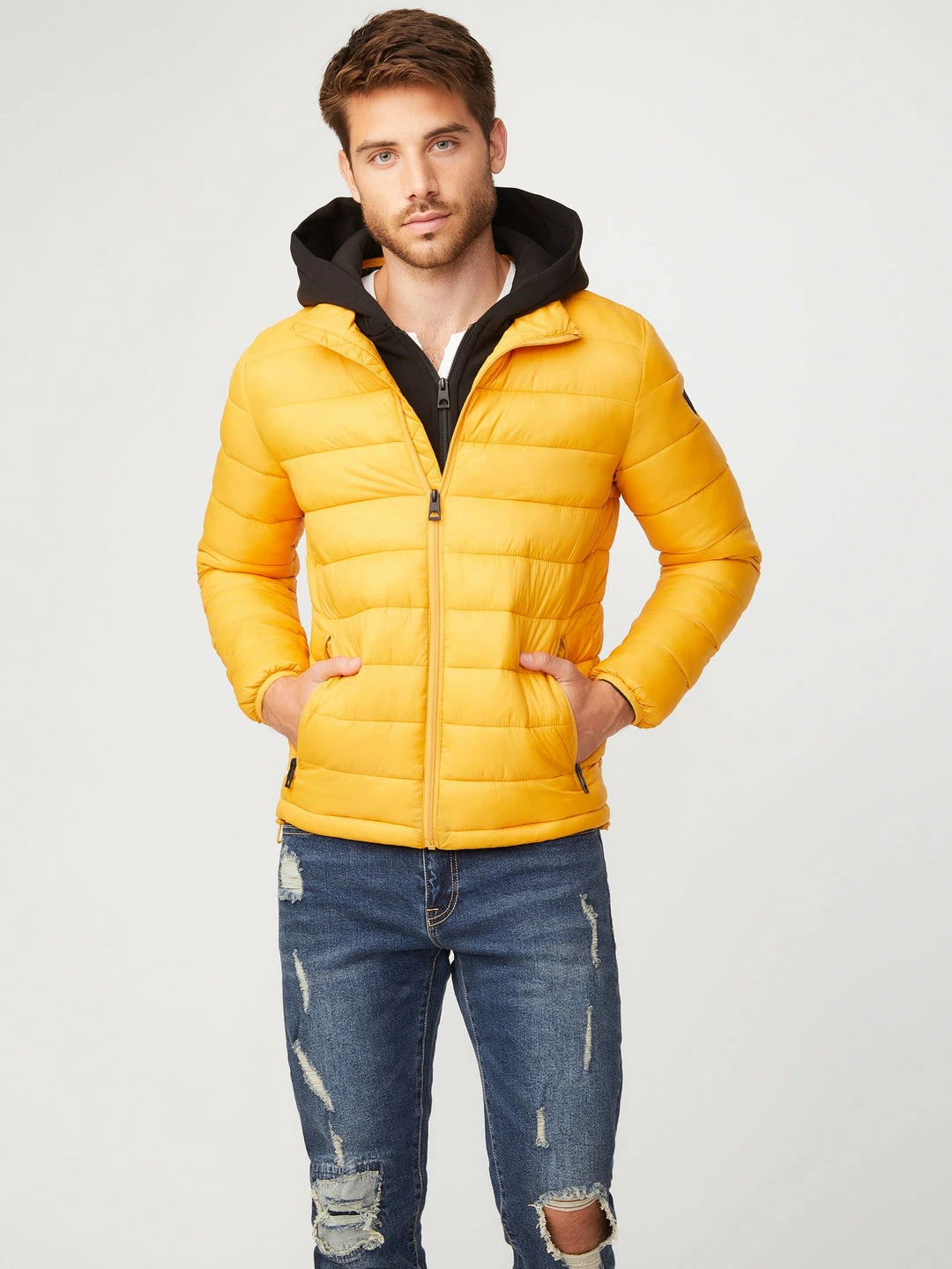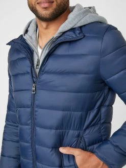 Upgrade your everyday jacket with this fitted puffer jacket featuring a removable jersey inset with attached hood and logo patch on the left sleeve. Side slip pockets and front zip closure.
