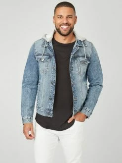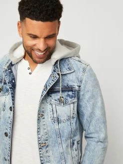 Get an effortless layered look in this denim jacket, designed with a removable contrast knit drawstring hood. Complete with a pointed collar, flap chest pockets and slip pockets.