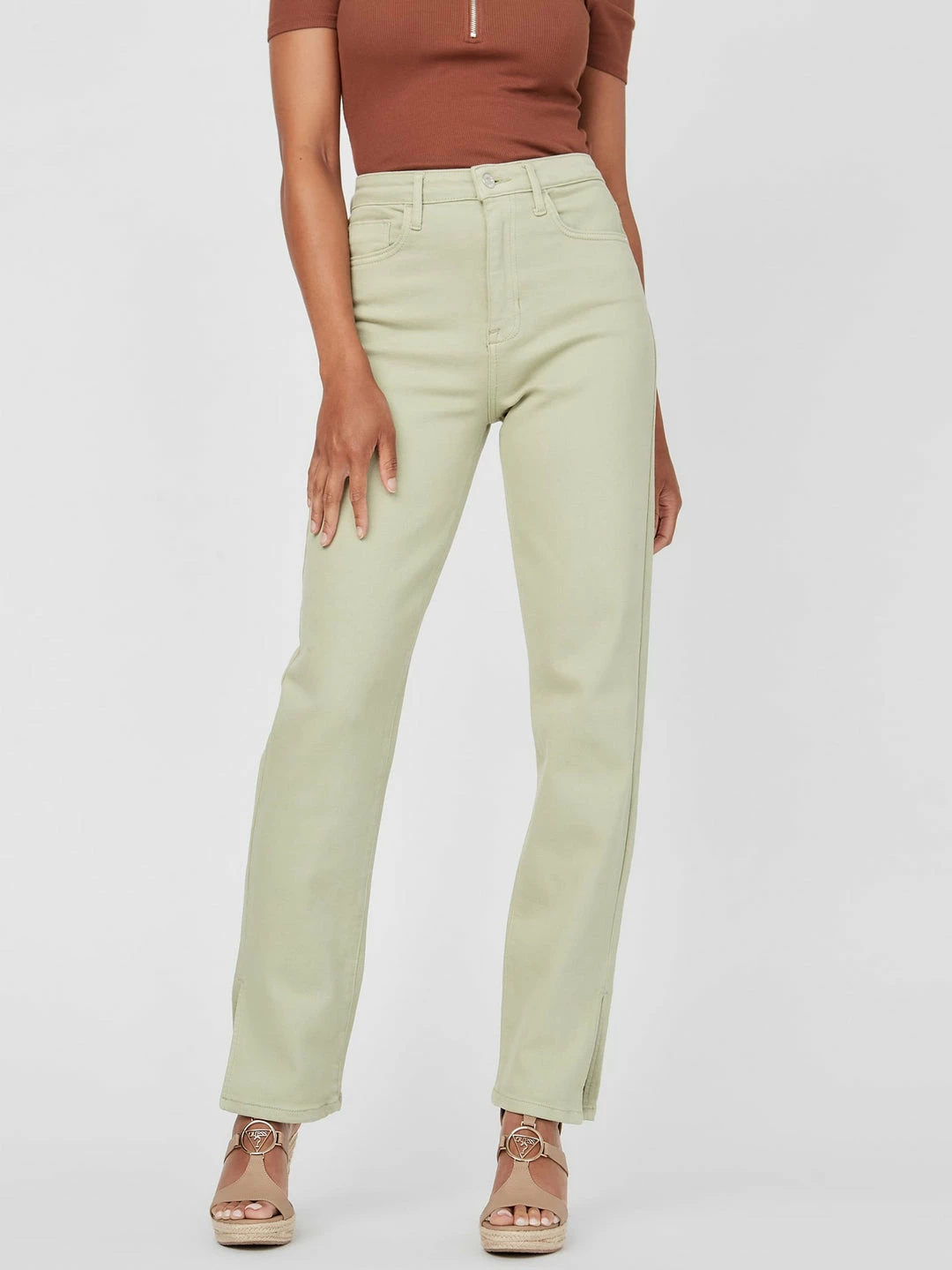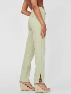 A classic style updated by slit details at the ankle sides of the straight-leg silhouette. High-rise waist and five-pocket construction.