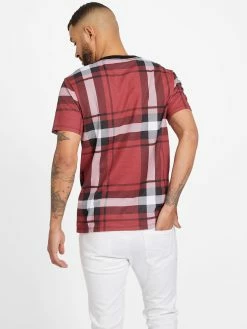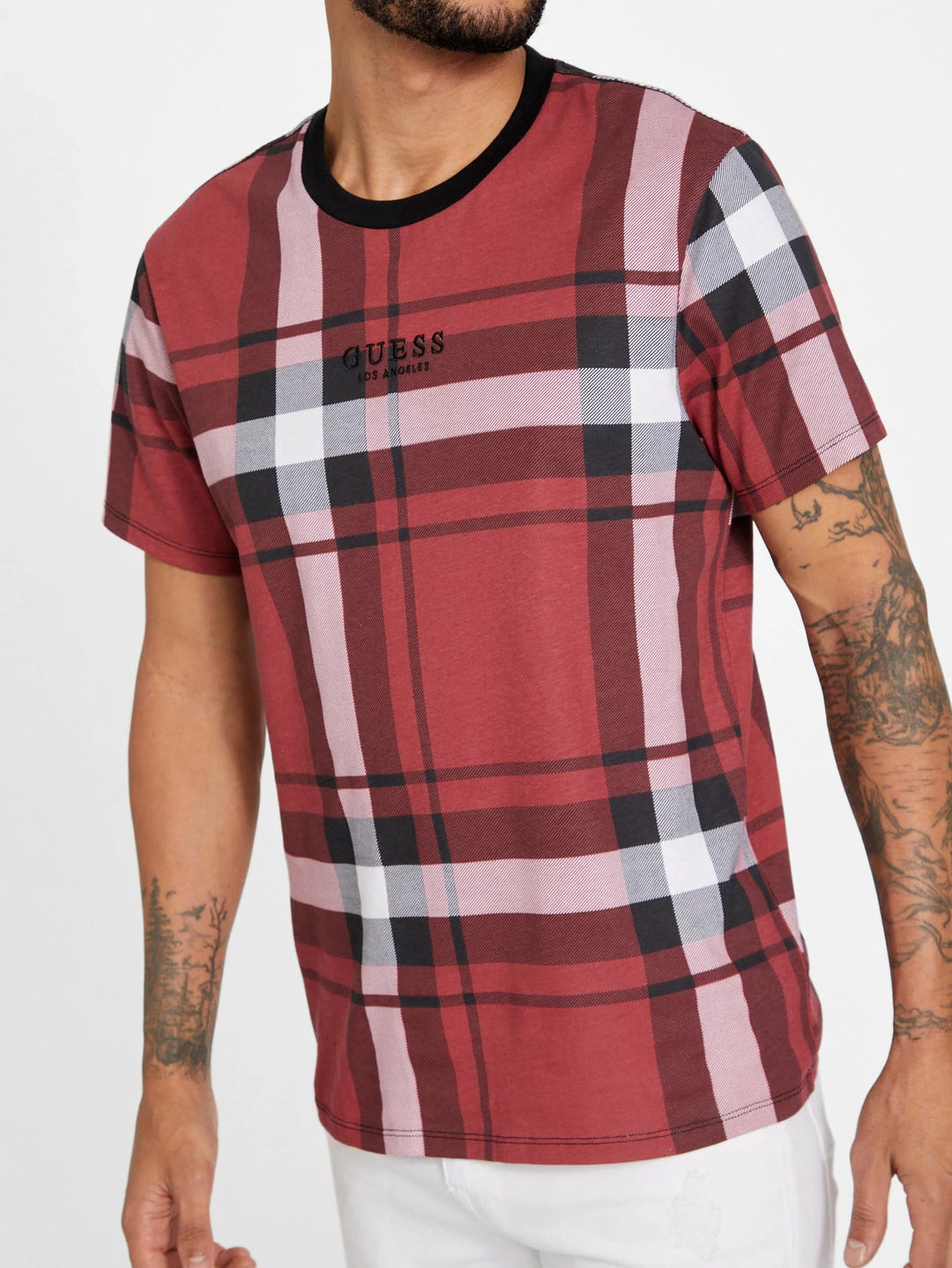 Crewneck tee featuring an allover tartan plaid print and logo text at front.
