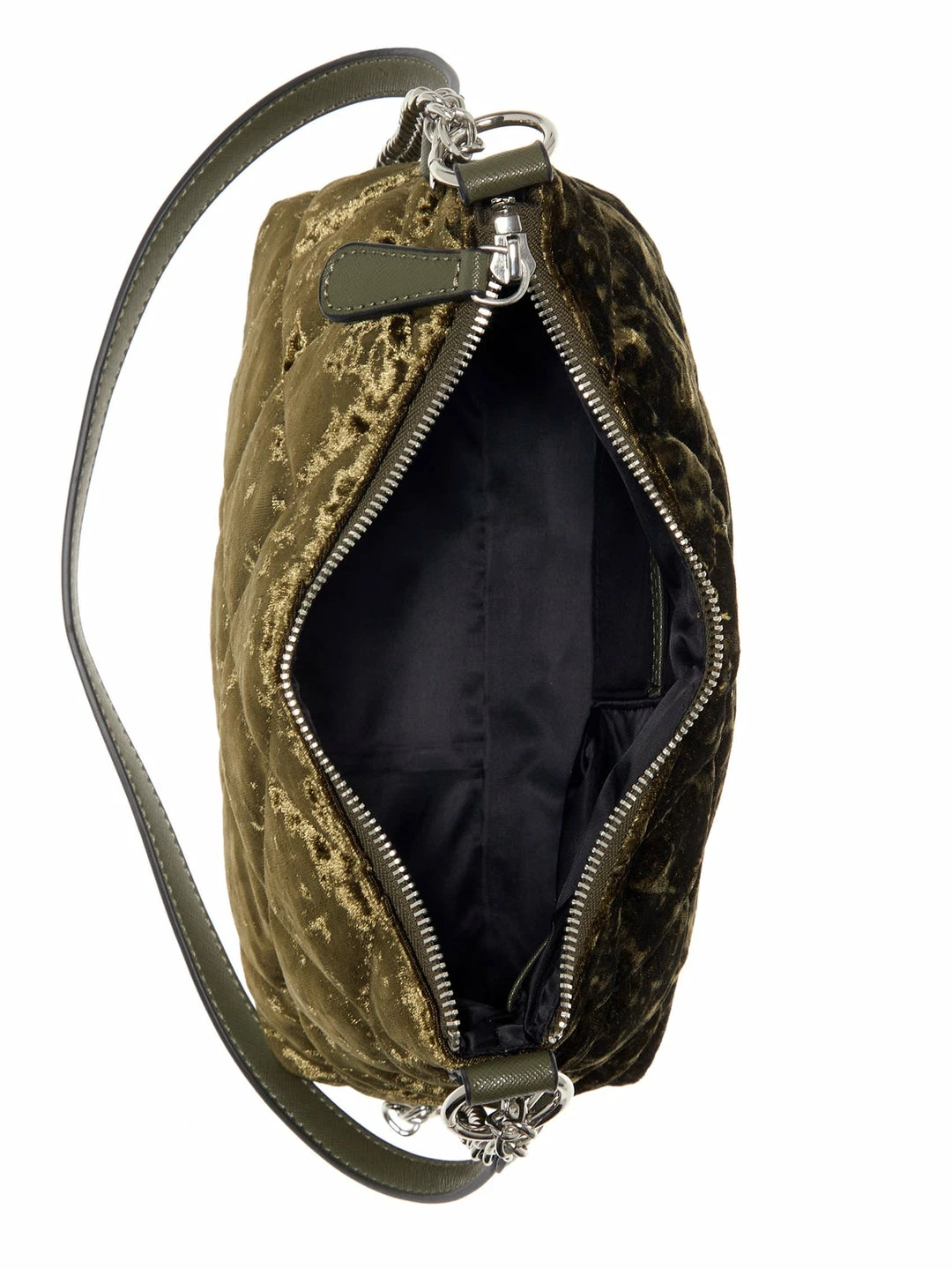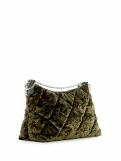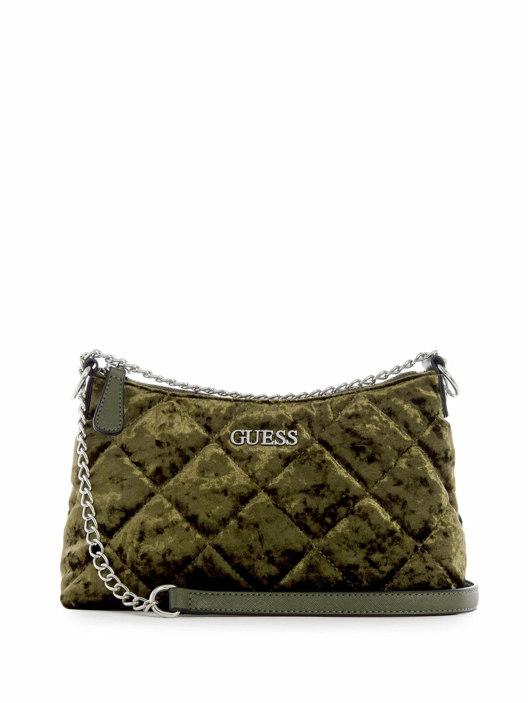 The glam piece your closet needs. A velvet crossbody featuring a quilted design, zip-top closure, logo emblem and mix-media strap.