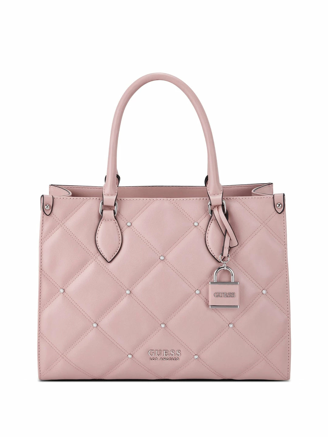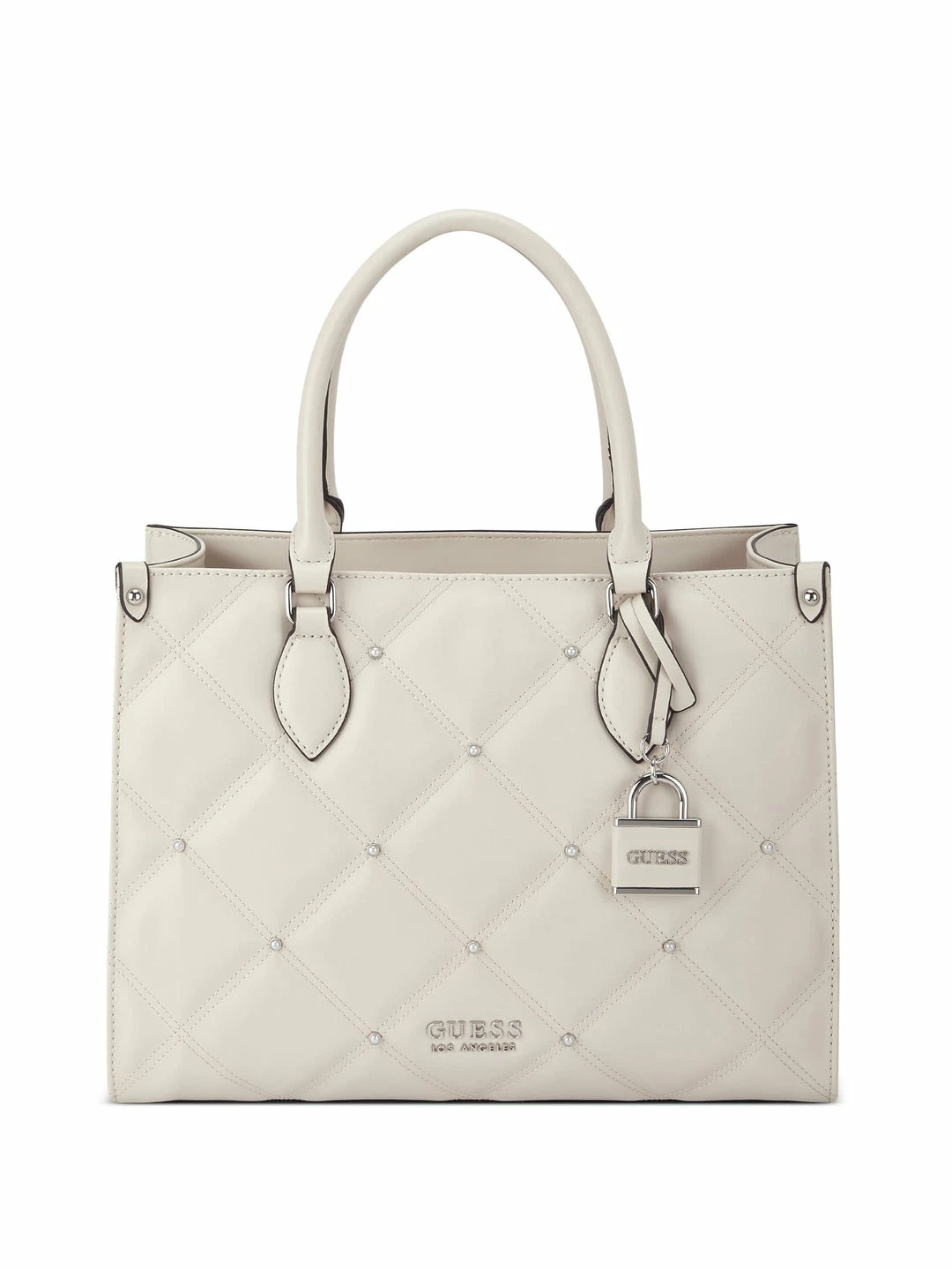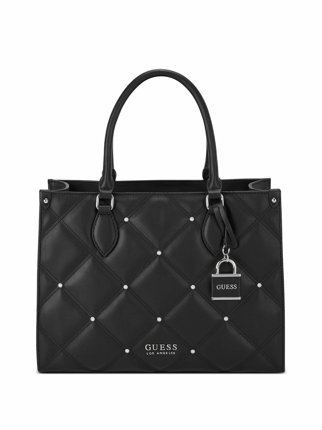 Carry your valuables in this quilted faux-leather constructed tote featured with shiny gold-tone hardware, rhinestone accents and a detachable logo keychain.