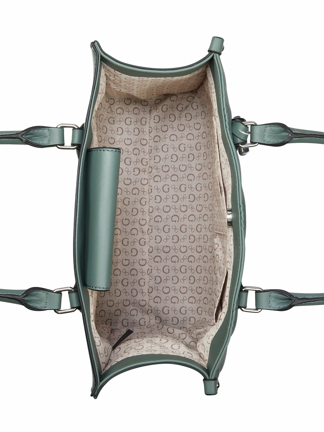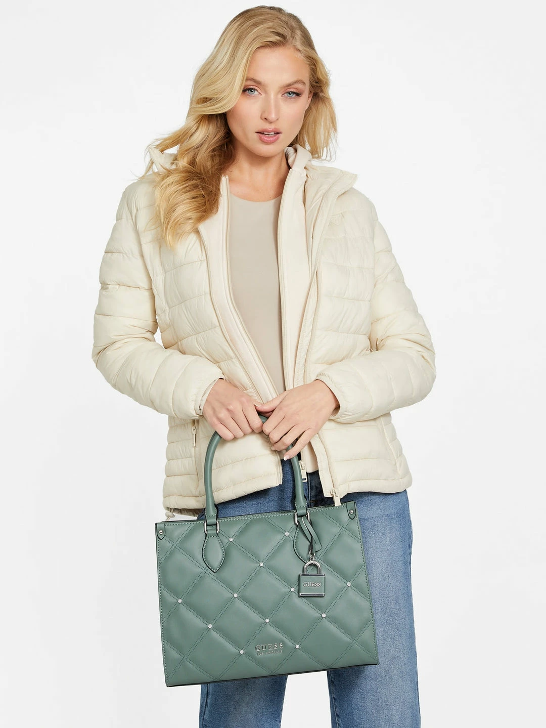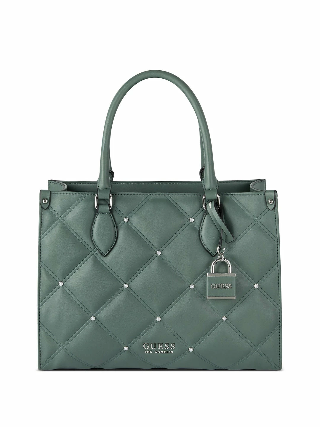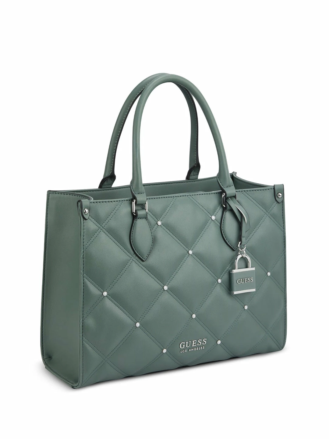 Carry your valuables in this quilted faux-leather constructed tote featured with shiny gold-tone hardware, rhinestone accents and a detachable logo keychain.
