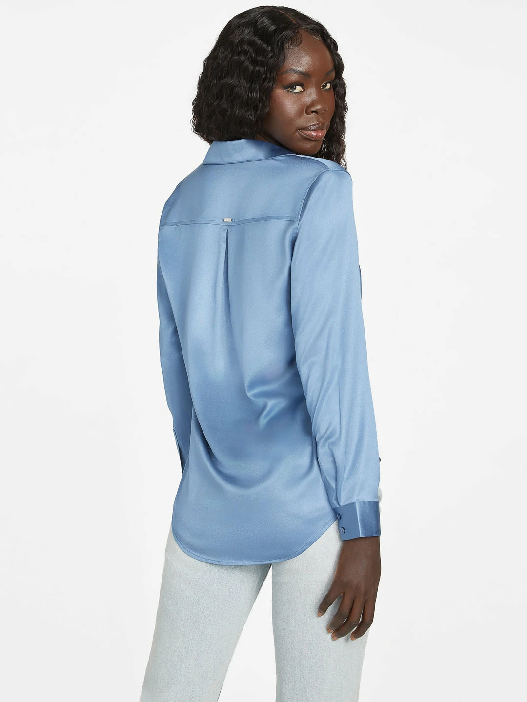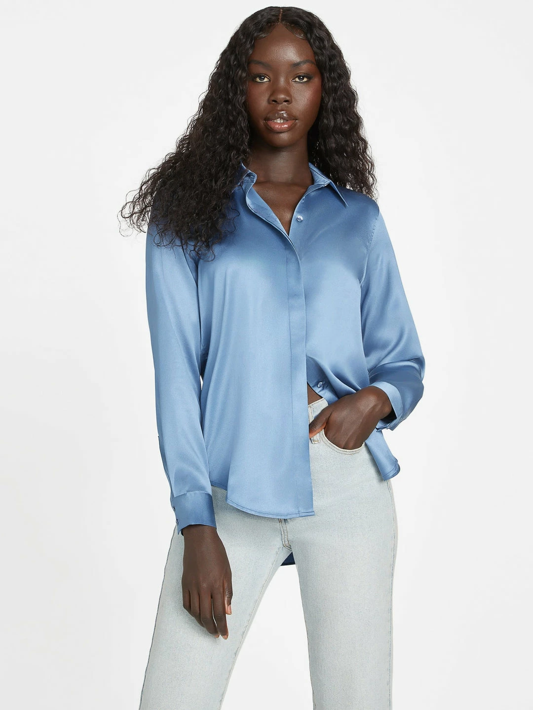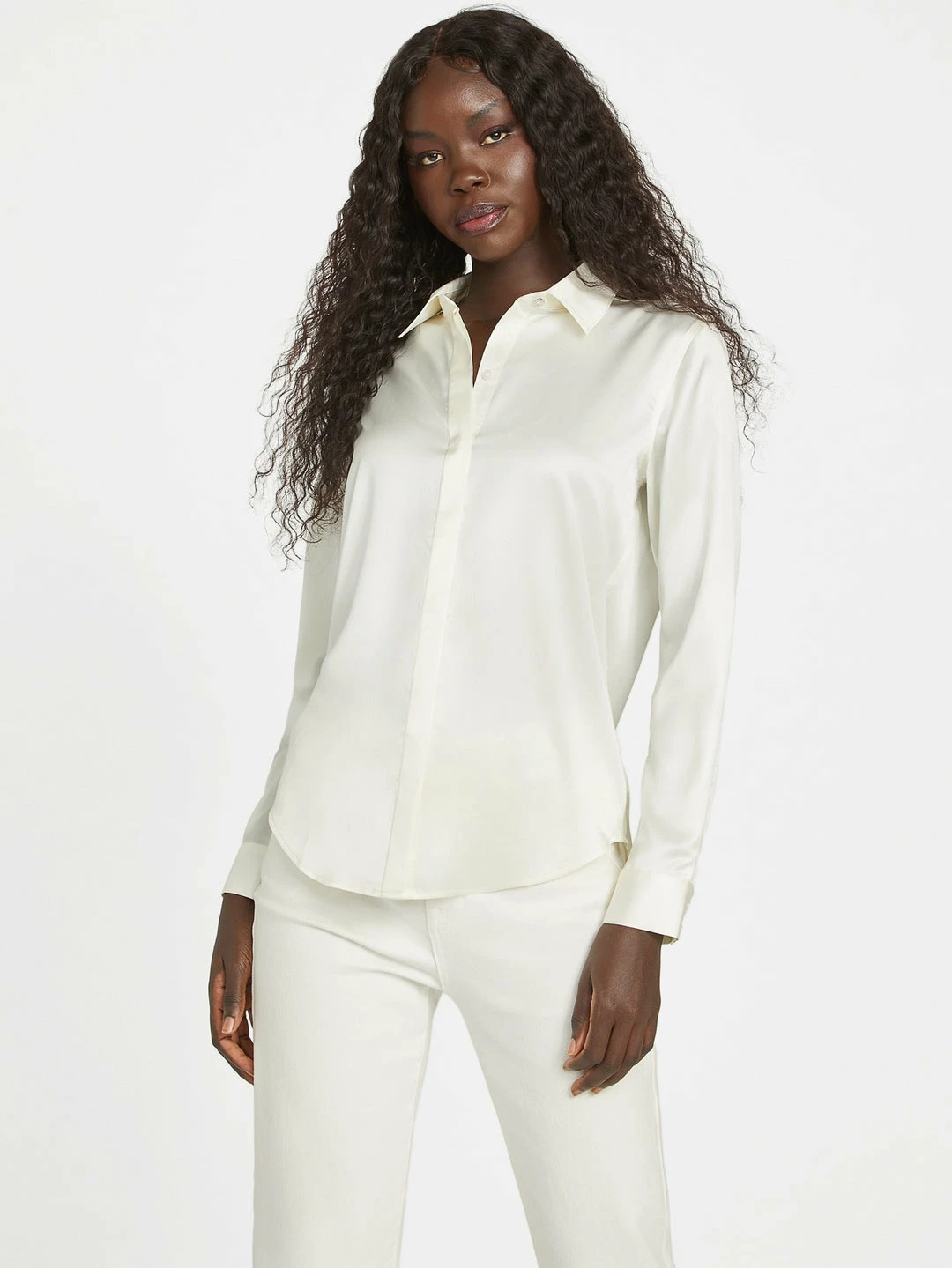 A silky-smooth addition to any wardrobe, this elevated long-sleeve blouse features a folded collar, classic shirttail hem and front button closures.