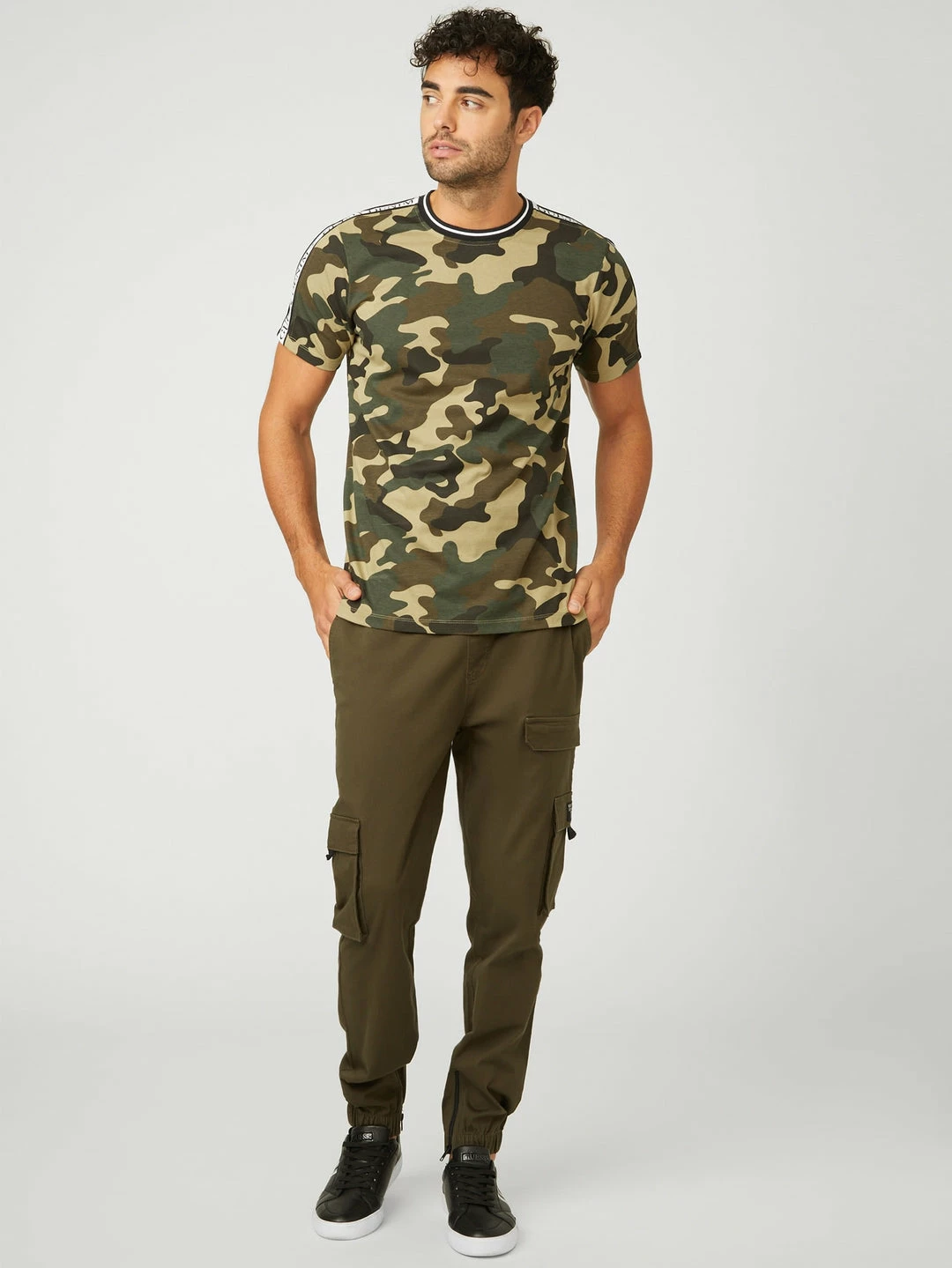 Edgy crewneck t-shirt featuring an allover camouflage print and logo stripes on the shoulders. Short sleeves and racing striped collar.