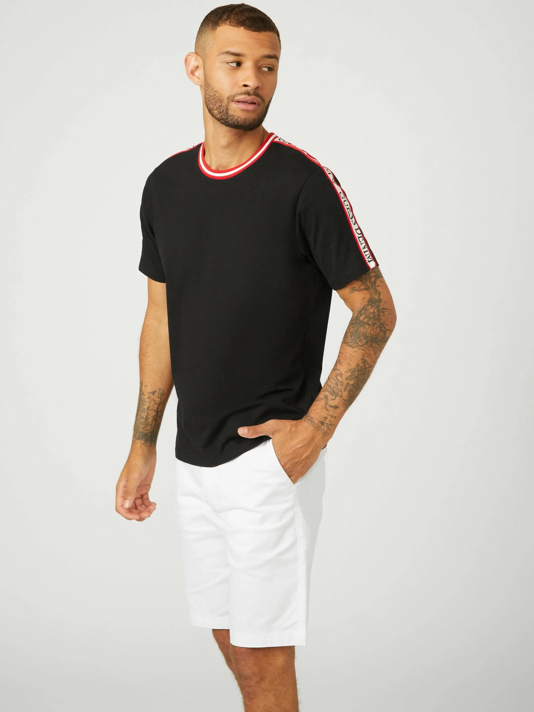 Complete your look with this laid back tee featuring a varsity-striped crew neck and logo tape trim on the short sleeves.