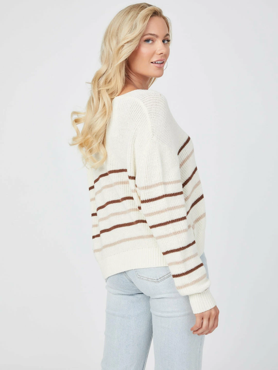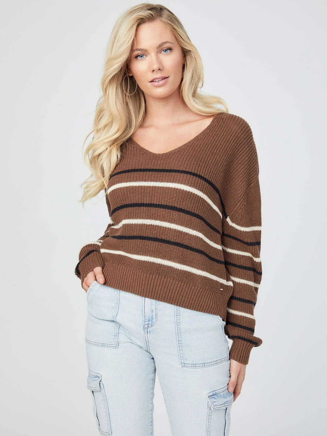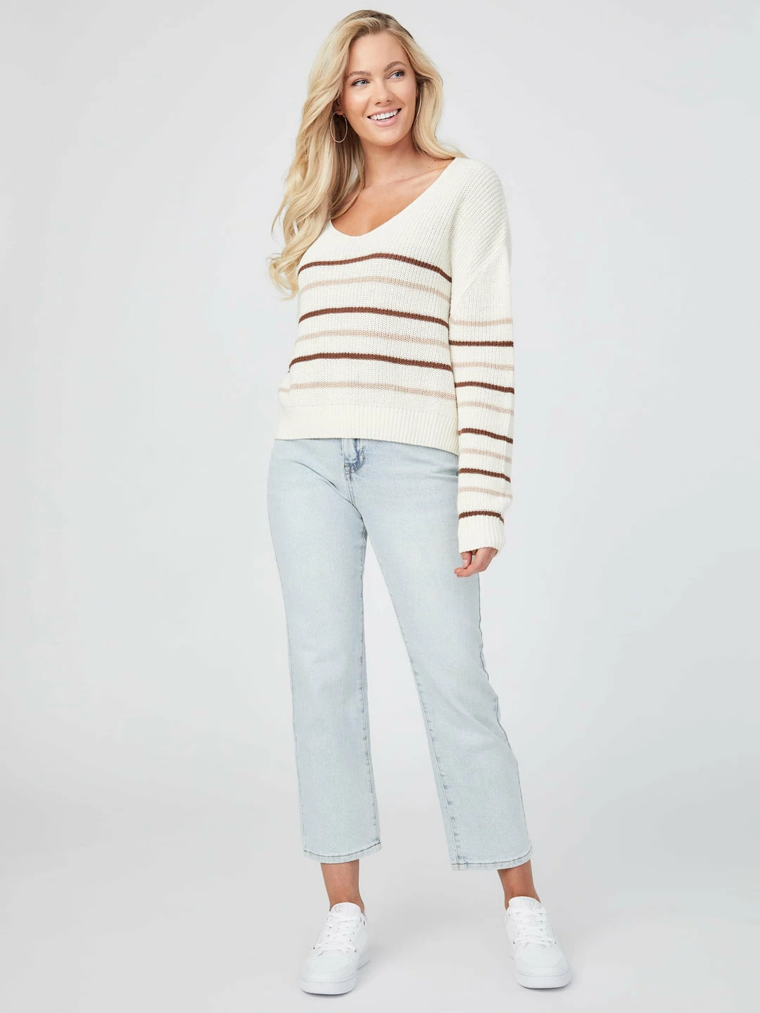 Keep things casual in this loose-knit sweater featuring a minimalist striped design, rounded V-neckline and long sleeves with dropped shoulders.