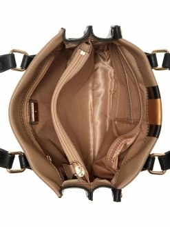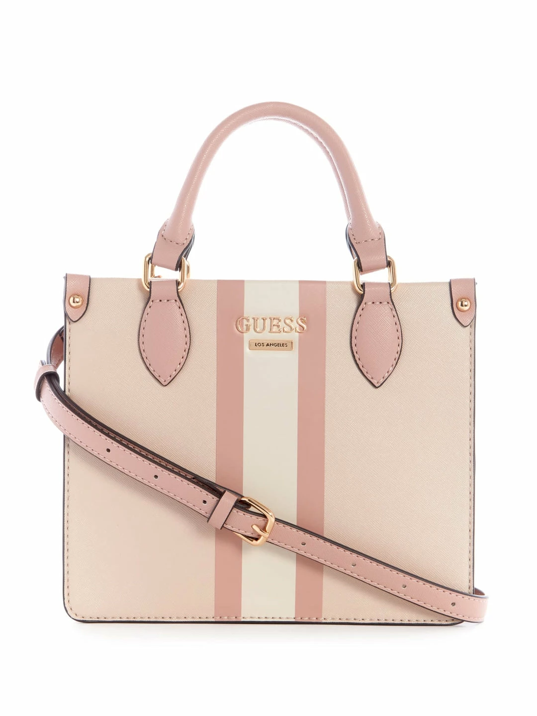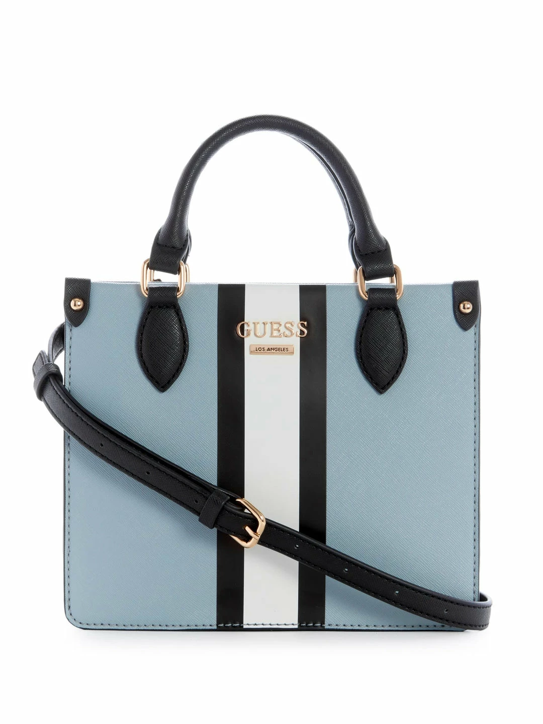 Make a statement with this mini satchel featuring a faux-leather construction, striped color-block design with logo, silver-tone hardware, internal organization, contrasting rolled top handles and adjustable straps.