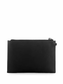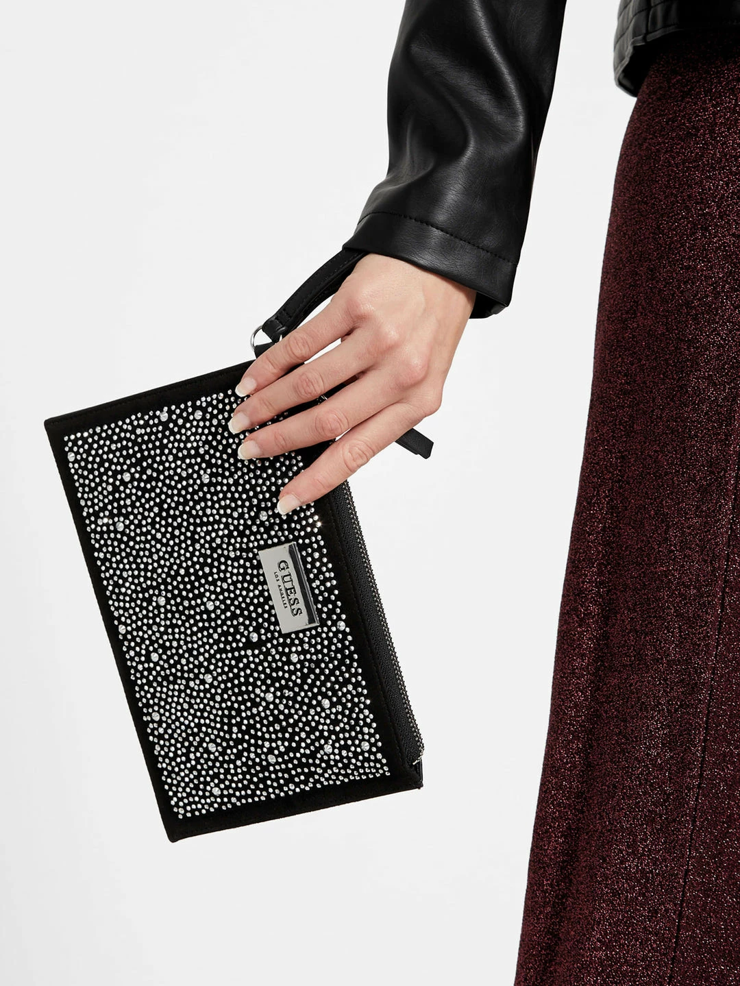 Glitter and glam, this faux-leather wristlet has lots of it. Complete with a rhinestone-encrusted front, zip-top closure and logo plaque.