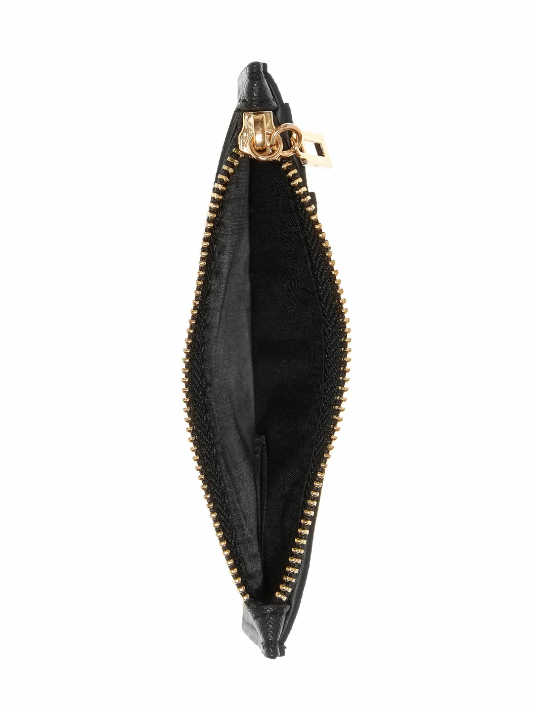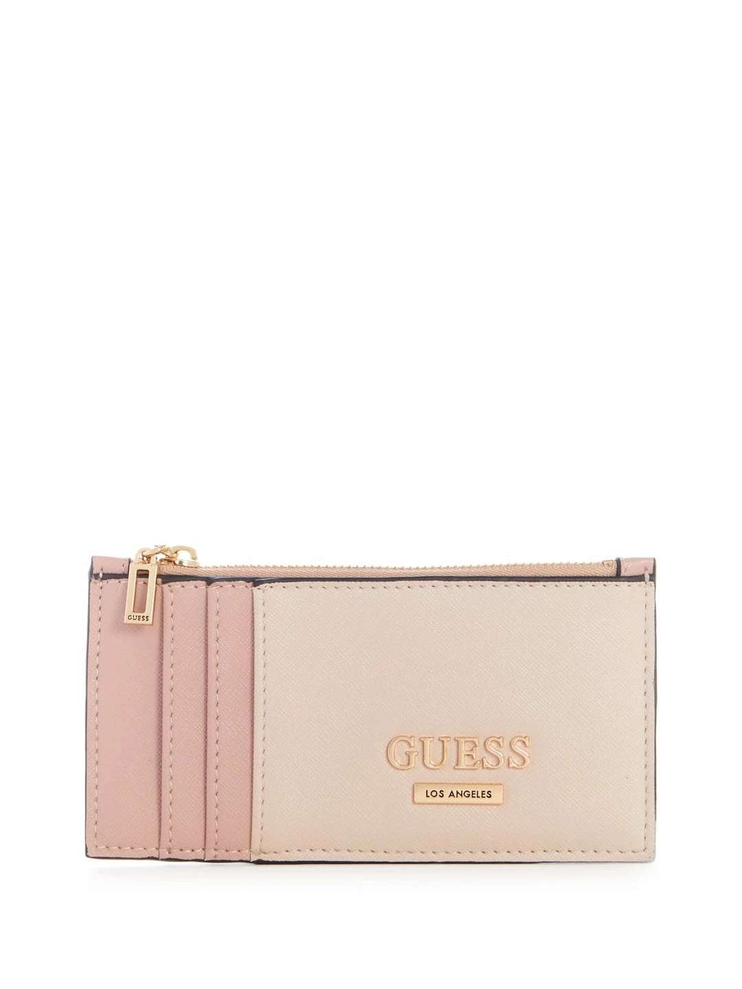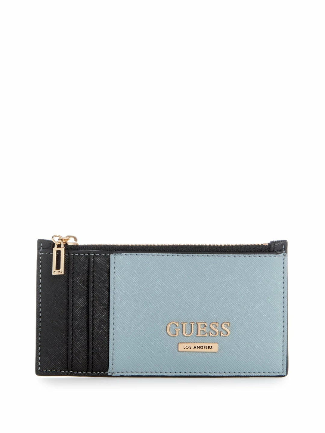 Sleek and easy to reach, this card holder features a color-block design, slim storage, gold-tone hardware, zip coin pocket and logo emblem.