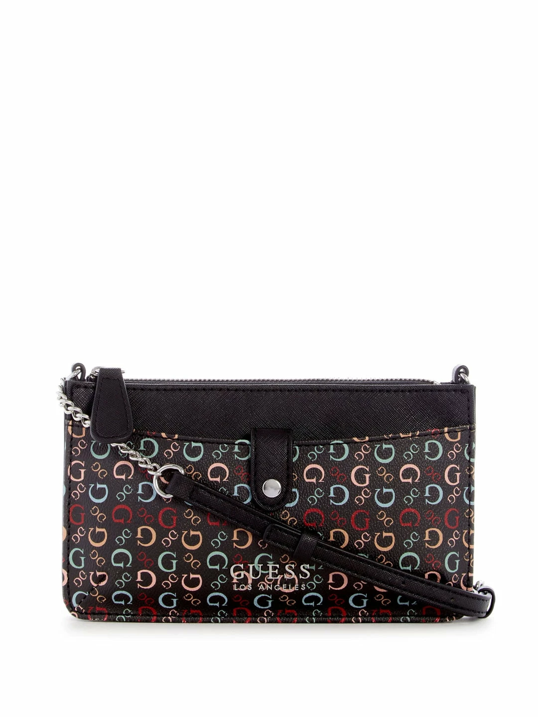 For evenings on the go. A coated-canvas crossbody bag featuring small and large colorful G logo prints, a front pocket with snap closure, front logo emblem, zip-top closure and a mixed media strap.