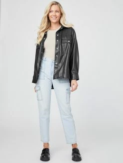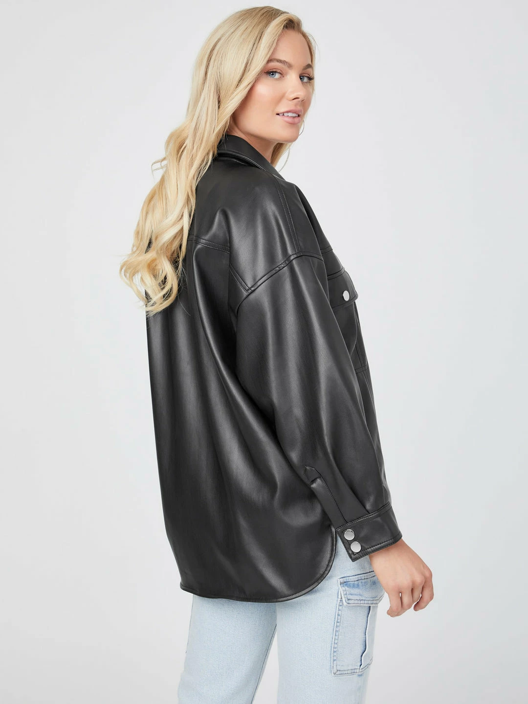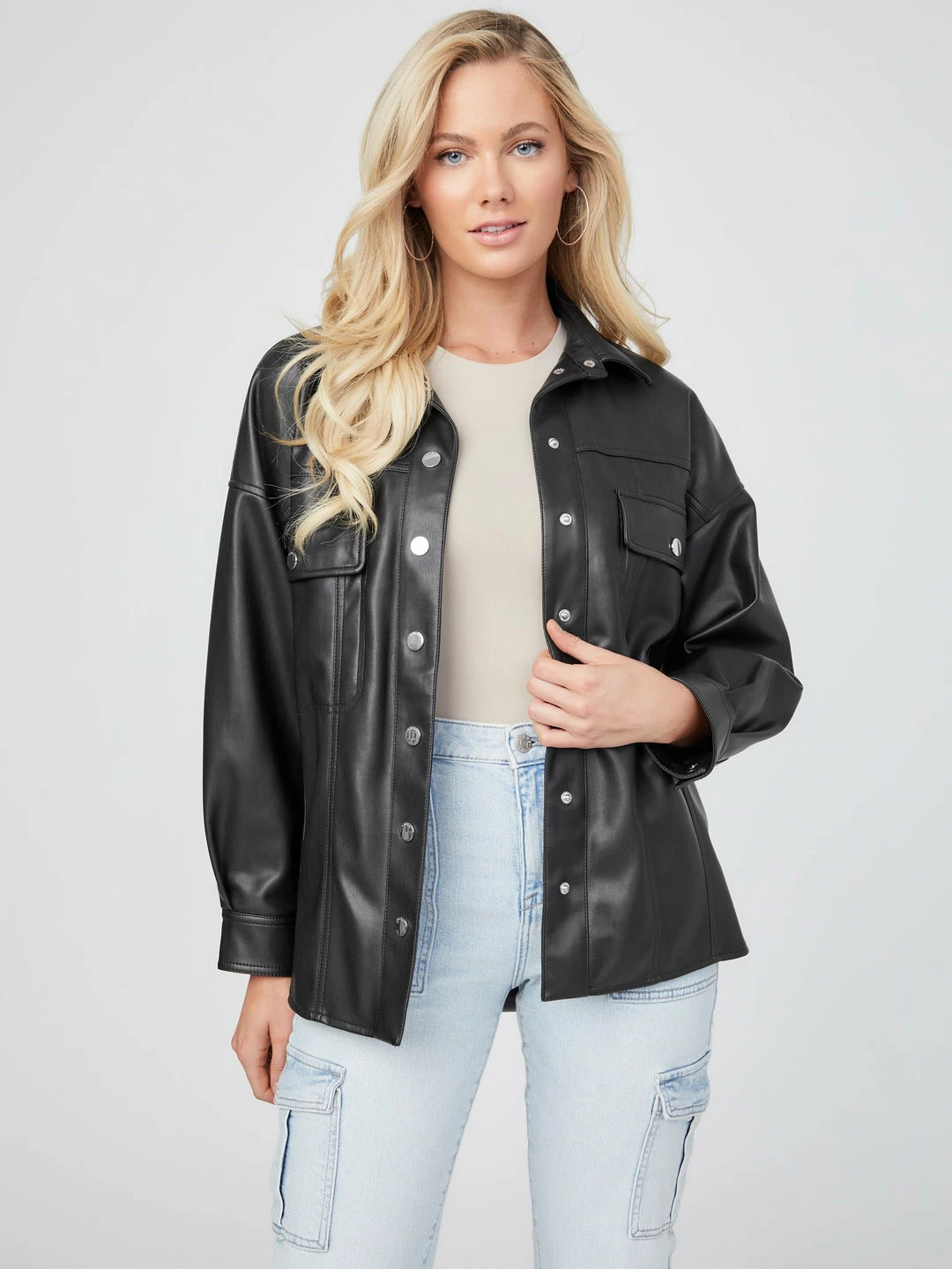 Reach for a modern edge. This faux-leather jacket is designed in a relaxed silhouette with dropped shoulders, folded collar and dual chest pockets. Front snap-button closures.