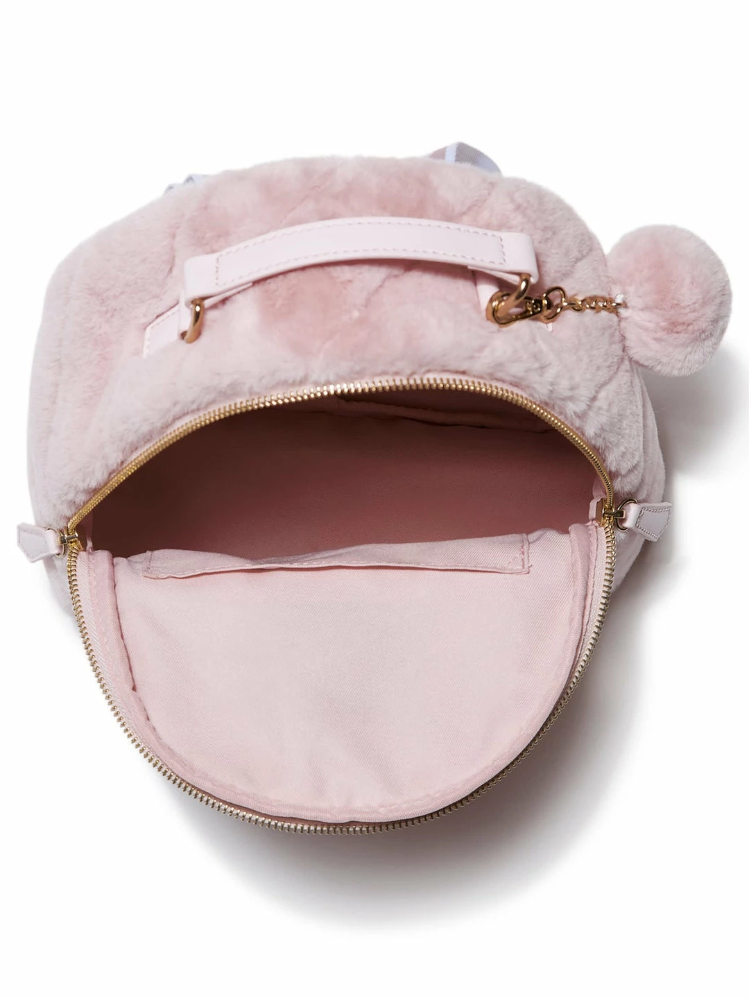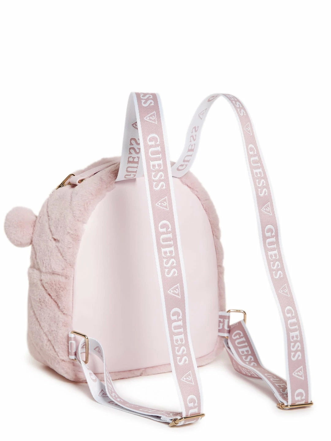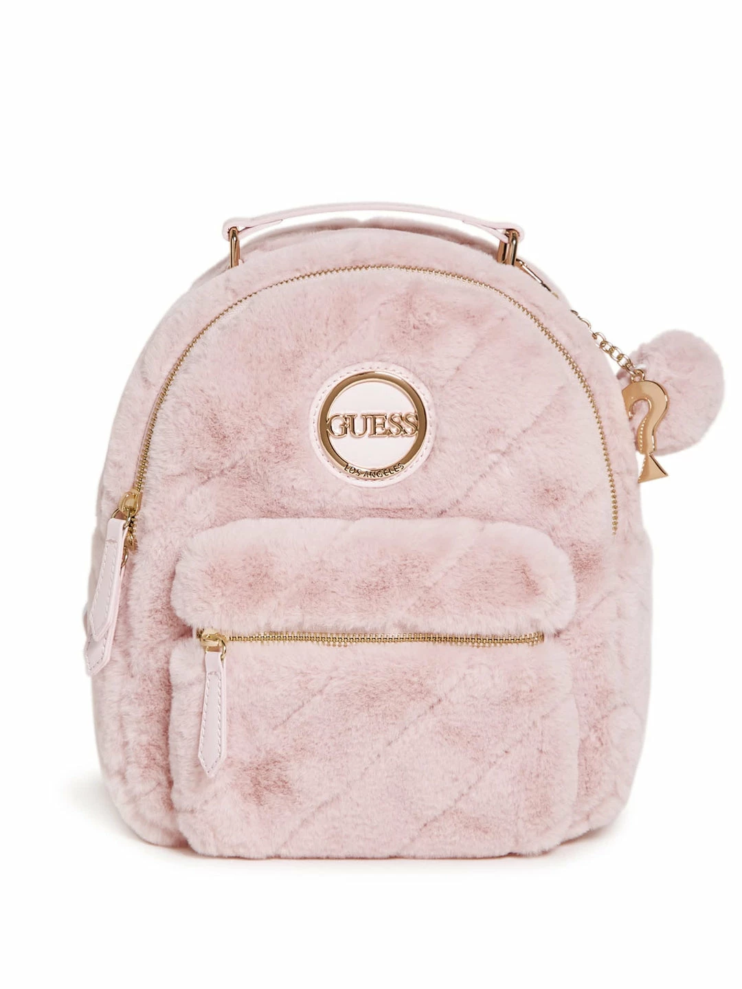 A lavish essential for your everyday comfort. This soft backpack is designed with a faux-fur fabrication, adjustable straps, main zip compartment, front zip pocket, detachable keychain and a round logo plaque.