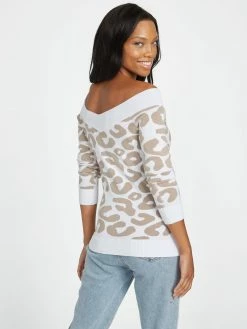 Fierce yet feminine, this sweater features a V-shape off-the-shoulder neckline with an allover animal print and thick ribbed trim. Contains recycled plastic.