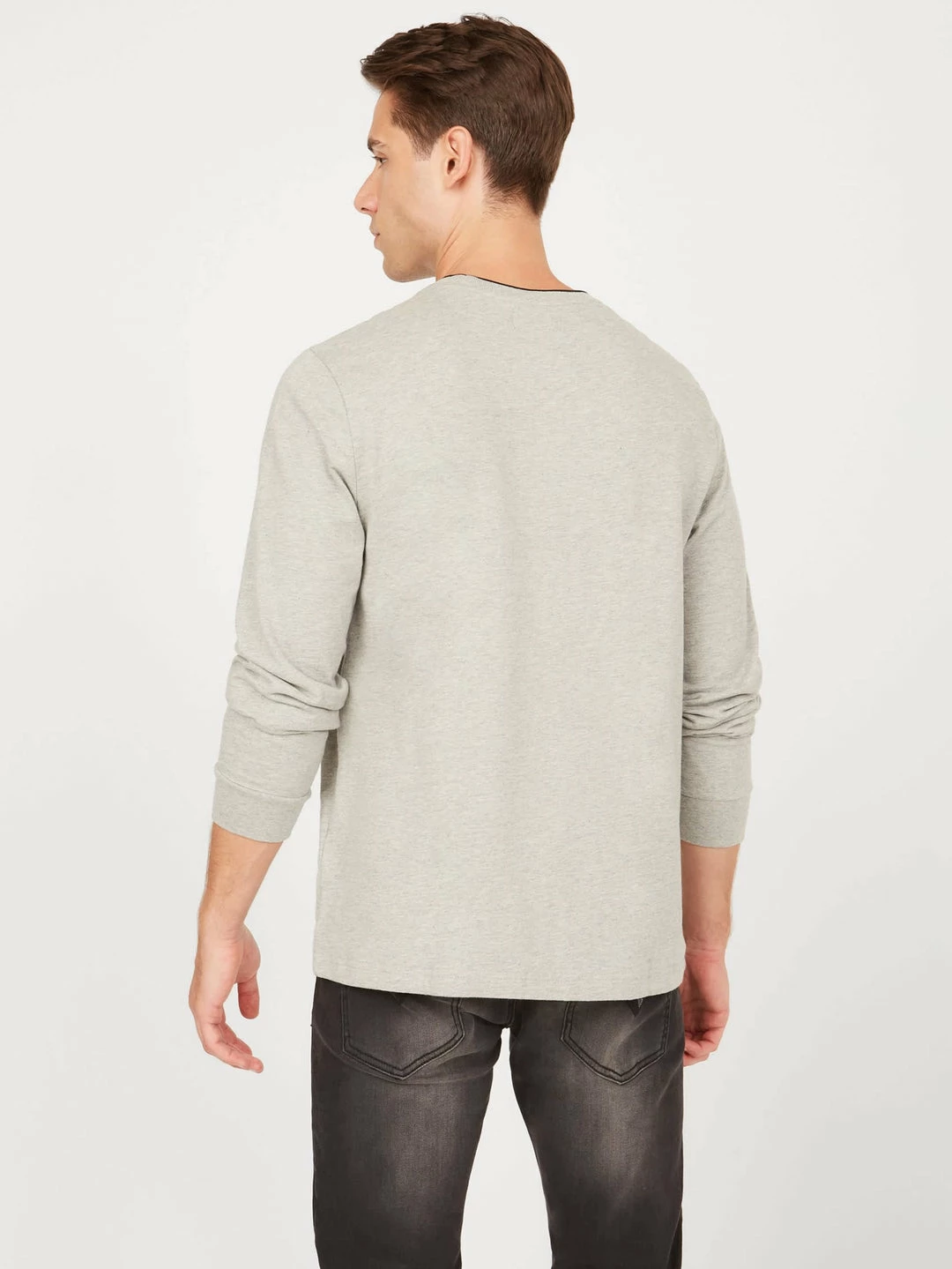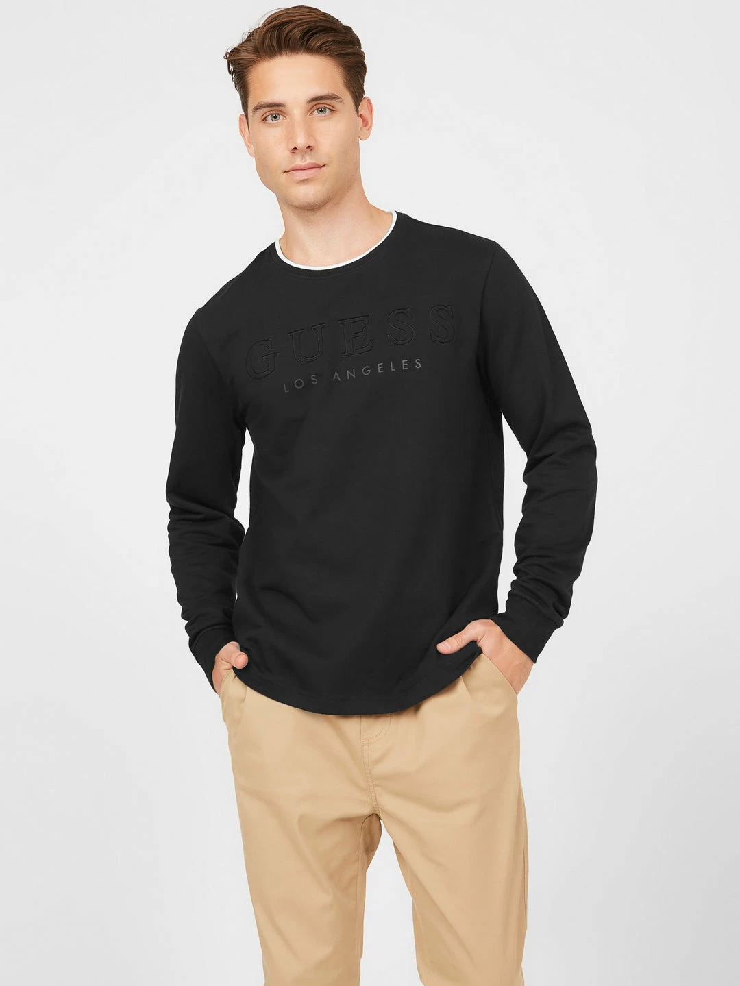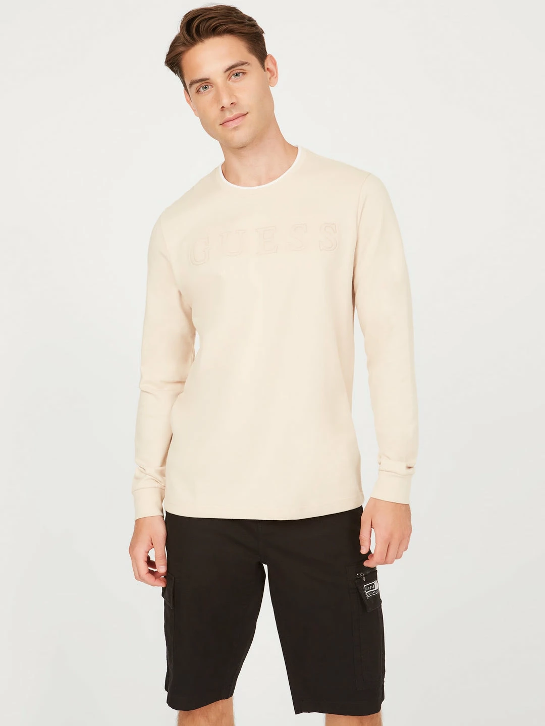 Take it easy in the long-sleeve tee featuring a crew neck with a layered look and subtle embossed logo at center.