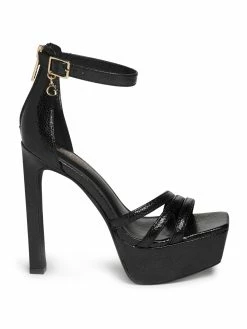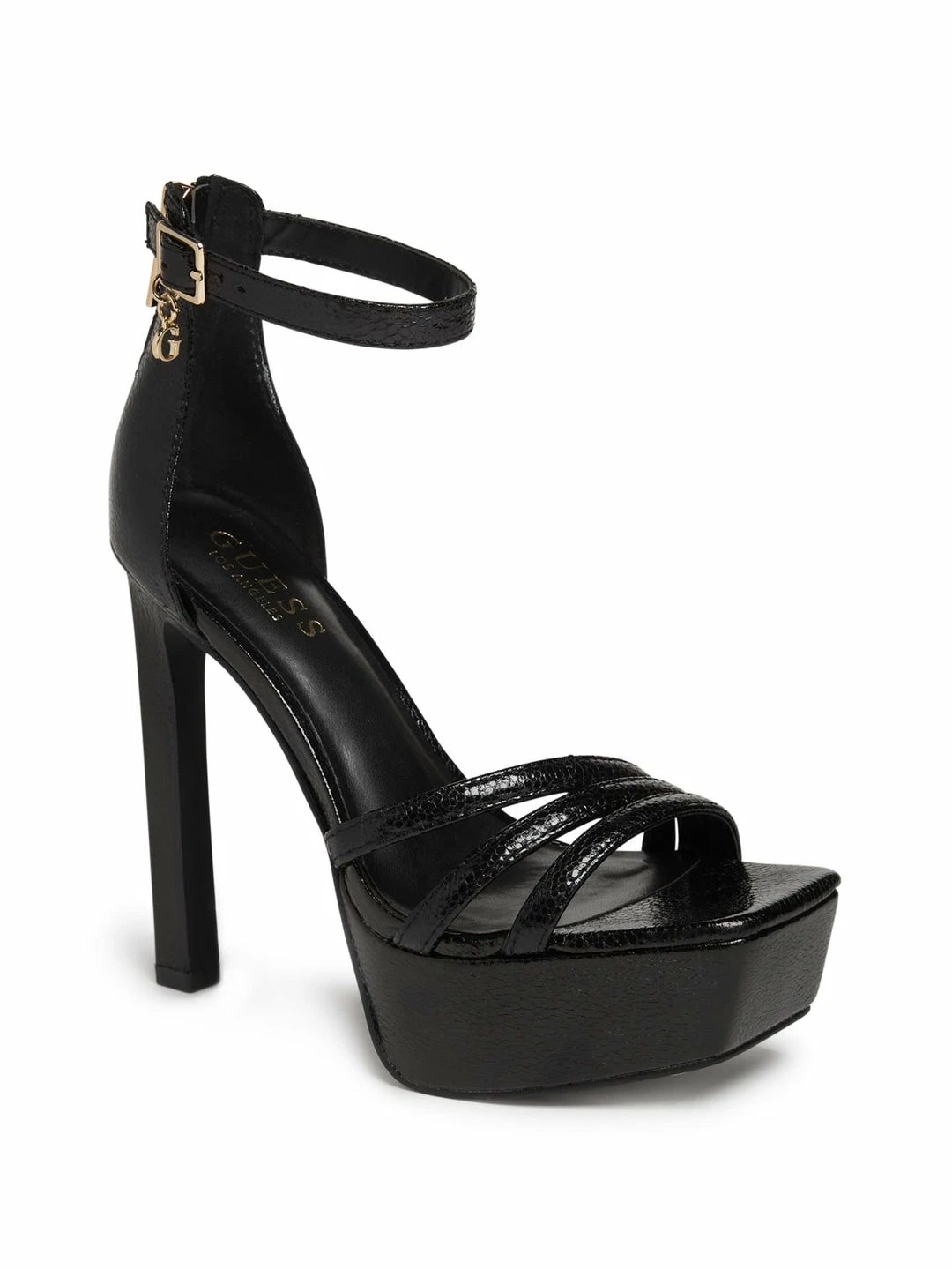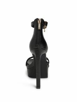 These textured, faux-leather platform heels will take your style to new heights. Featuring a squared open toe, strappy vamp, adjustable ankle strap with a logo charm and slim heel. Back zipper.
