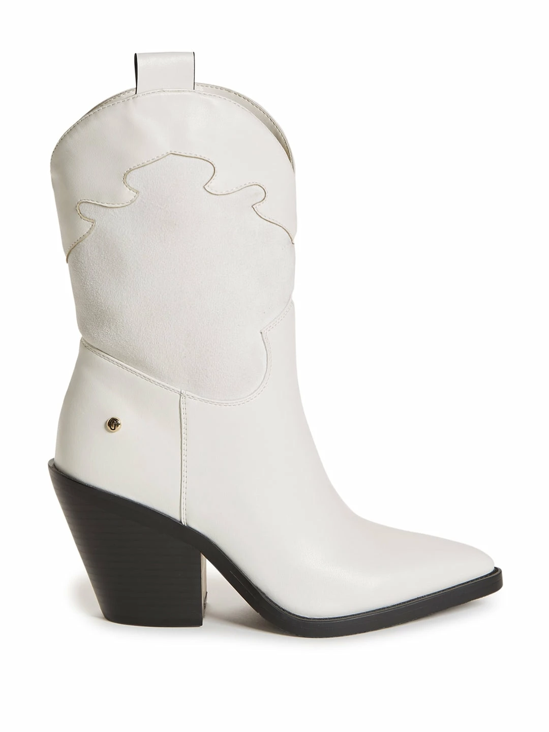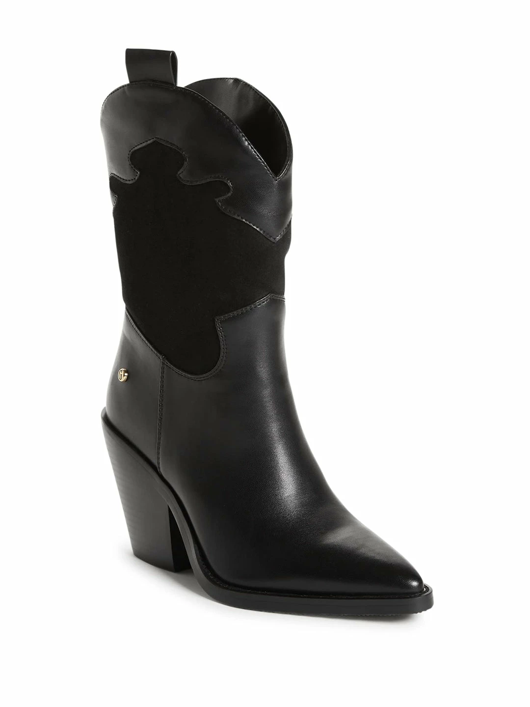 For your next trip out West, a pair of cowgirl-inspired boots in faux-leather that feature a faux-suede panel, pull straps, a pointed toe, stacked heel and side zipper.