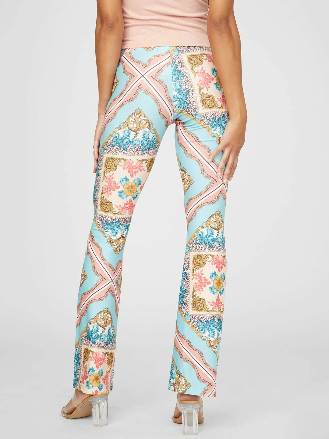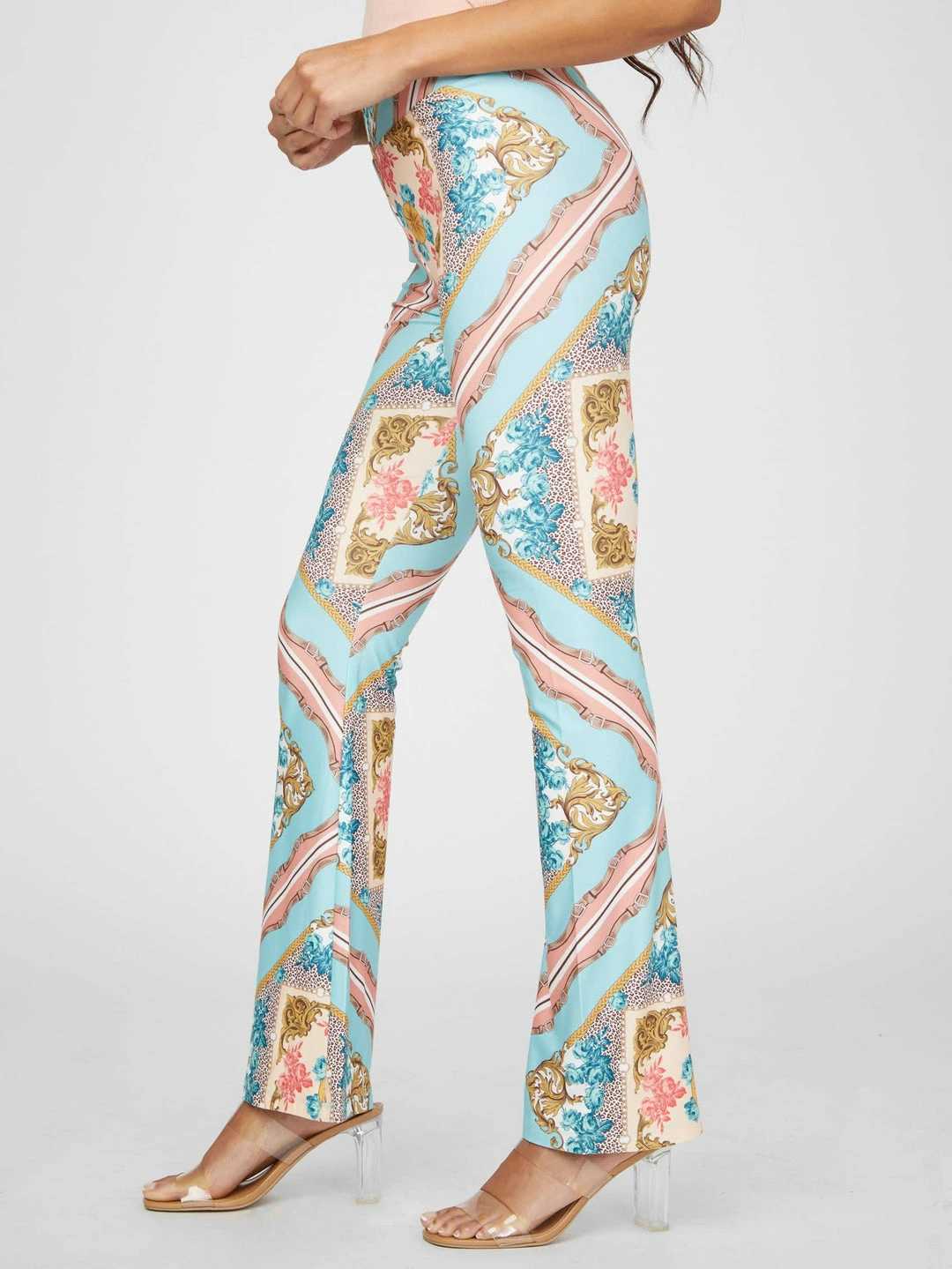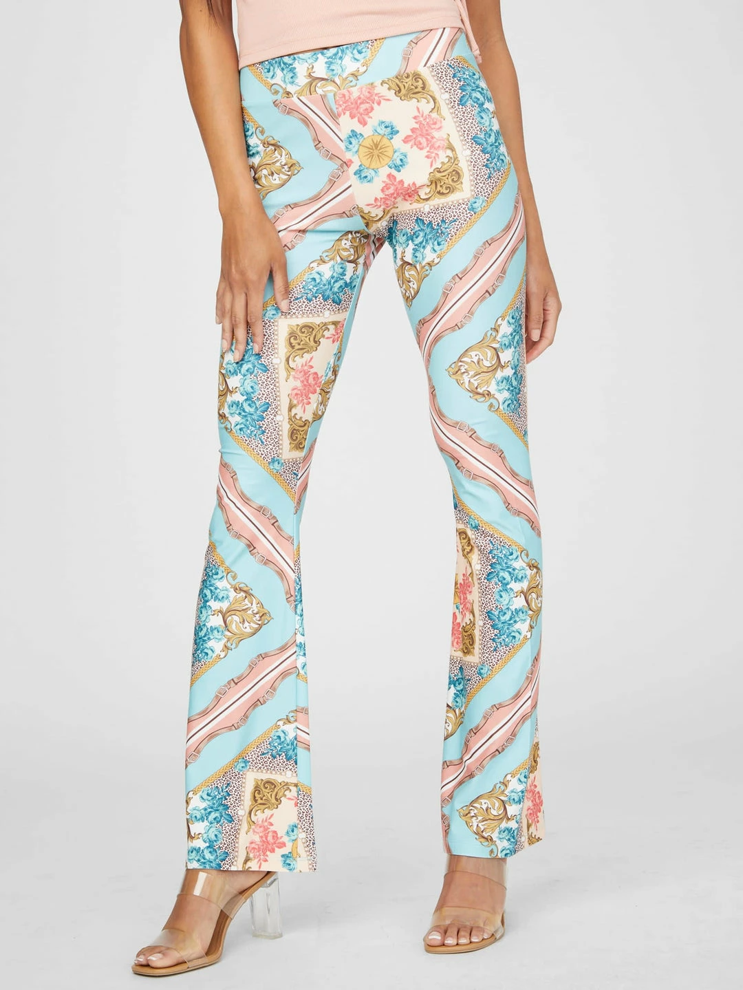 Give your look a glam flair with these knit pants featuring an allover brocade print, high-rise waist and flared leg.