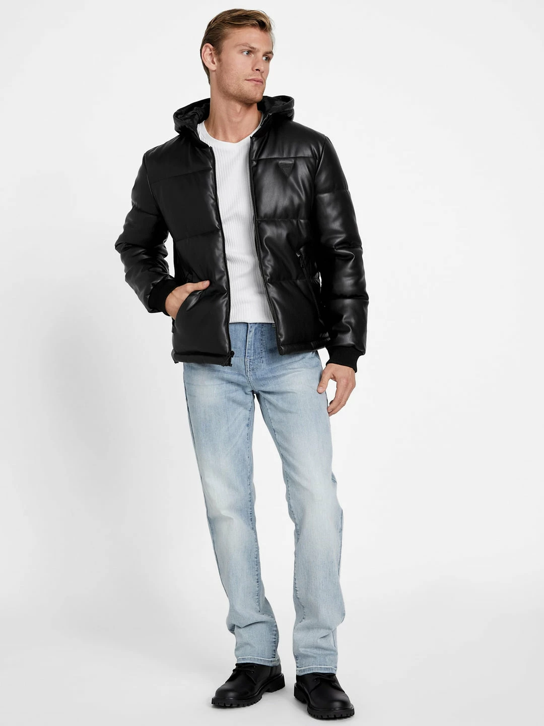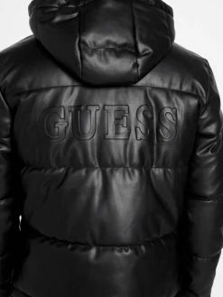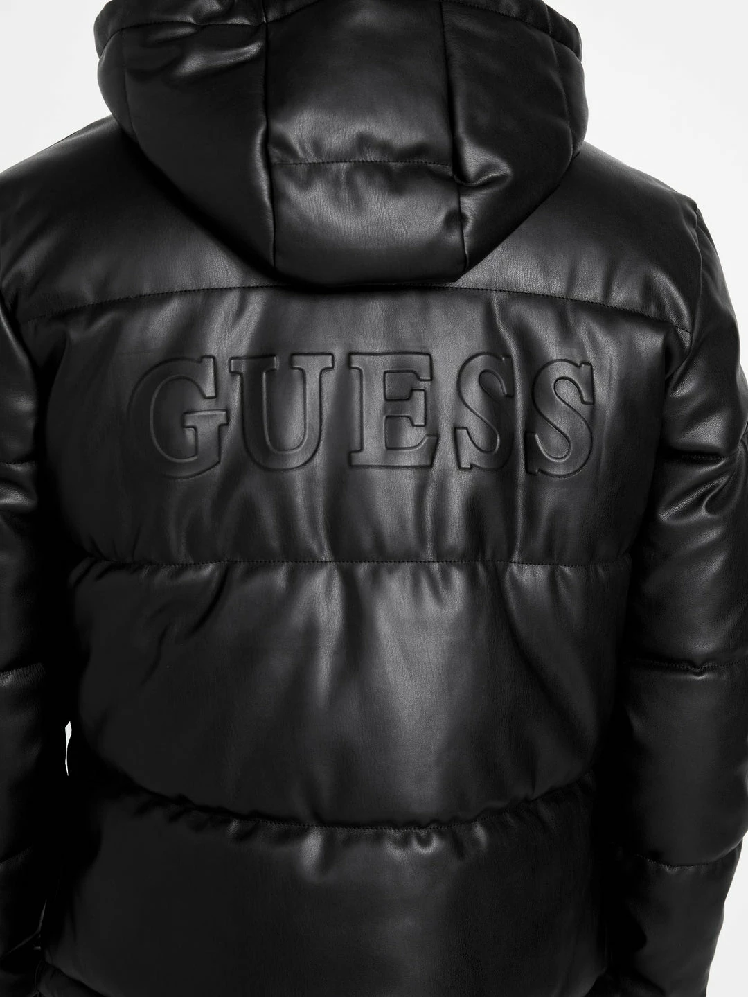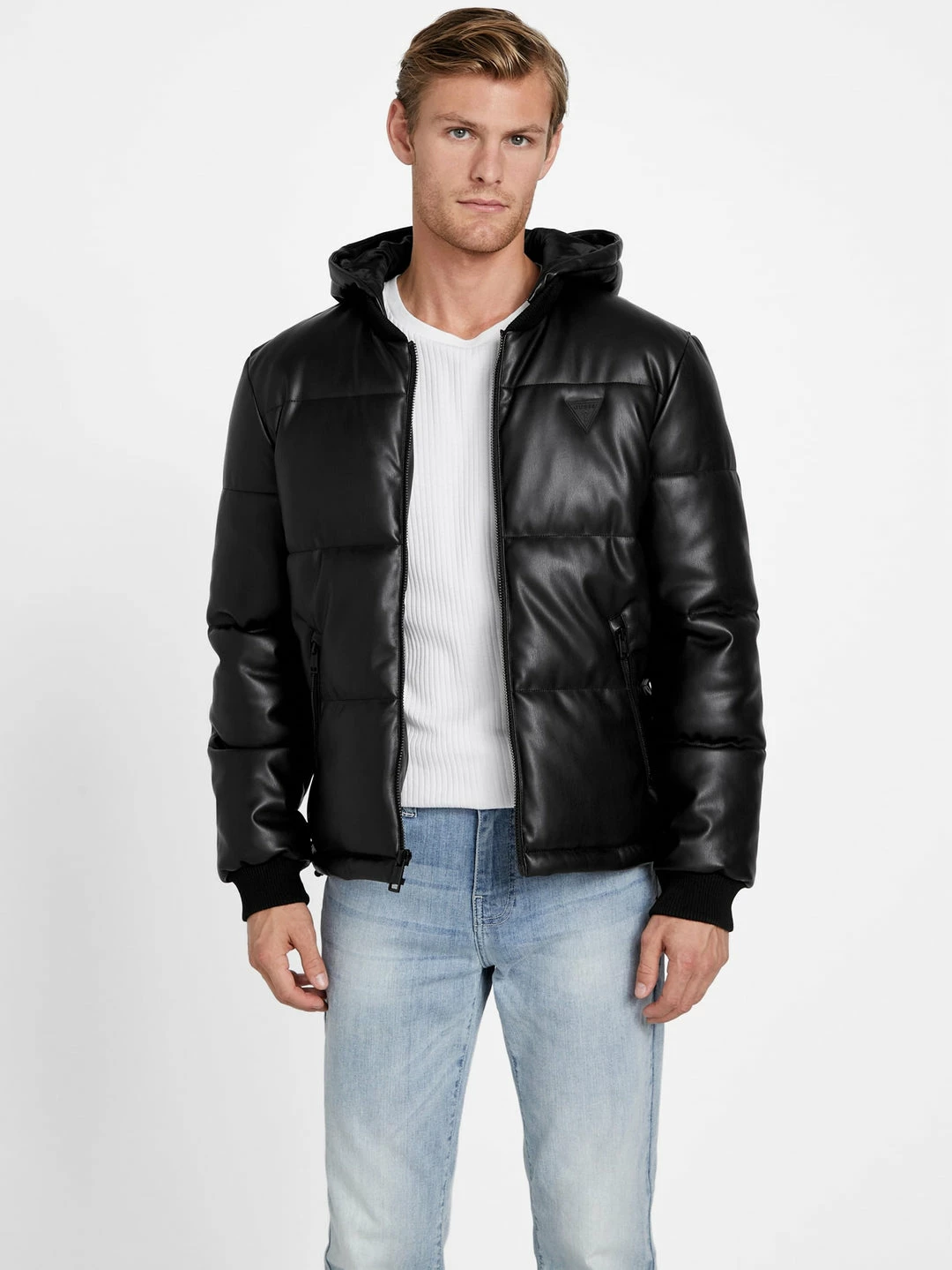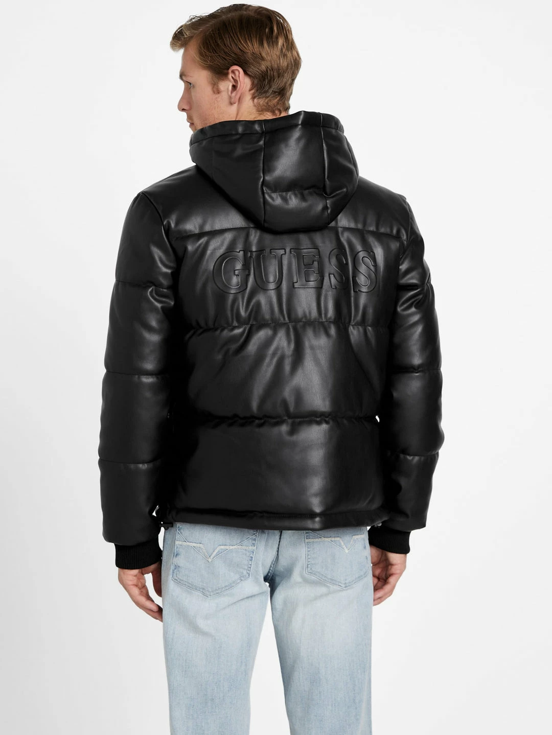 Elevate the warmth in this hooded faux-leather jacket. Designed with a sleek padded construction, logo patch at the front, large embossed logo at the back, ribbed trim and front zip closure.
