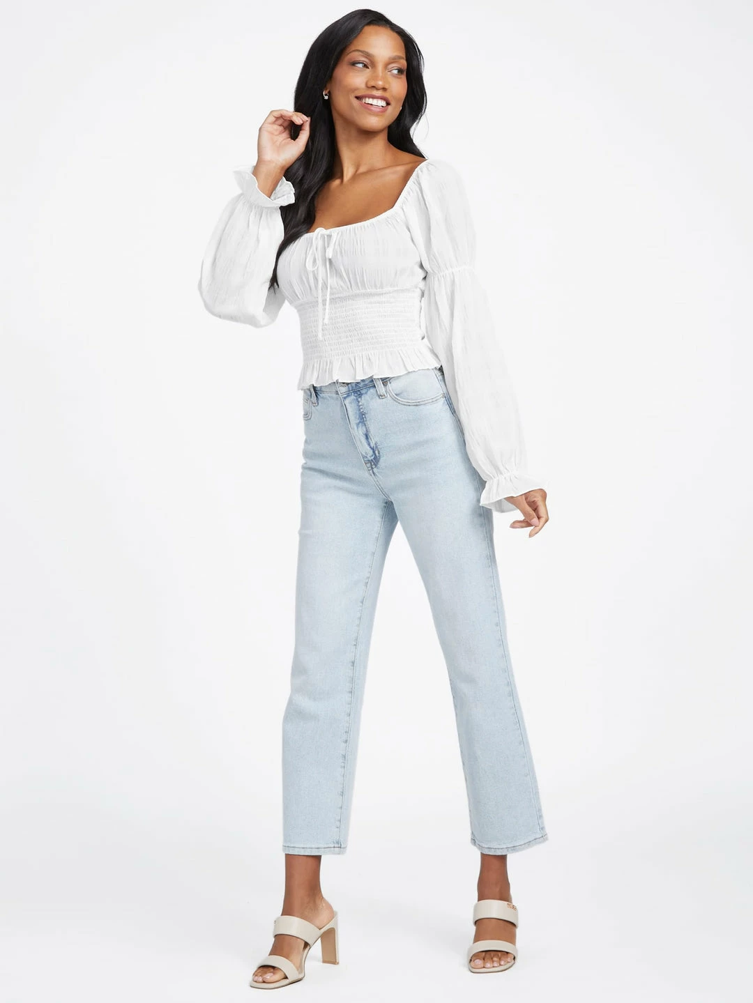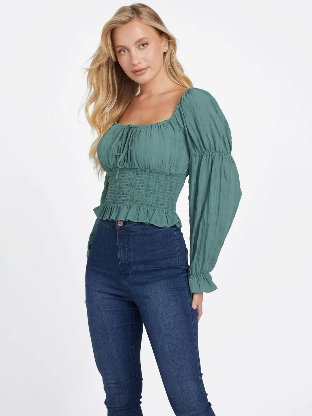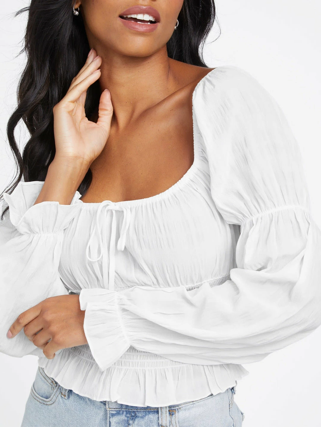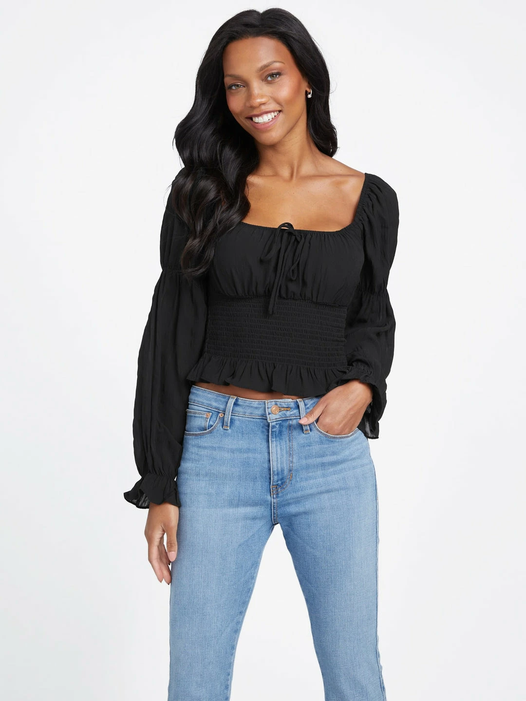 A feminine favorite, this airy top features a square neckline with center tie detail, puffed long sleeves with elastic piecing and a smocked waist with flirty ruffled bottom hem.