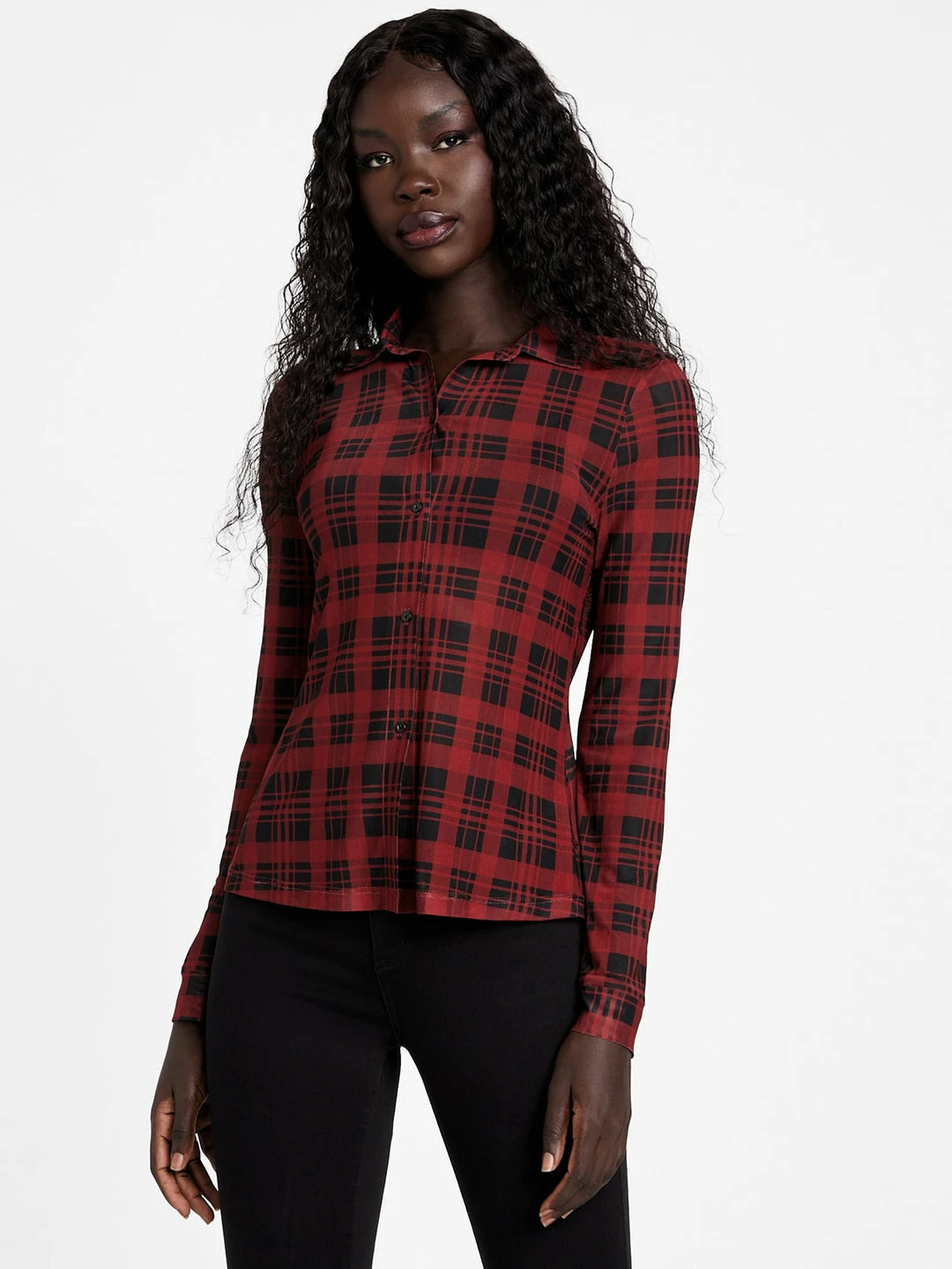 Made in a slightly sheer stretch fabrication, this long-sleeve top features a folded collar and front button closures.