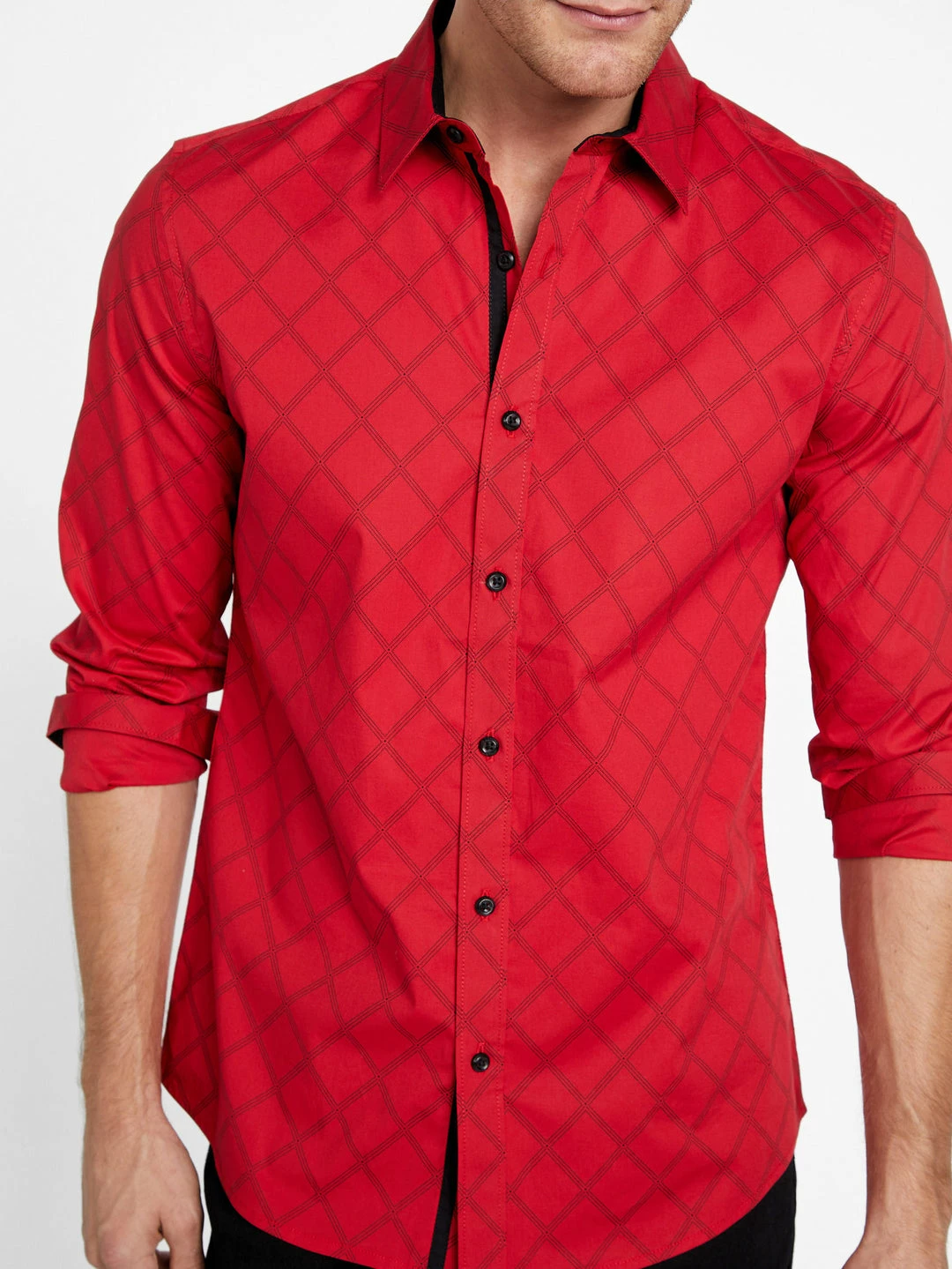 Stand out in this geometric shirt, designed with allover geometric diamond print, folded collar, long sleeves and button-front closure.